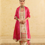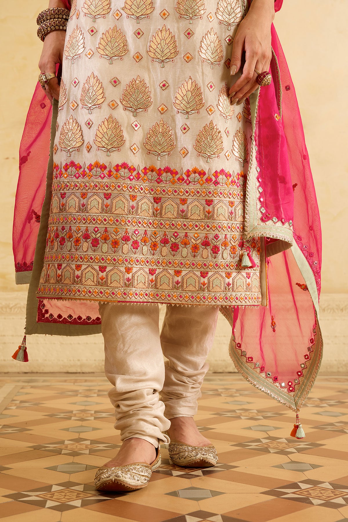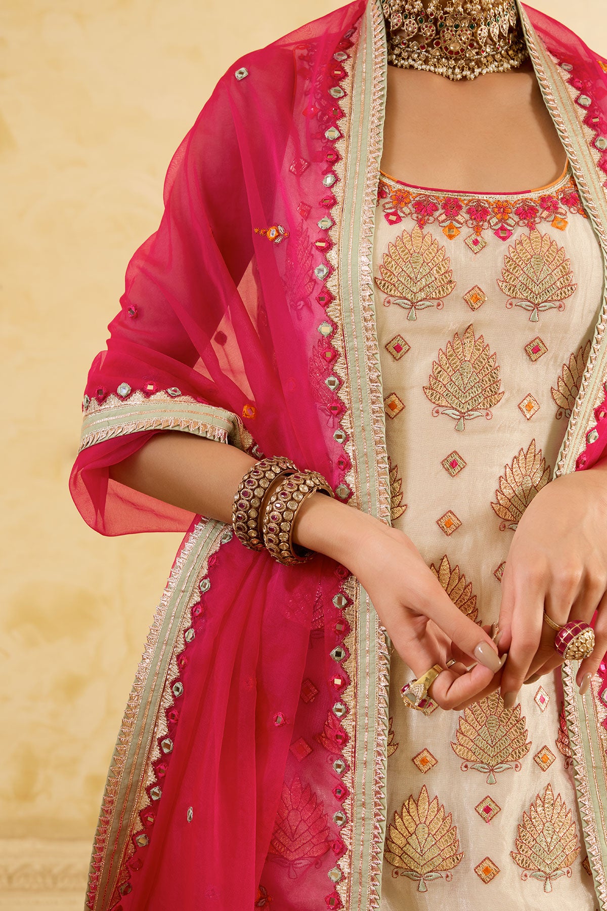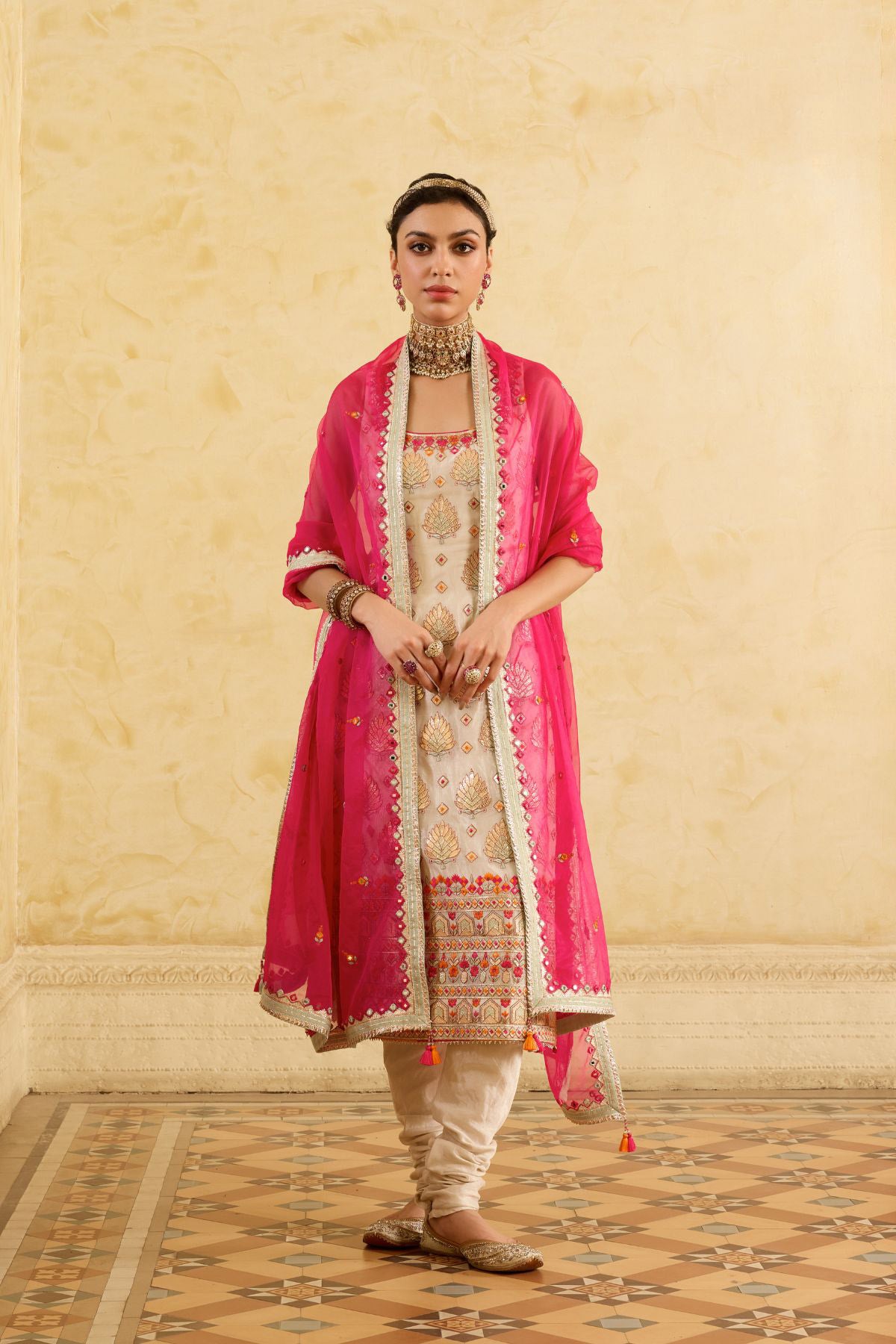 This luxurious silk tissue churidar set showcases impeccable craftsmanship with intricate gota, mirror work, and Phulkari. Adorned with motifs in vibrant rani pink and orange, it creates a striking contrast against the rich fabric, celebrating traditional artistry in a modern silhouette.