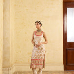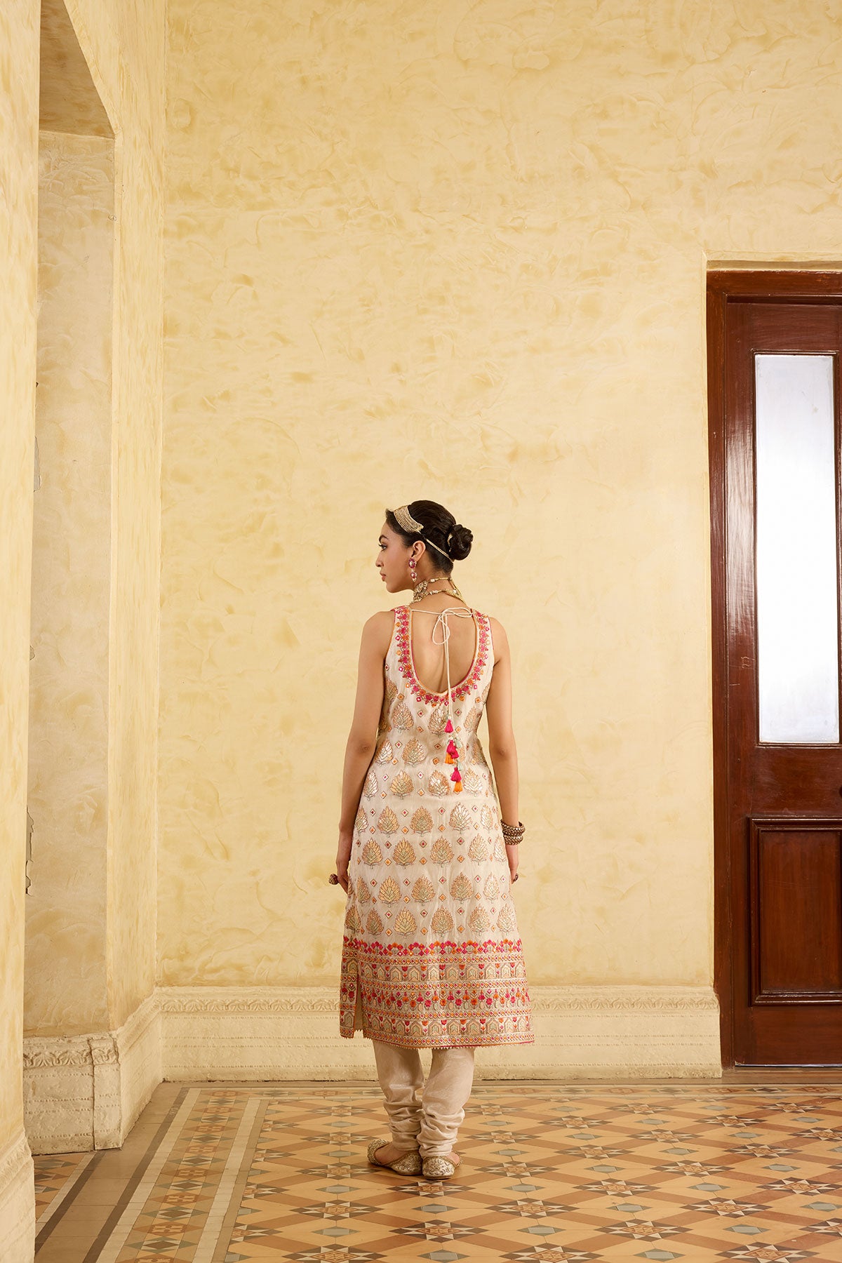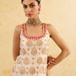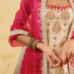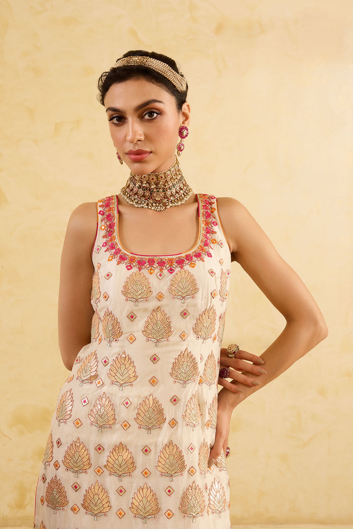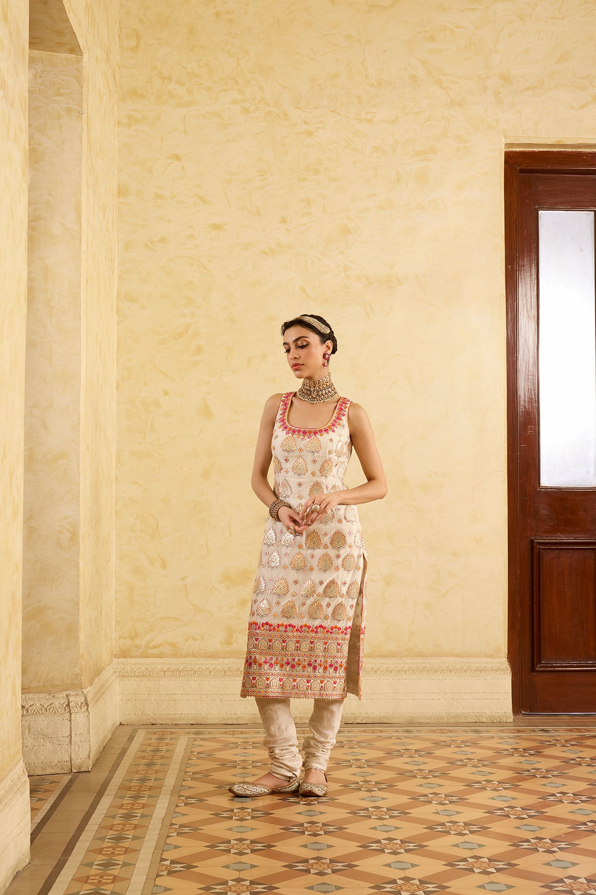 This luxurious silk tissue churidar set showcases impeccable craftsmanship with intricate gota, mirror work, and Phulkari. Adorned with motifs in vibrant rani pink and orange, it creates a striking contrast against the rich fabric, celebrating traditional artistry in a modern silhouette.