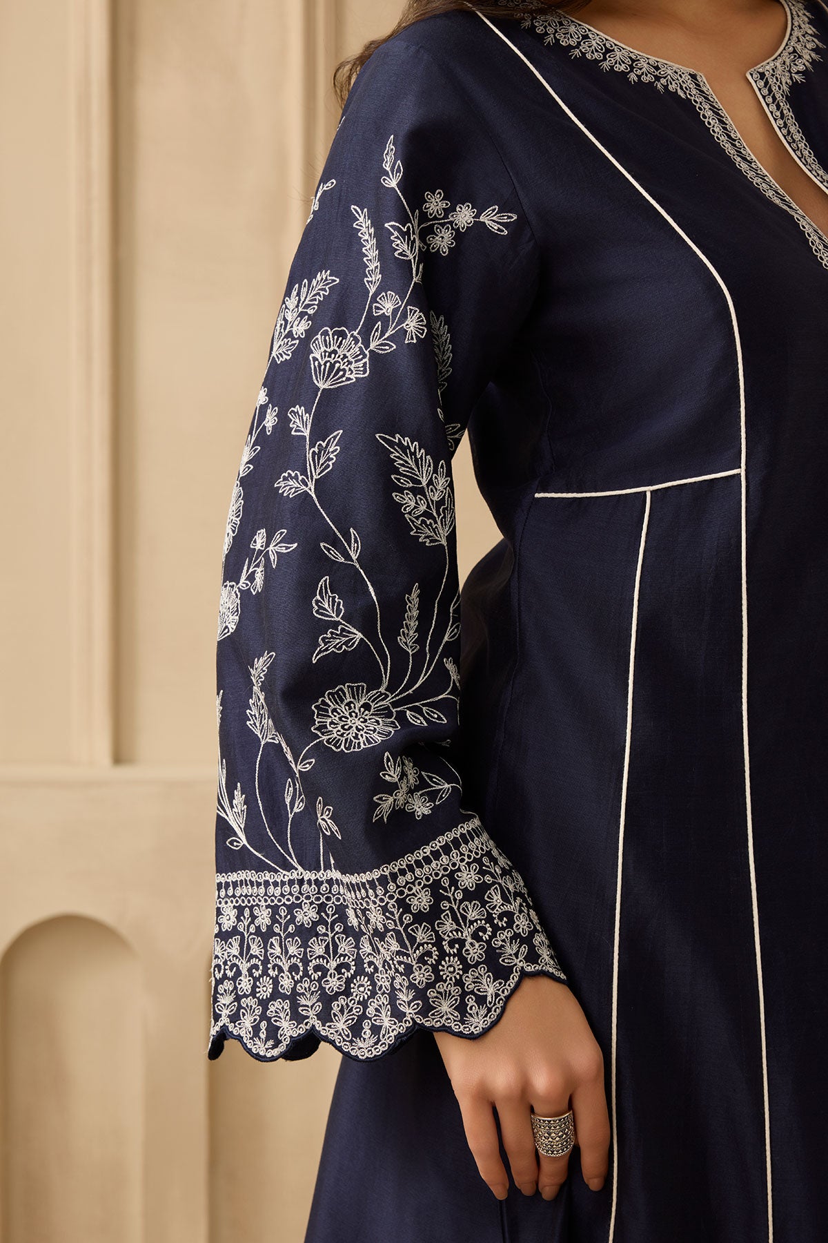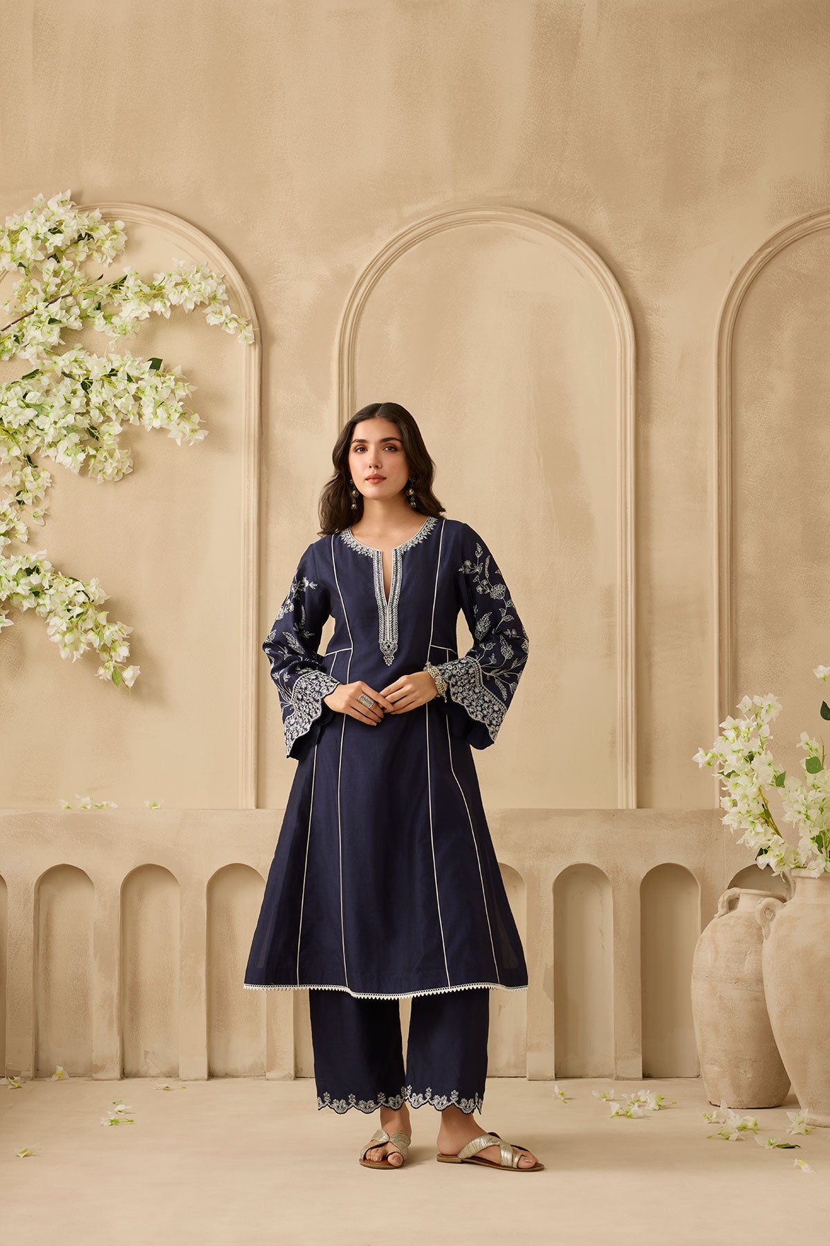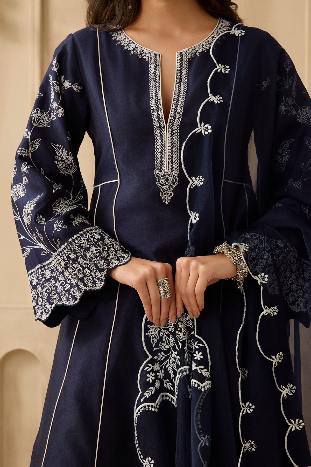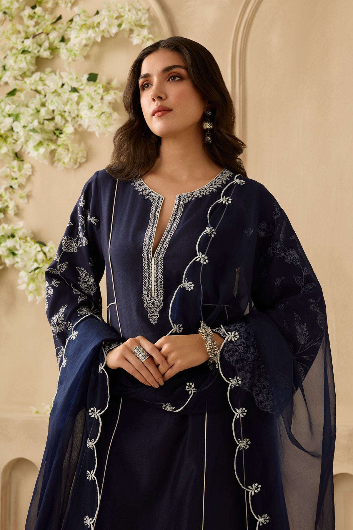 Our navy blue silk chanderi kurta set is equal parts feminine yet avant garde. The A-line kurta features flared bell sleeves with intricate floral threadwork while the palazzos are kept simple with elegant cutwork. Complete the look with a sheer organza dupatta that is scalloped in a beautiful floral pattern.