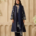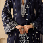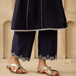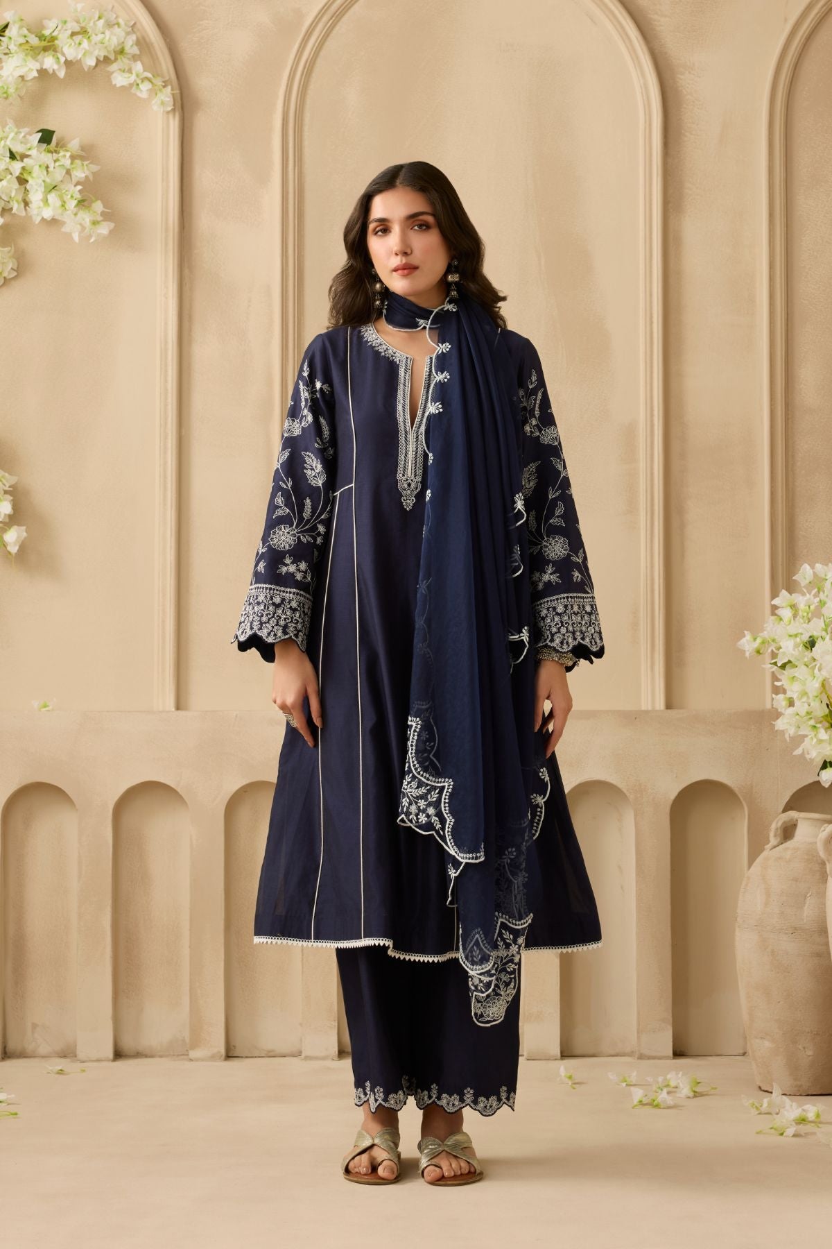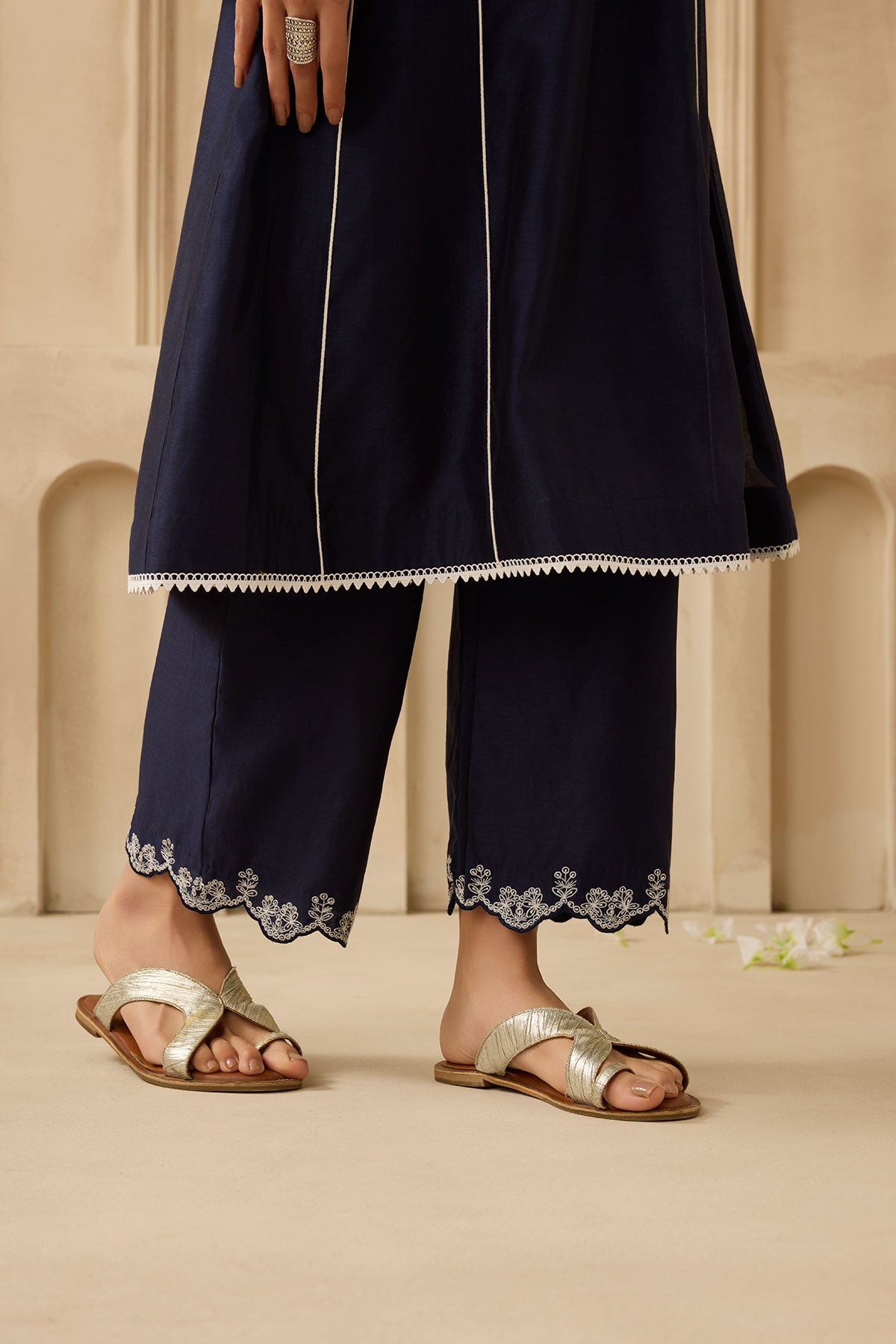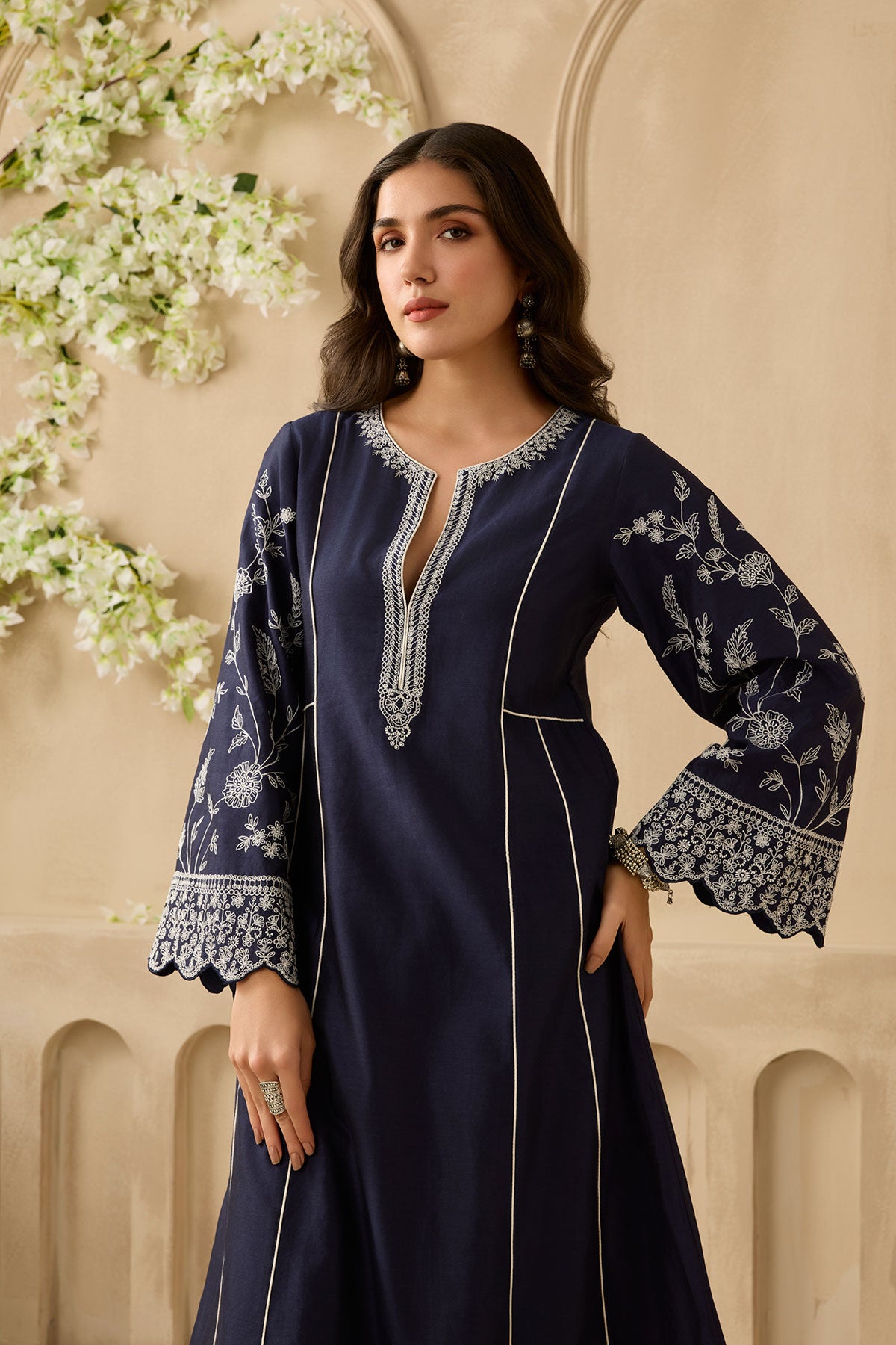 Our navy blue silk chanderi kurta set is equal parts feminine yet avant garde. The A-line kurta features flared bell sleeves with intricate floral threadwork while the palazzos are kept simple with elegant cutwork. Complete the look with a sheer organza dupatta that is scalloped in a beautiful floral pattern.