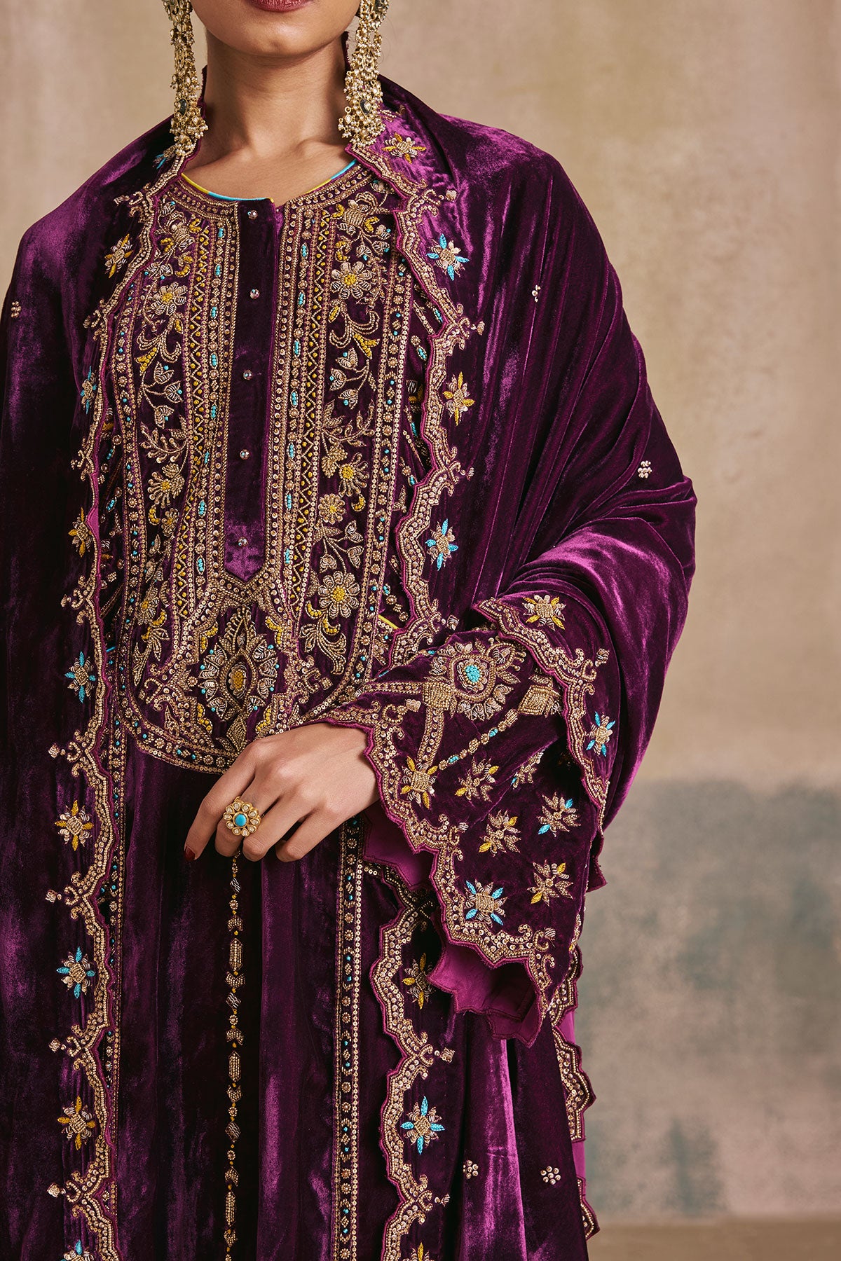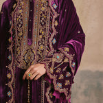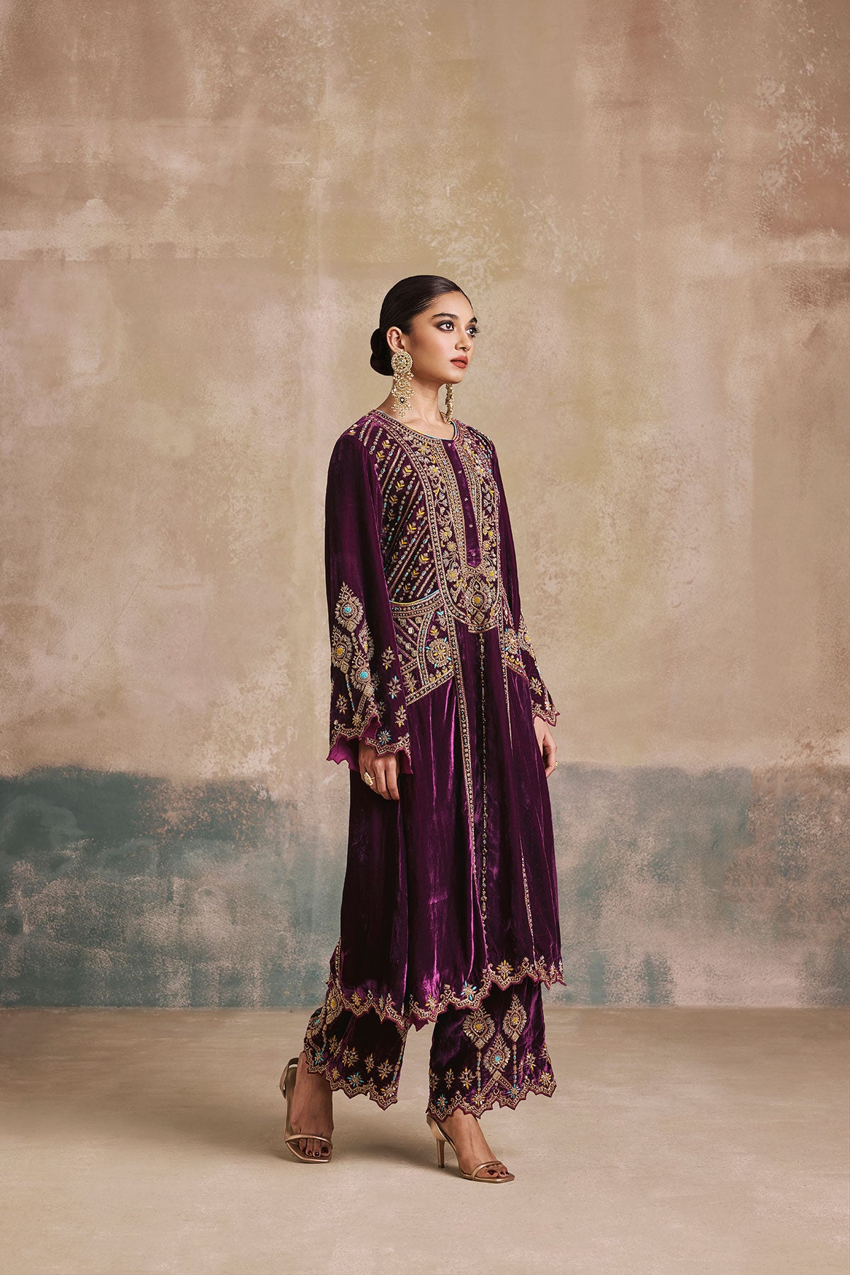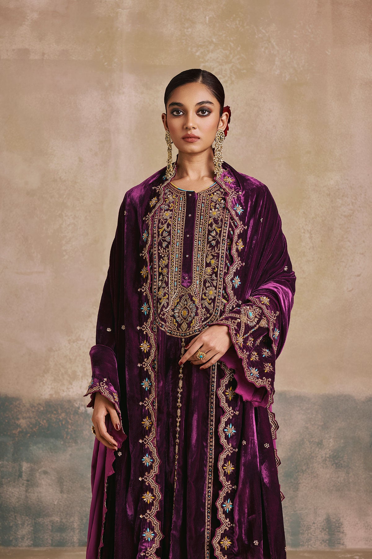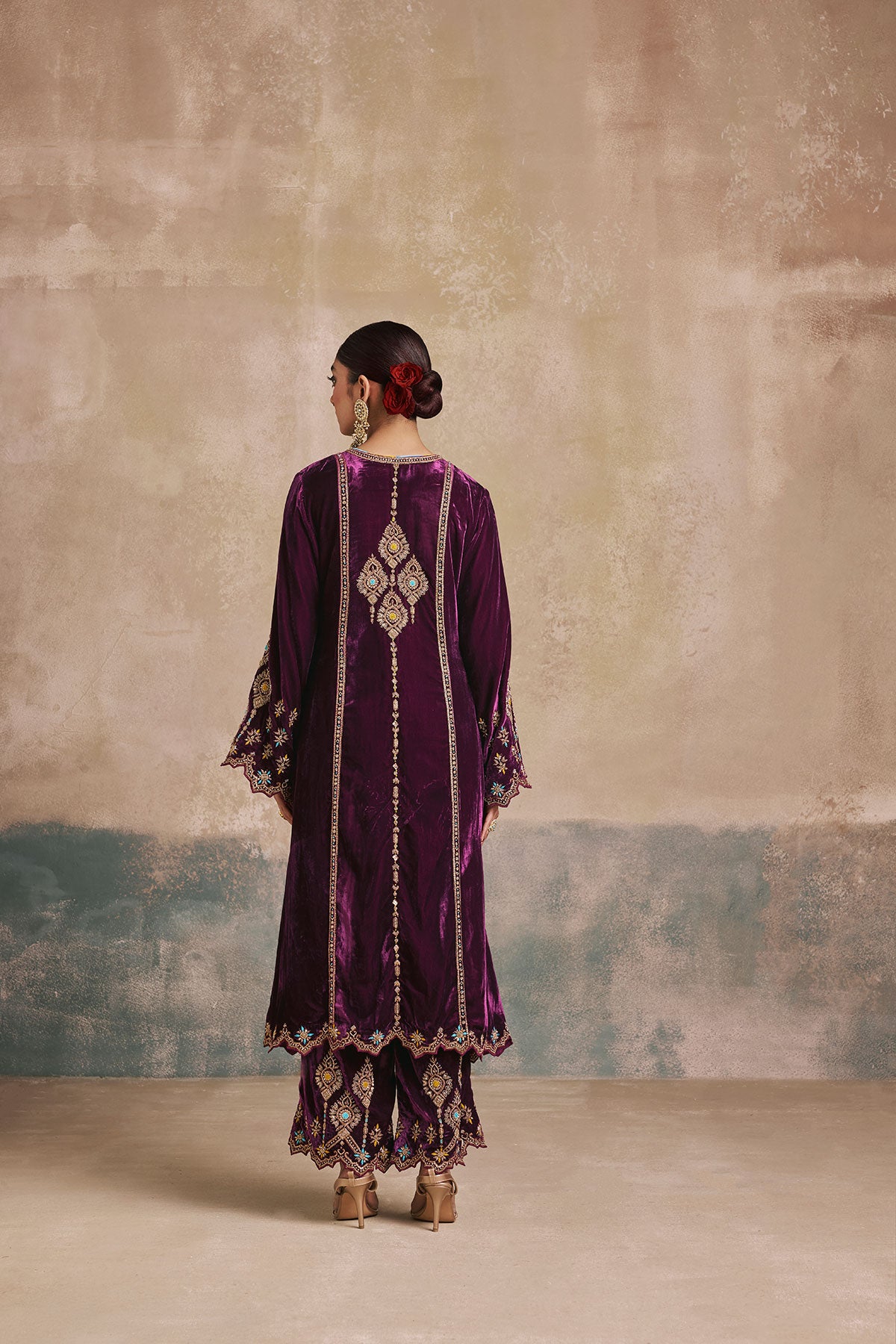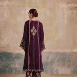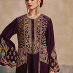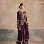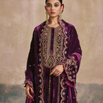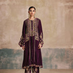 The Falaknuma Kurta Set is a celebration of opulence—rich plum silk velvet, ornate embroidery, and a silhouette that commands attention. Styled with a matching potli, this is heritage luxury at its finest.