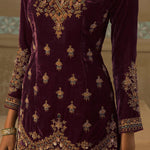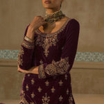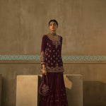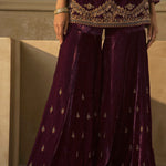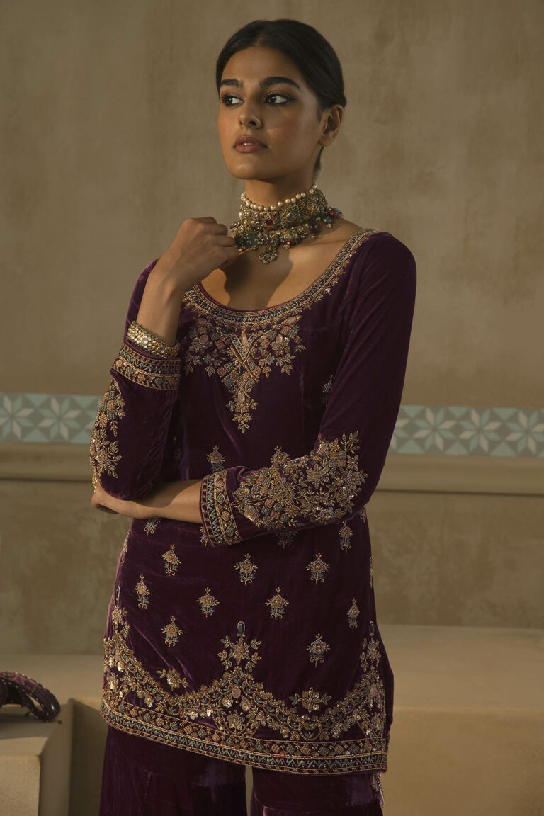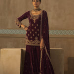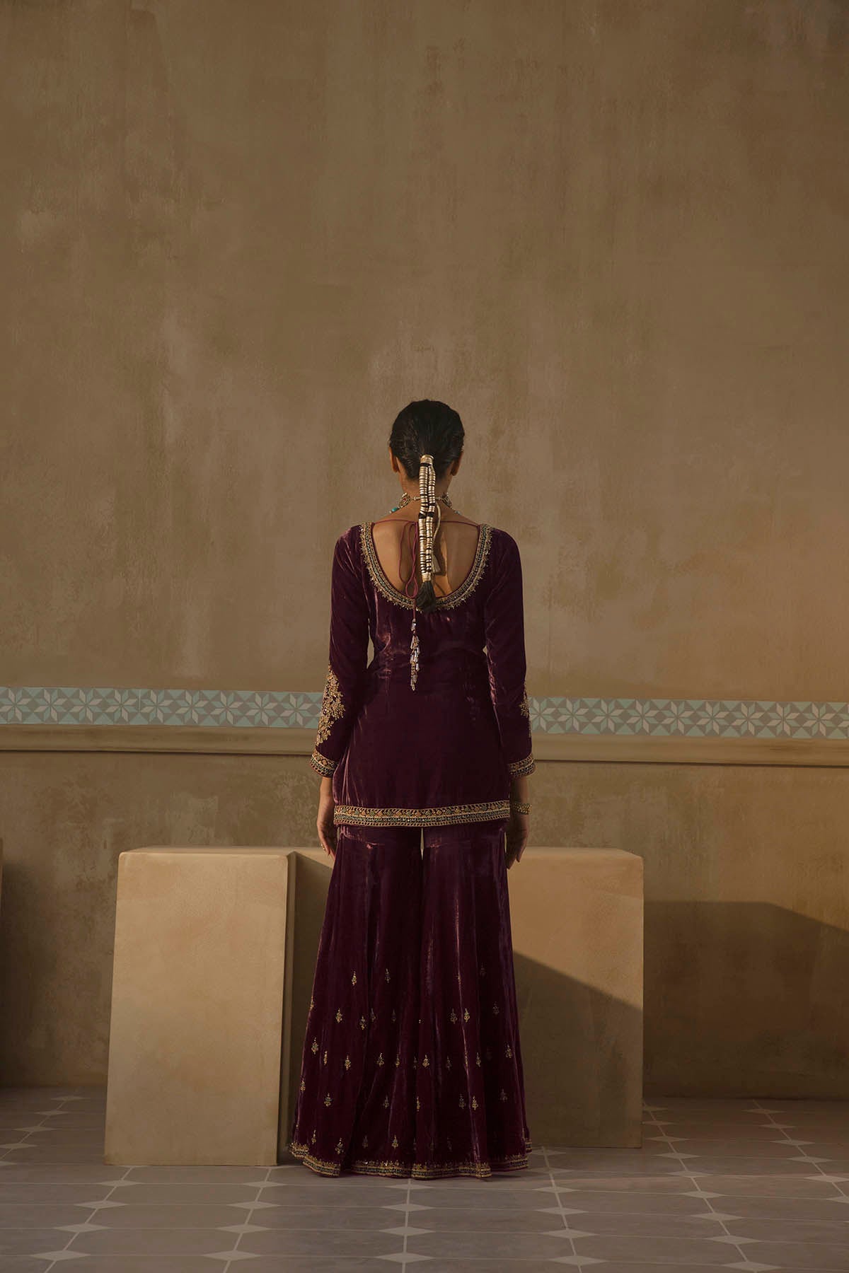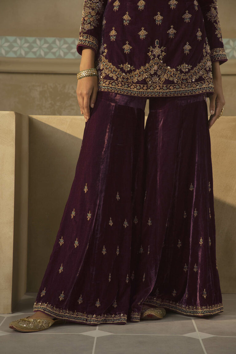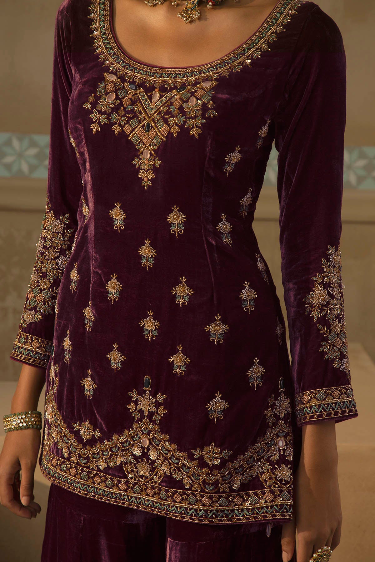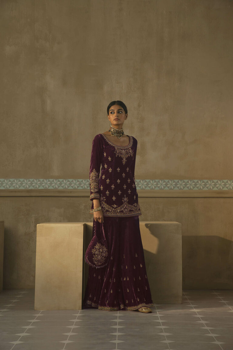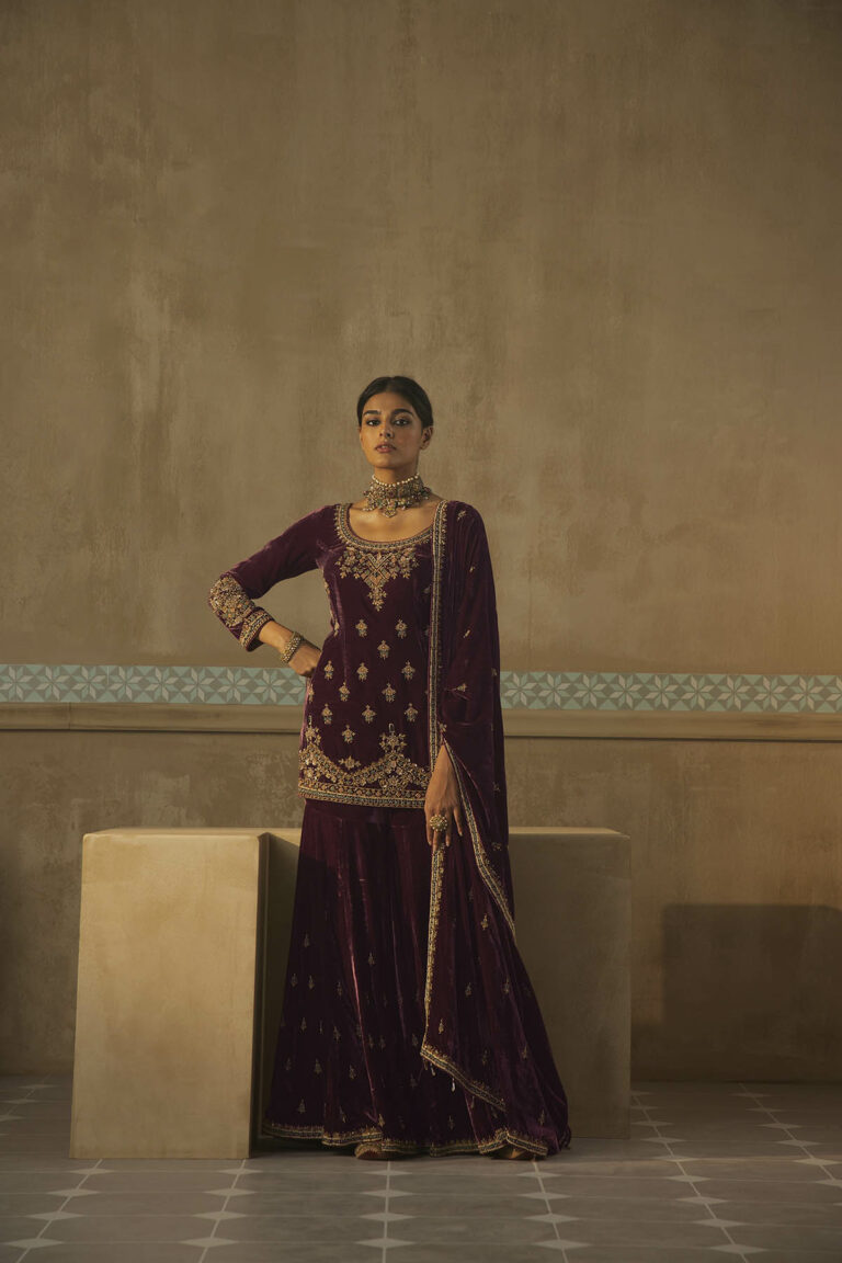A velvet masterpiece — the perfectly embellished fitted short kurta is paired with a voluminous wine gharara. A mix of aari and zardozi antique threadwork coupled with sitara and cutdana embellishment work as the perfect base for the semi-coloured precious stones to shine right through. Add sophistication to this look with our decadent silk velvet embroidered dupatta.