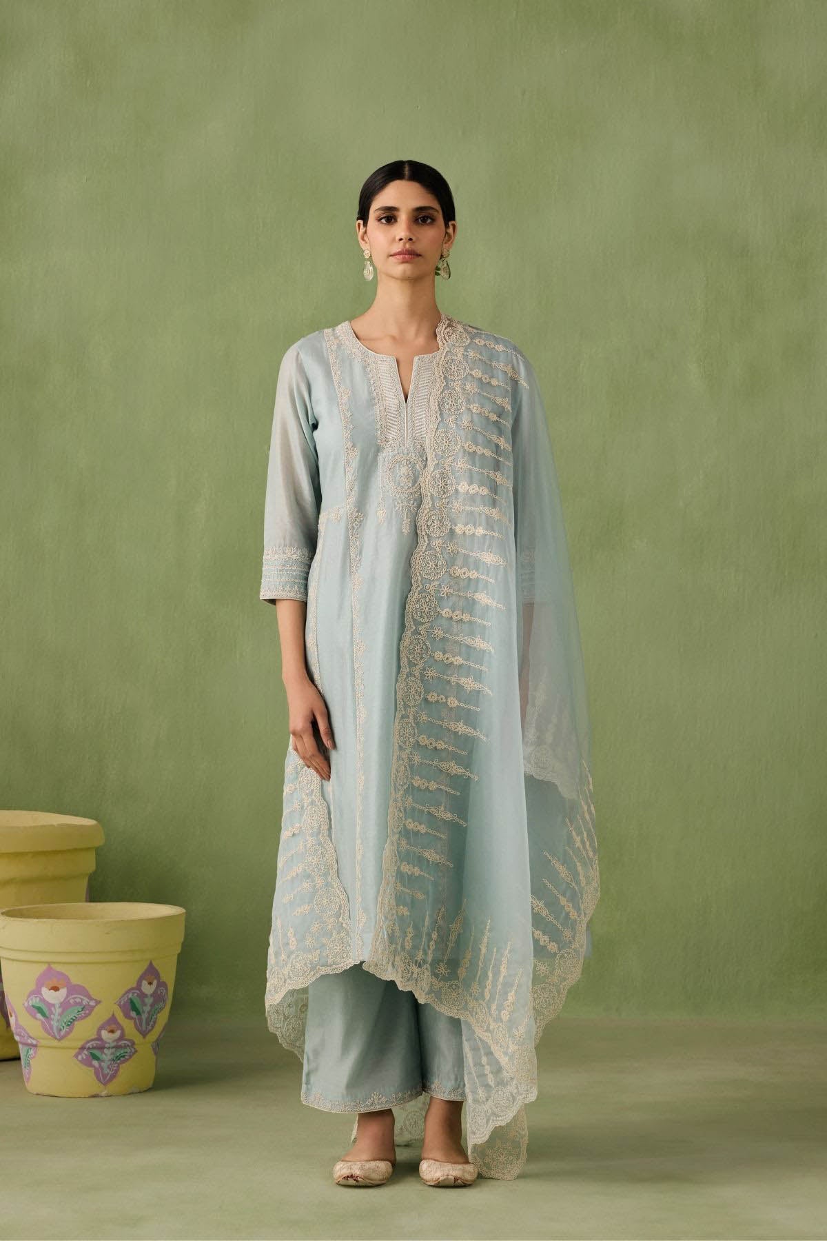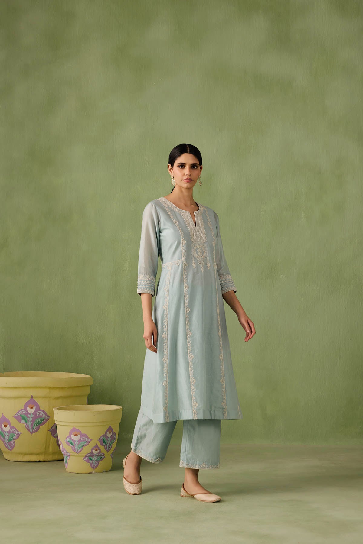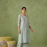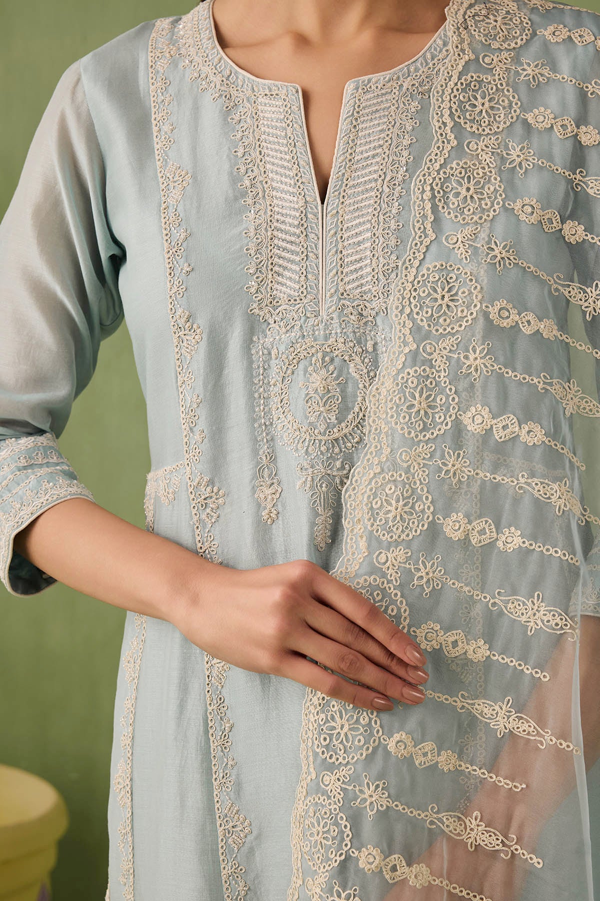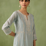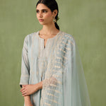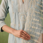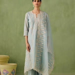 Introducing the ultimate summer ensemble — our panelled powder blue kurta comes with stunning dori and aari work that is complimented perfectly by pearls, sequins, and bead embellishments. Complete the look with a intricately embroidered organza dupatta or skip it for modern day charm.