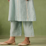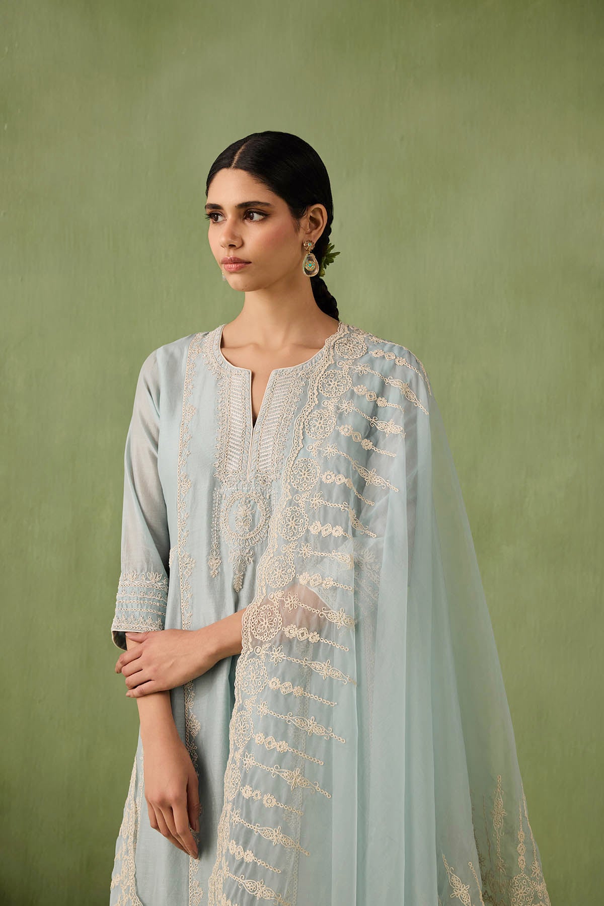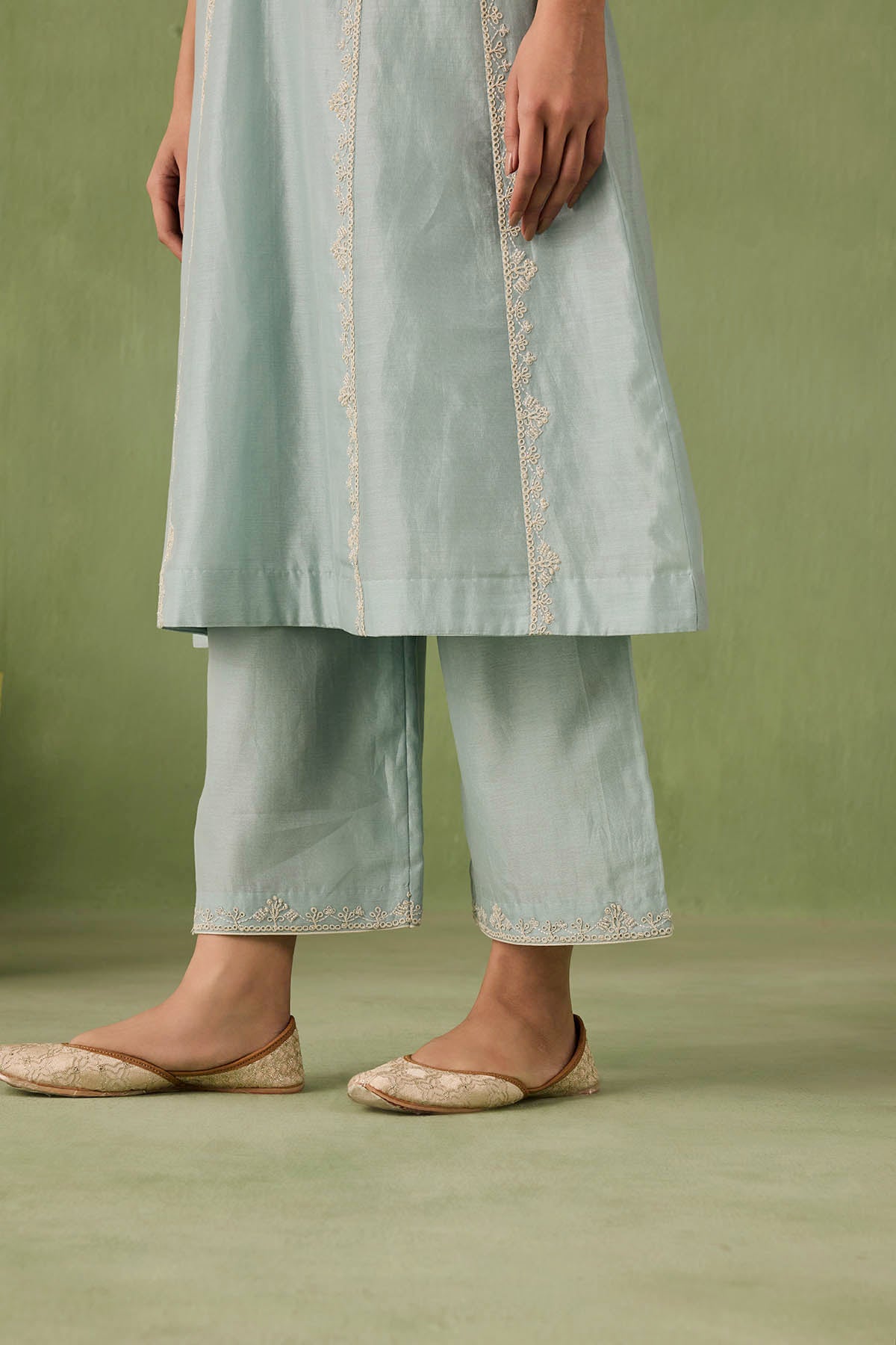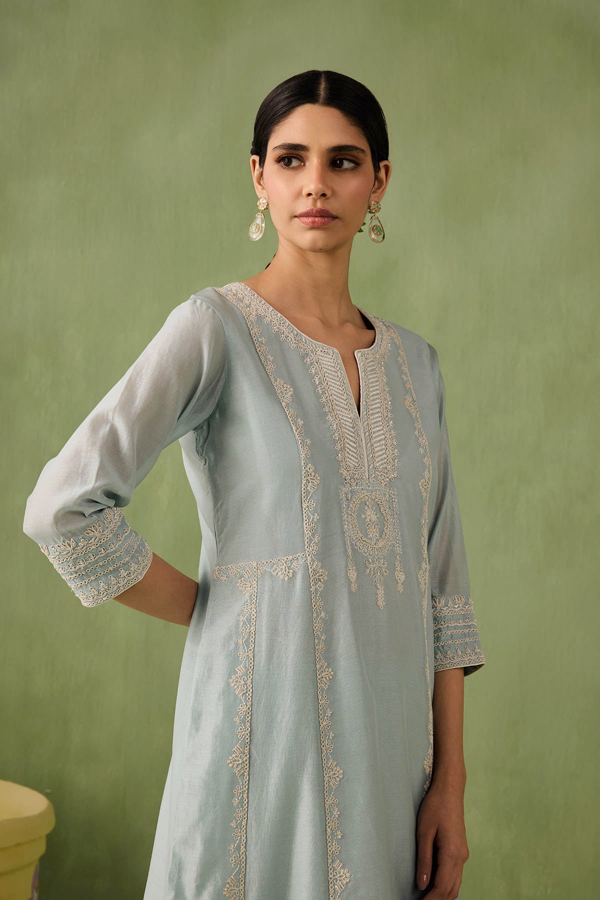 Introducing the ultimate summer ensemble — our panelled powder blue kurta comes with stunning dori and aari work that is complimented perfectly by pearls, sequins, and bead embellishments. Complete the look with a intricately embroidered organza dupatta or skip it for modern day charm.