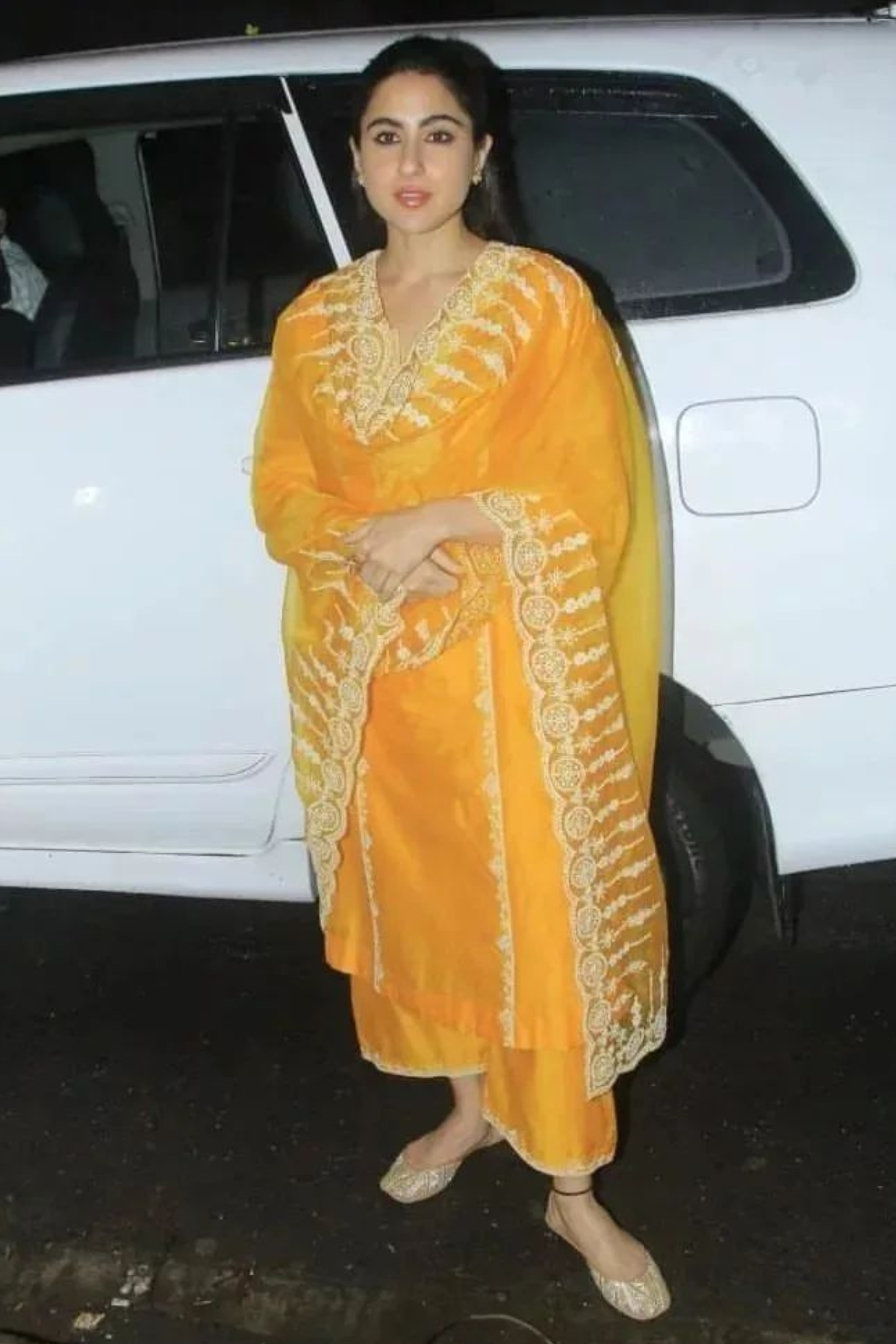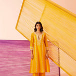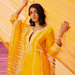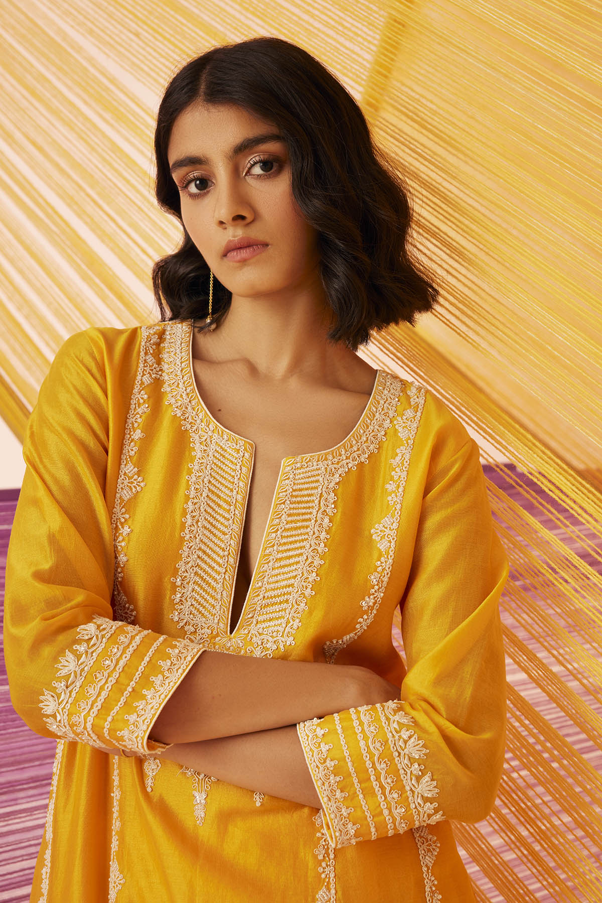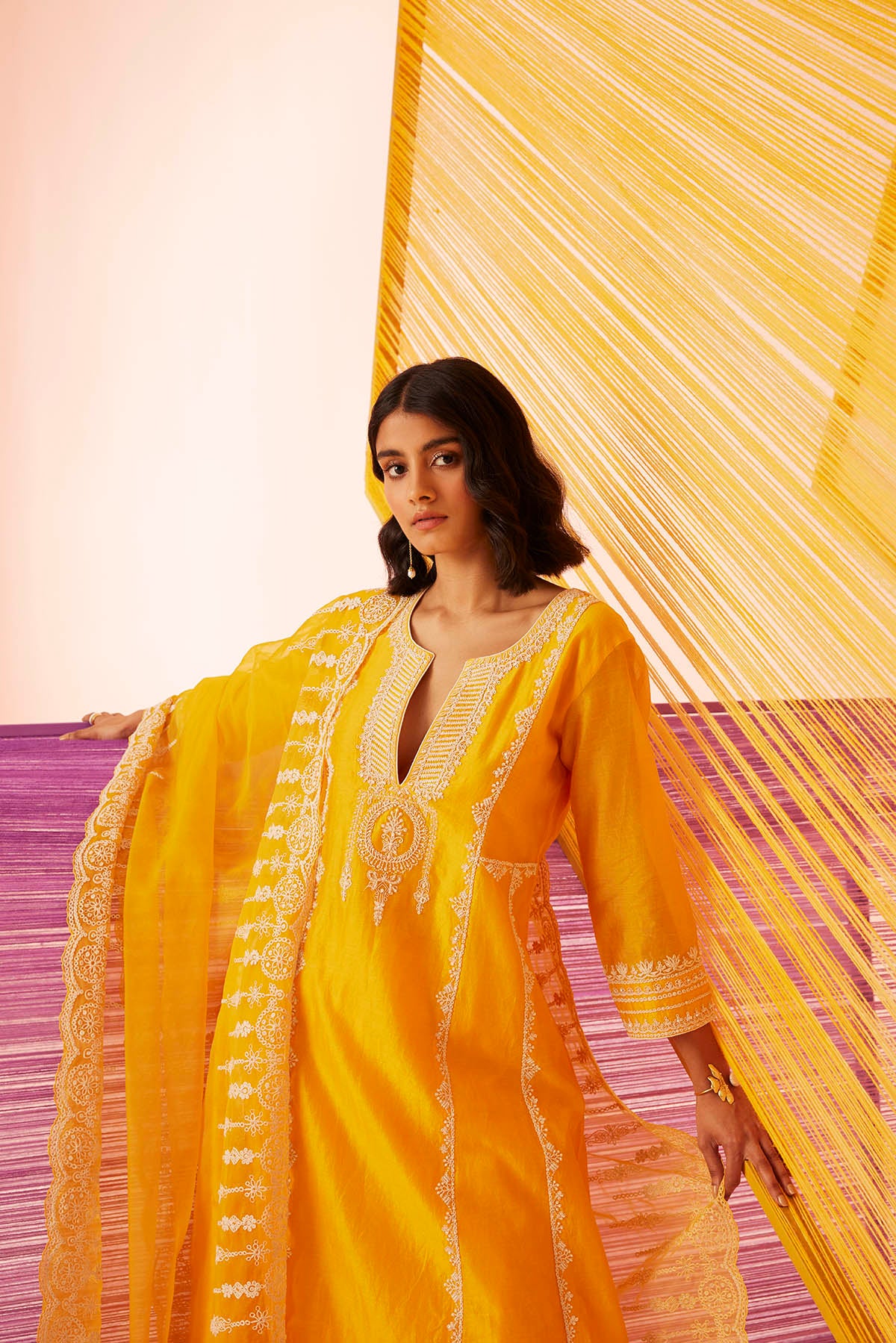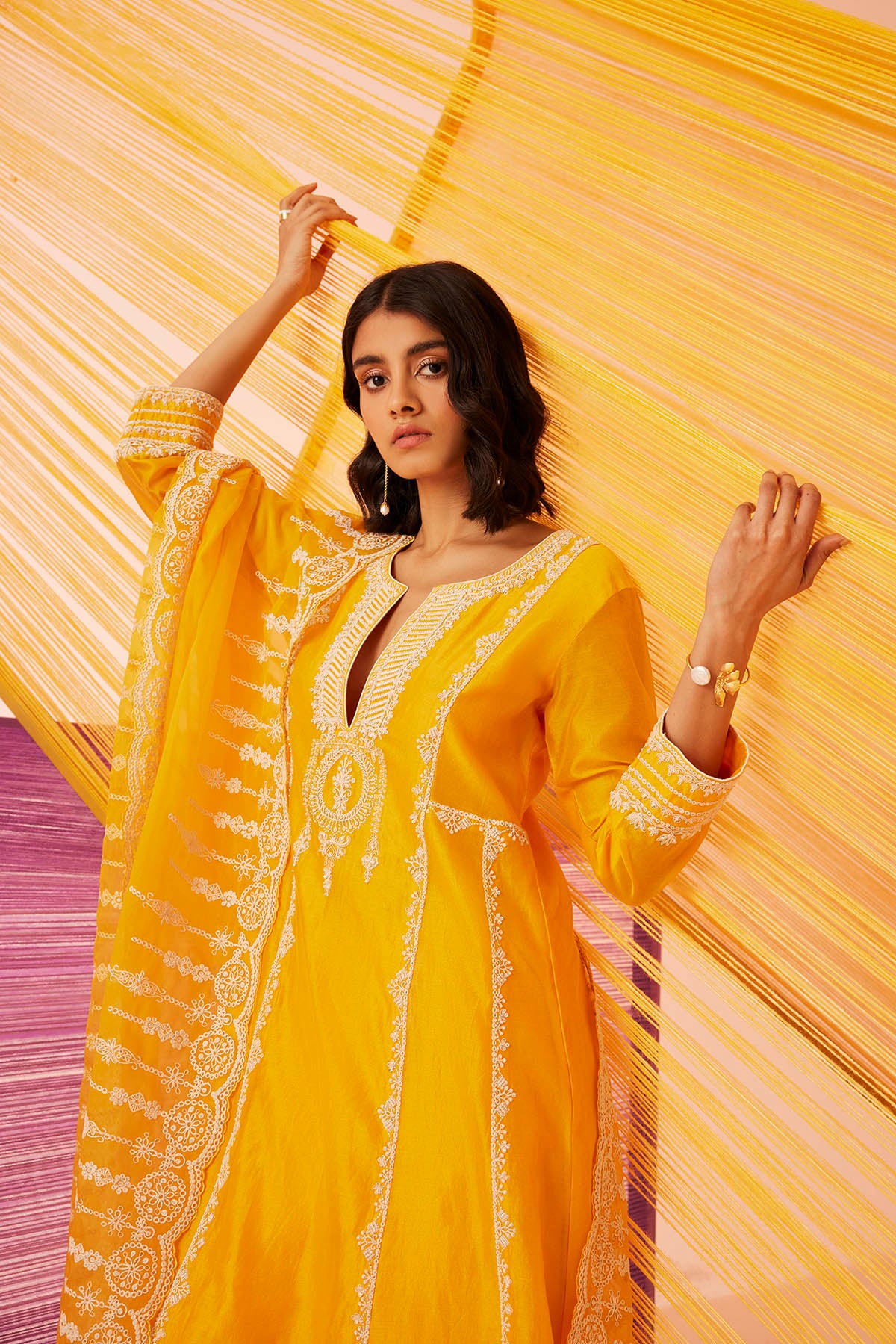 Looking for the perfect outfit to brighten up your day? Introducing the ultimate summer ensemble — a panelled yellow kurta with stunning dori and aari work, embellished with pearls, sequins, and beads, paired with a simple palazzo and organza dupatta with intricate dori embroidery.