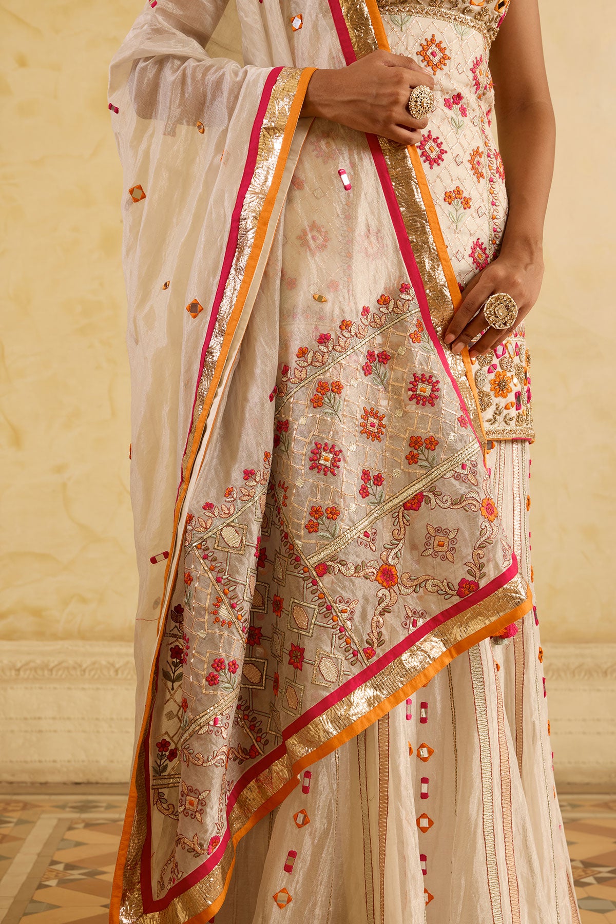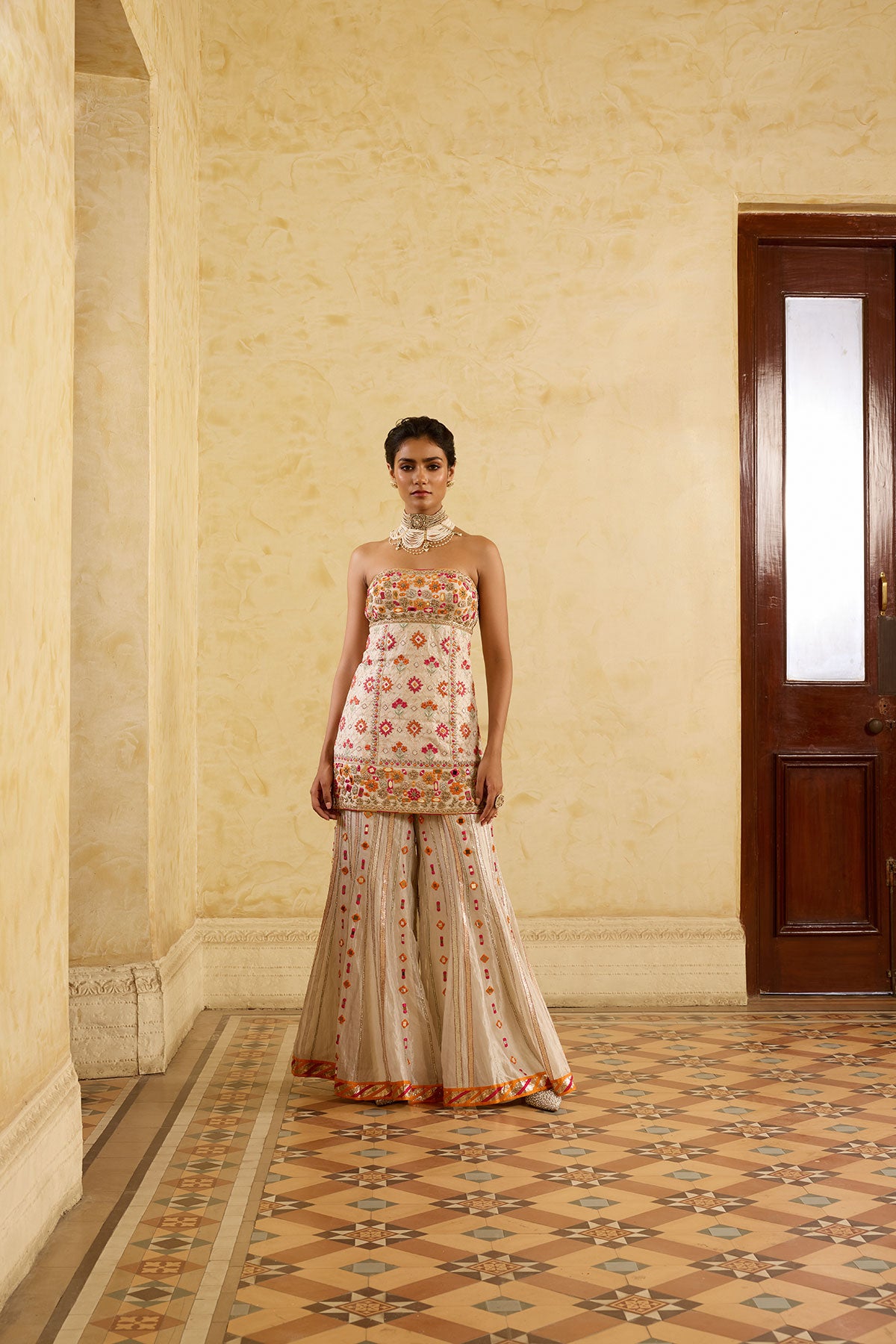 Make a statement with the Midsummer sharara set. Crafted from luxurious silk tissue, it features a strapless kurta, flared sharara pants, and an intricately embroidered dupatta. Bold yet elegant, this ensemble is perfect for a modern, glamorous wedding look.