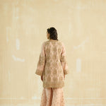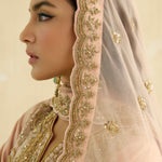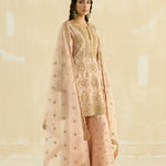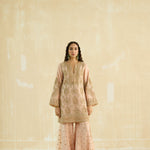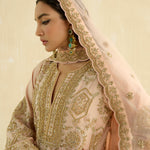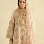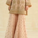 This peach gold ensemble features a kurta and gharara adorned with intricate kiran dori threadwork and delicate hand beadwork. Paired with an ethereal embroidered organza dupatta, this set is perfect for any celebration on your calendar.