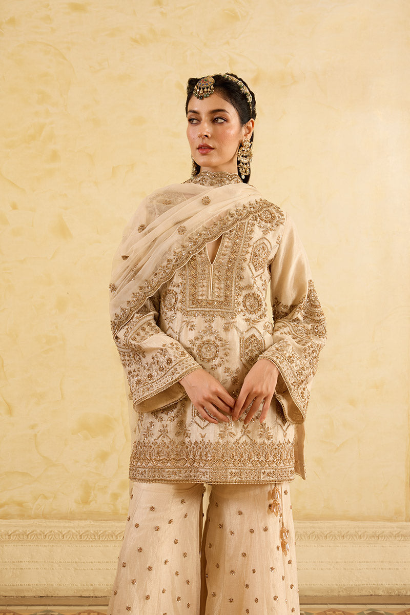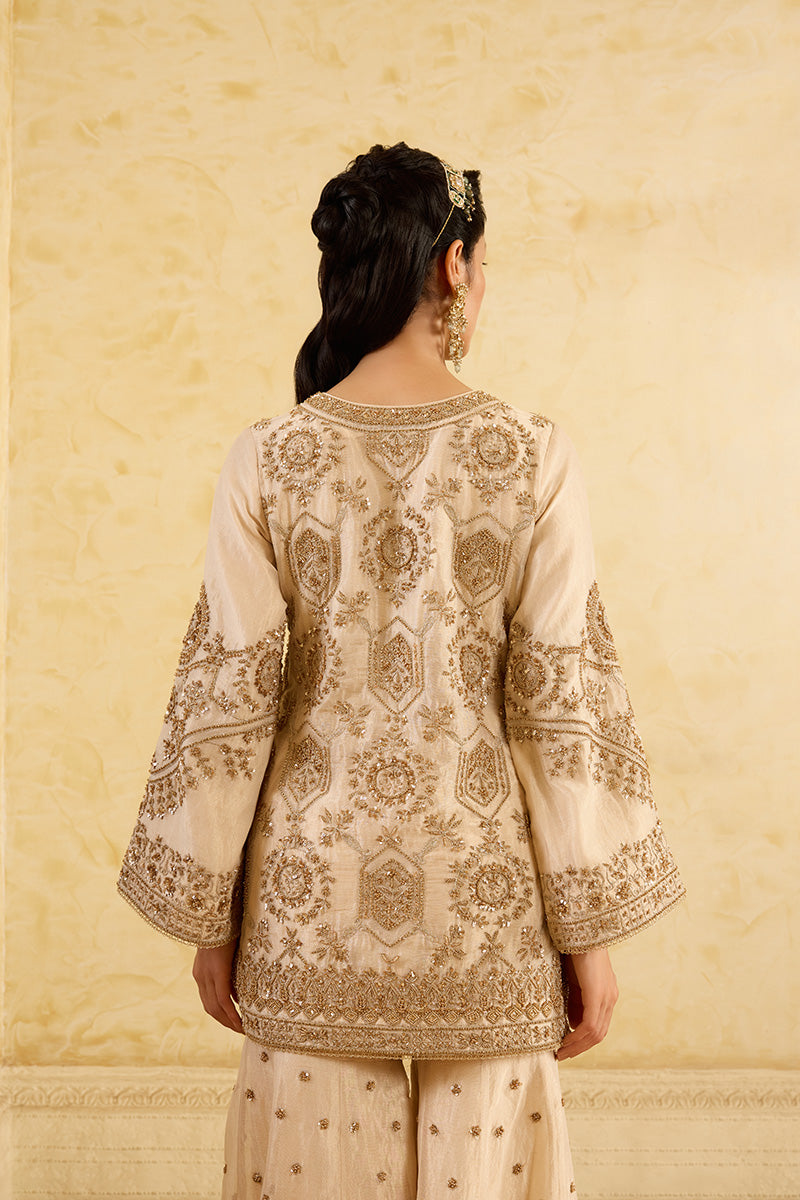 This gold tissue silk ensemble features a short kurta and gharara adorned with intricate Kiran Dori threadwork and delicate hand beadwork. Paired with an ethereal embroidered organza dupatta, this set is perfect for all the summer weddings on your calendar.