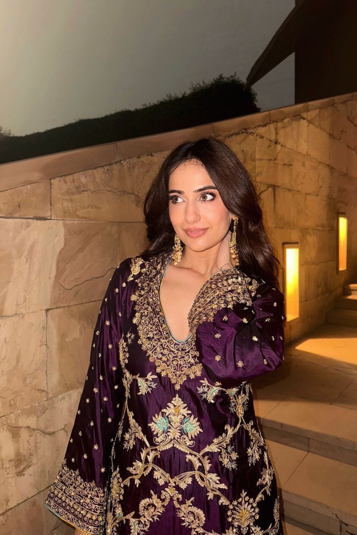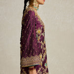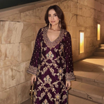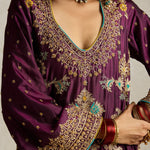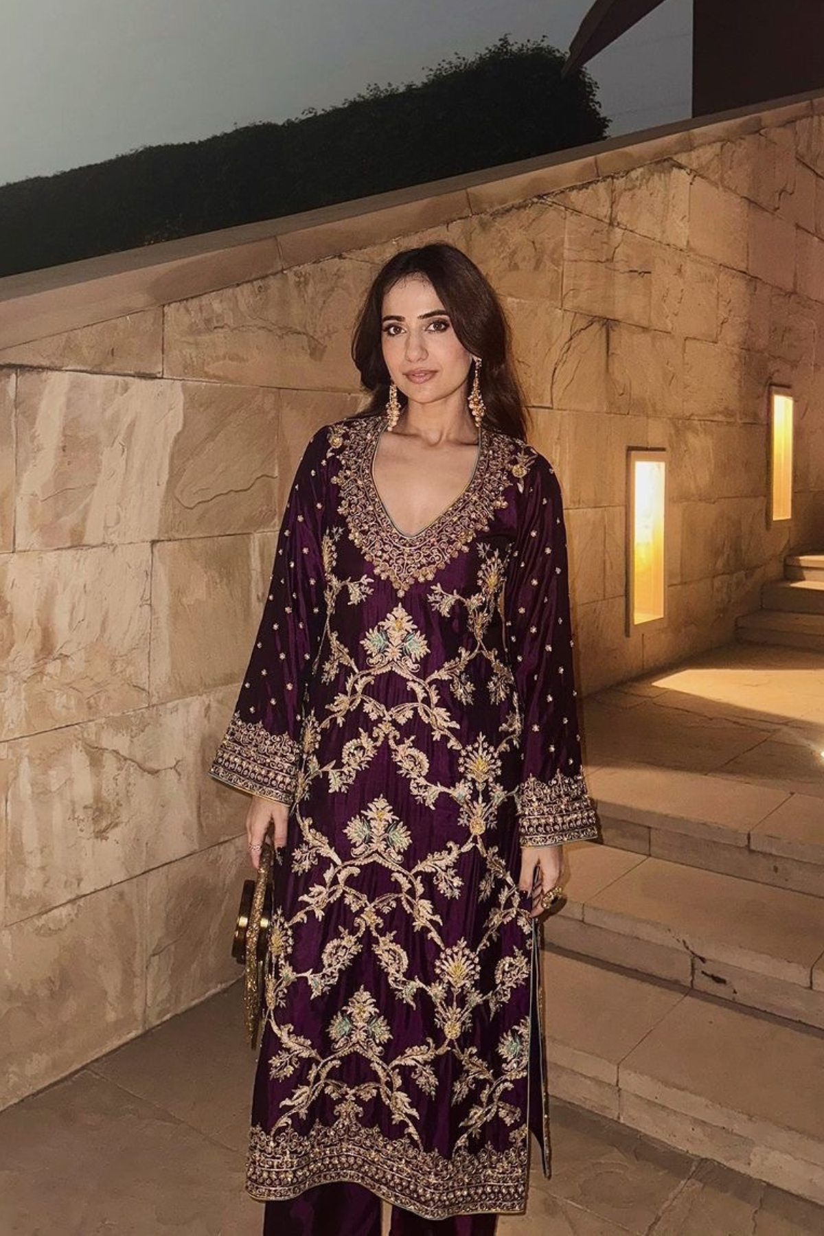 This pure silk wine kurta set, beautifully adorned with floral jaal embroidery, brings together aari, resham, kiran dori, sitara, and beadwork embroidery techniques. The exquisite detailing across the surface of the kurta and the borders of the bottoms make it a refined choice for those seeking timeless charm with a contemporary flair.