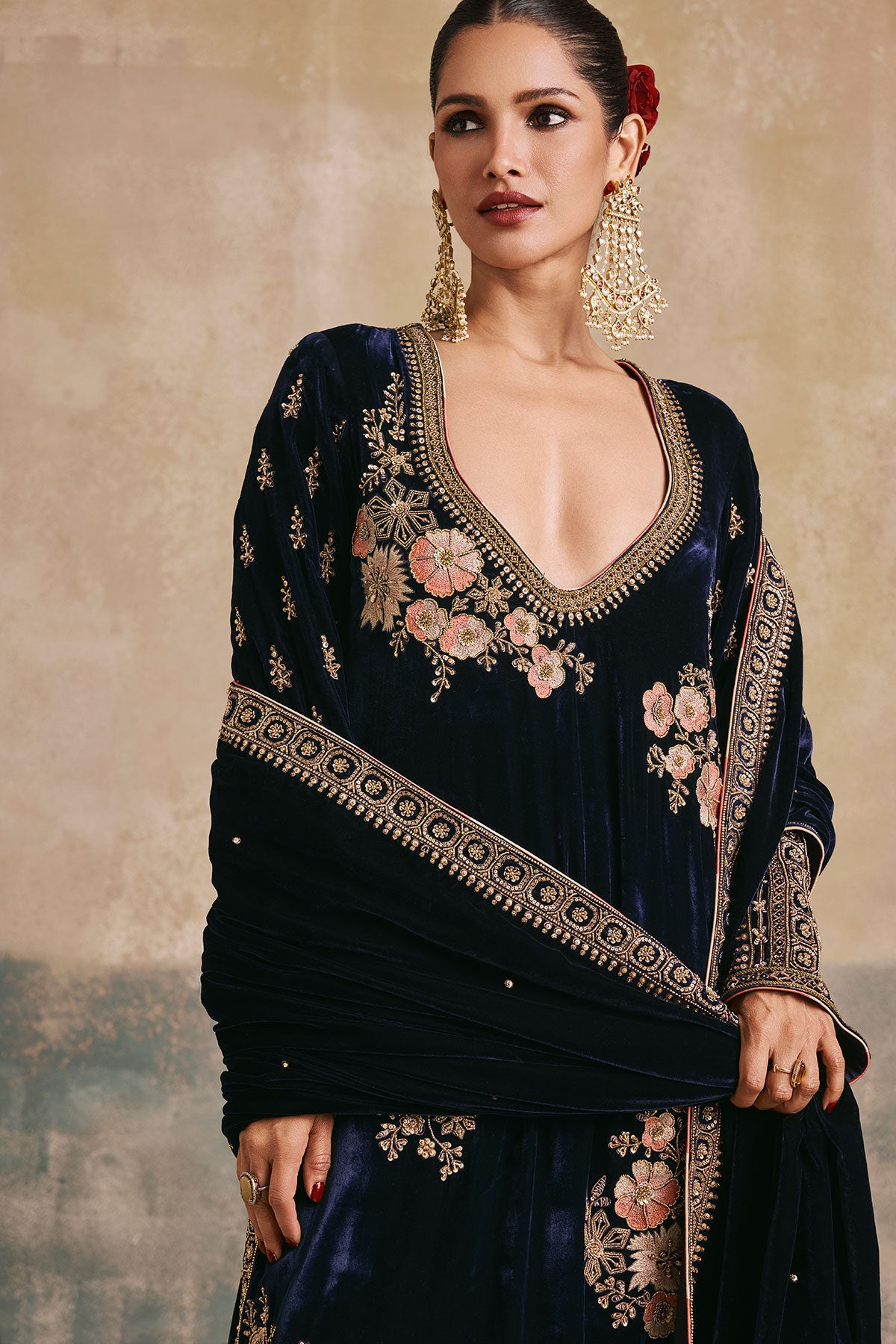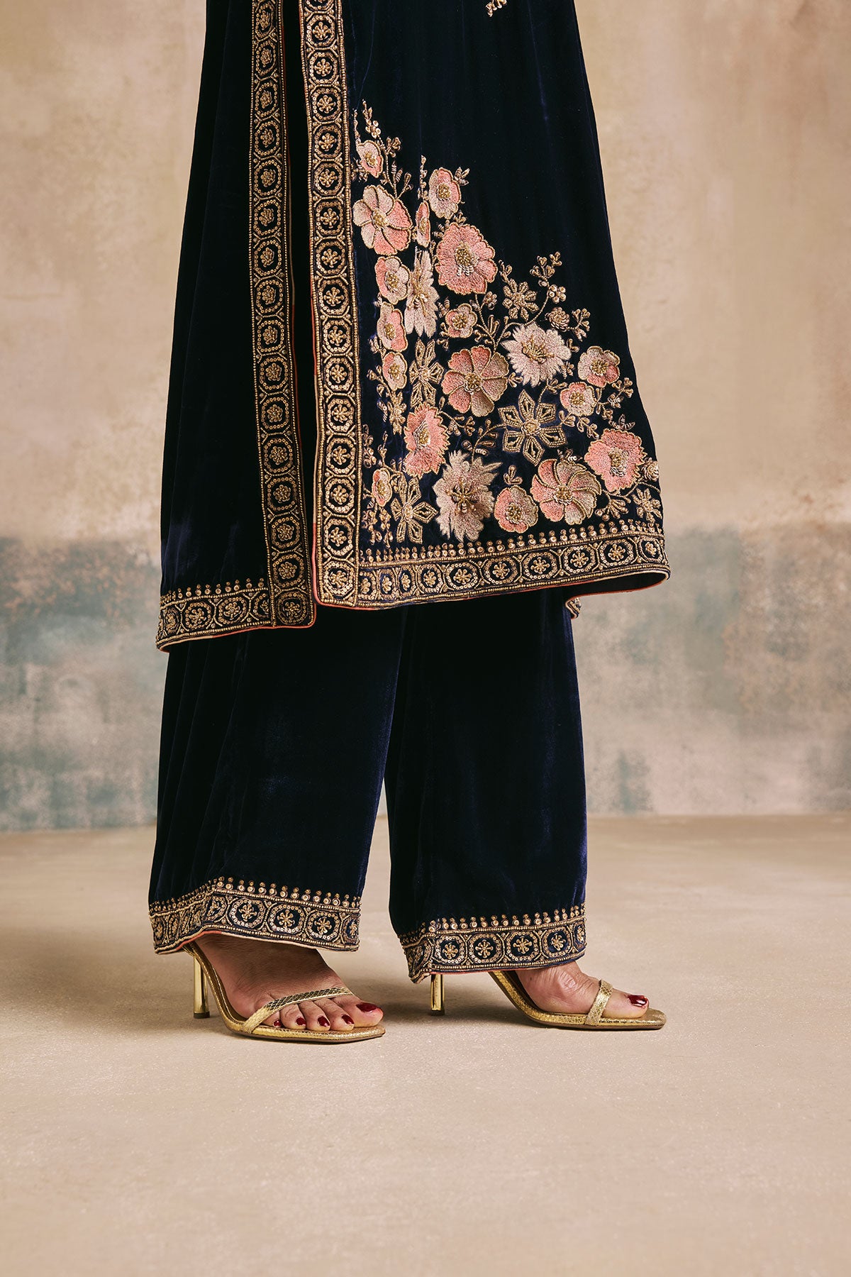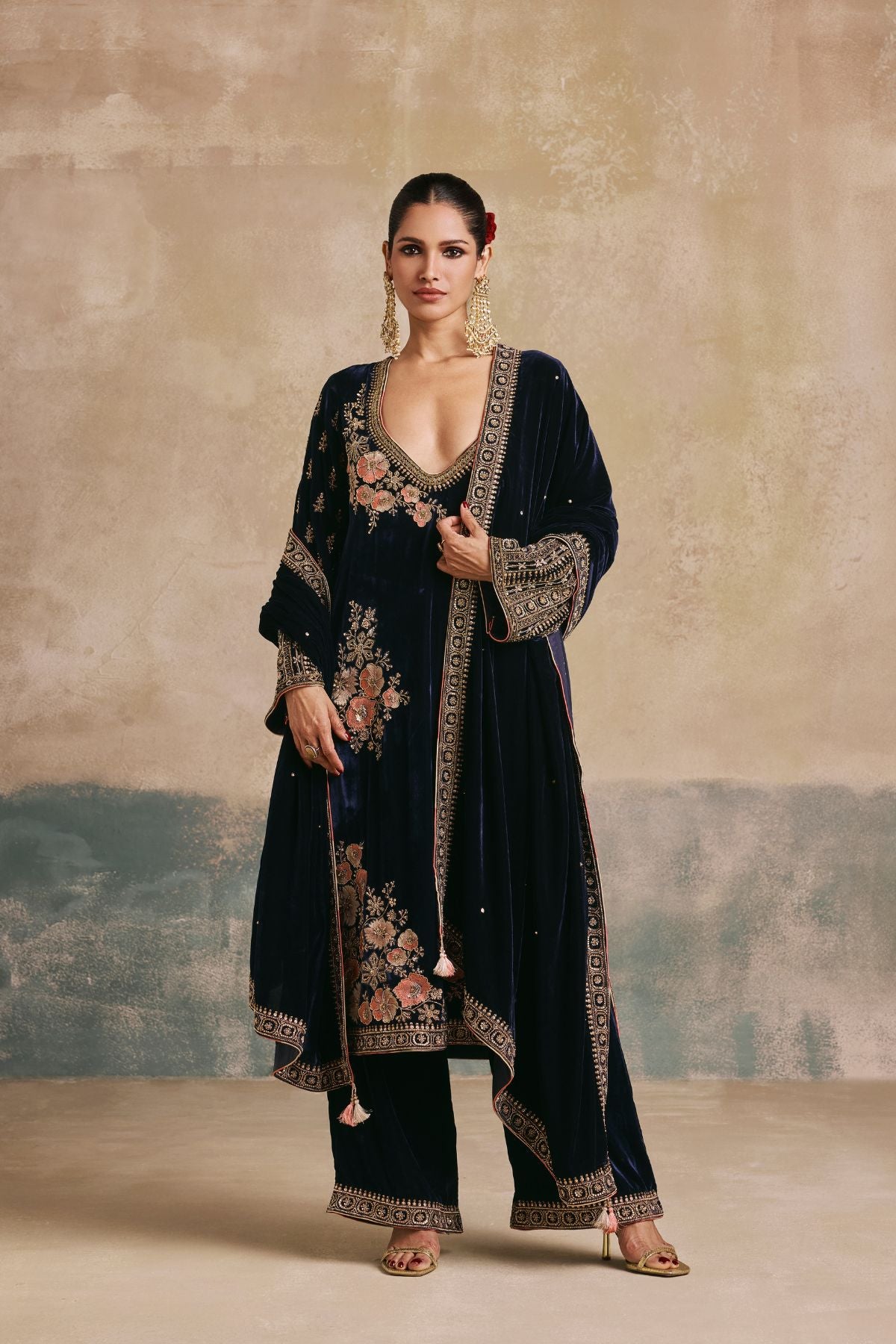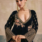 The Gulbano Kurta Set features navy silk velvet brought to life with contrast soft floral embroidery and ornate gold details. Paired with a flowing dupatta and modern accents, this is velvet at its finest.