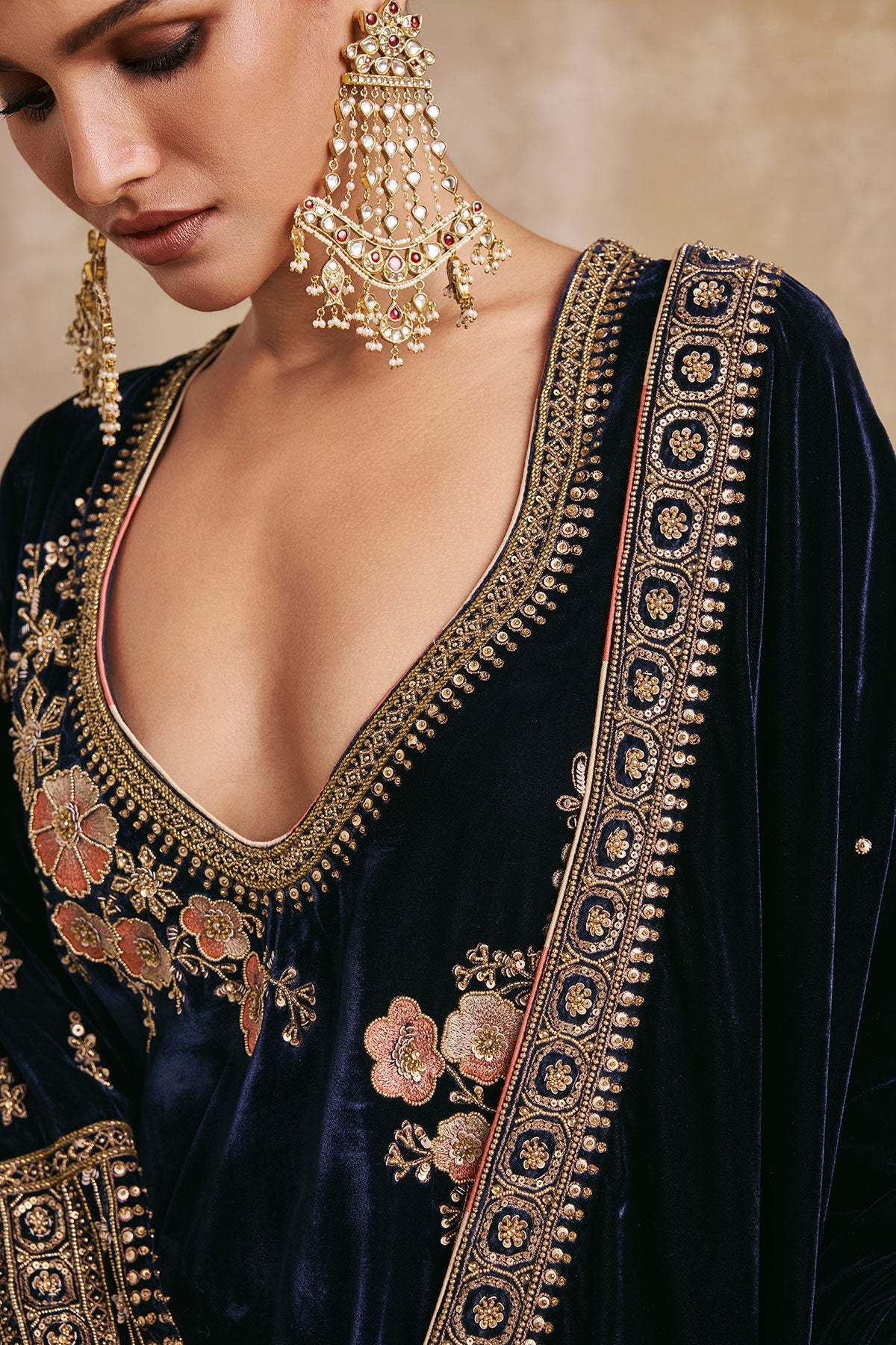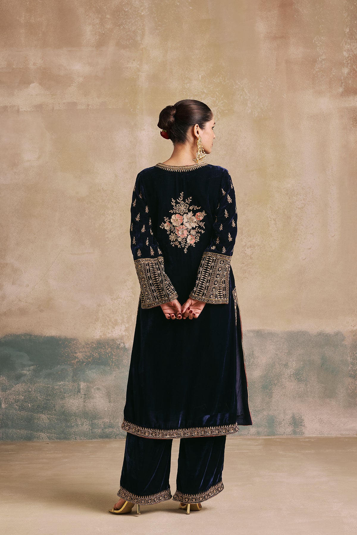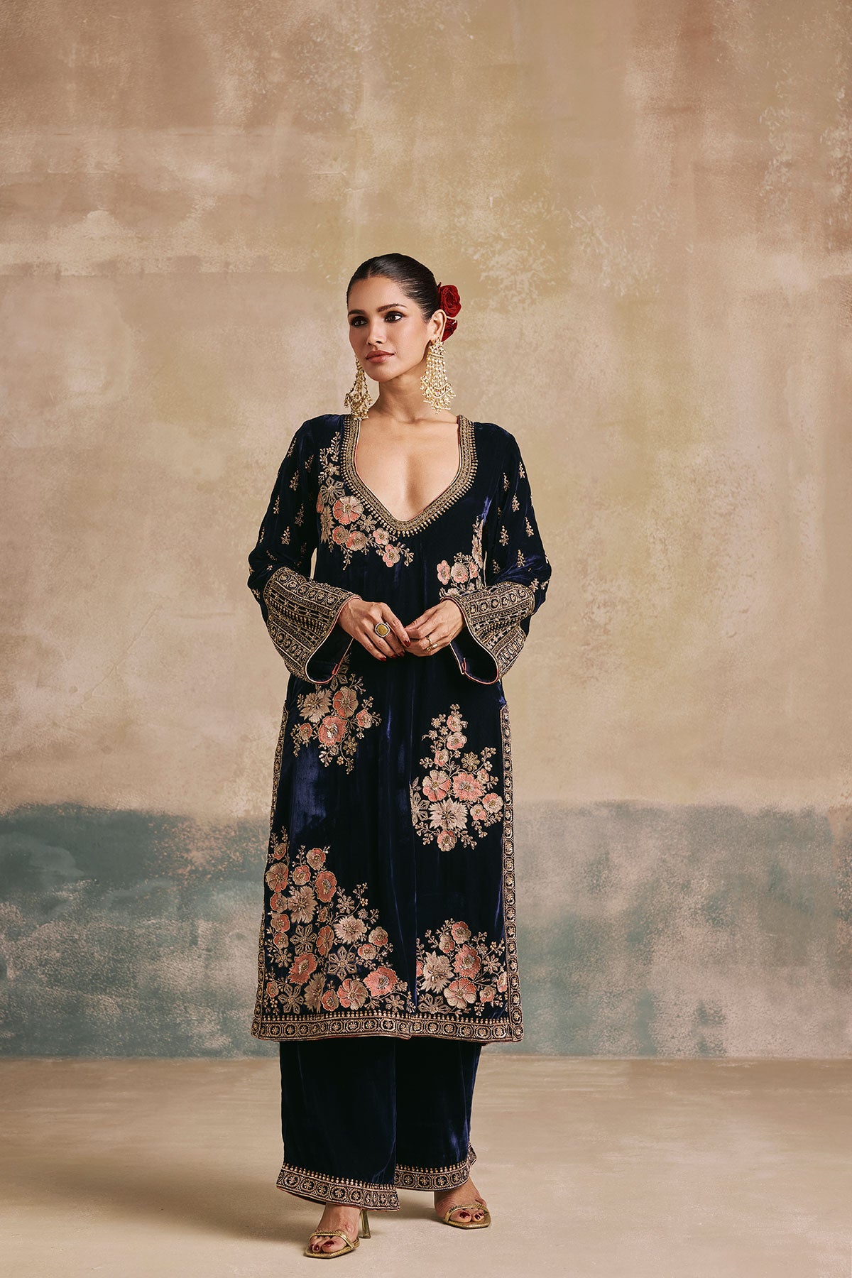 The Gulbano Kurta Set features navy silk velvet brought to life with contrast soft floral embroidery and ornate gold details. Paired with a flowing dupatta and modern accents, this is velvet at its finest.