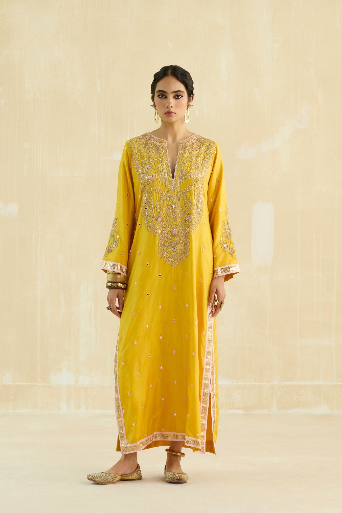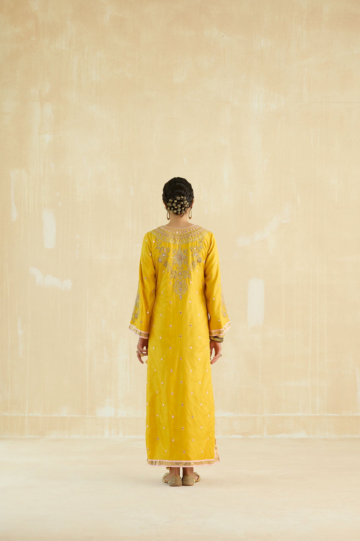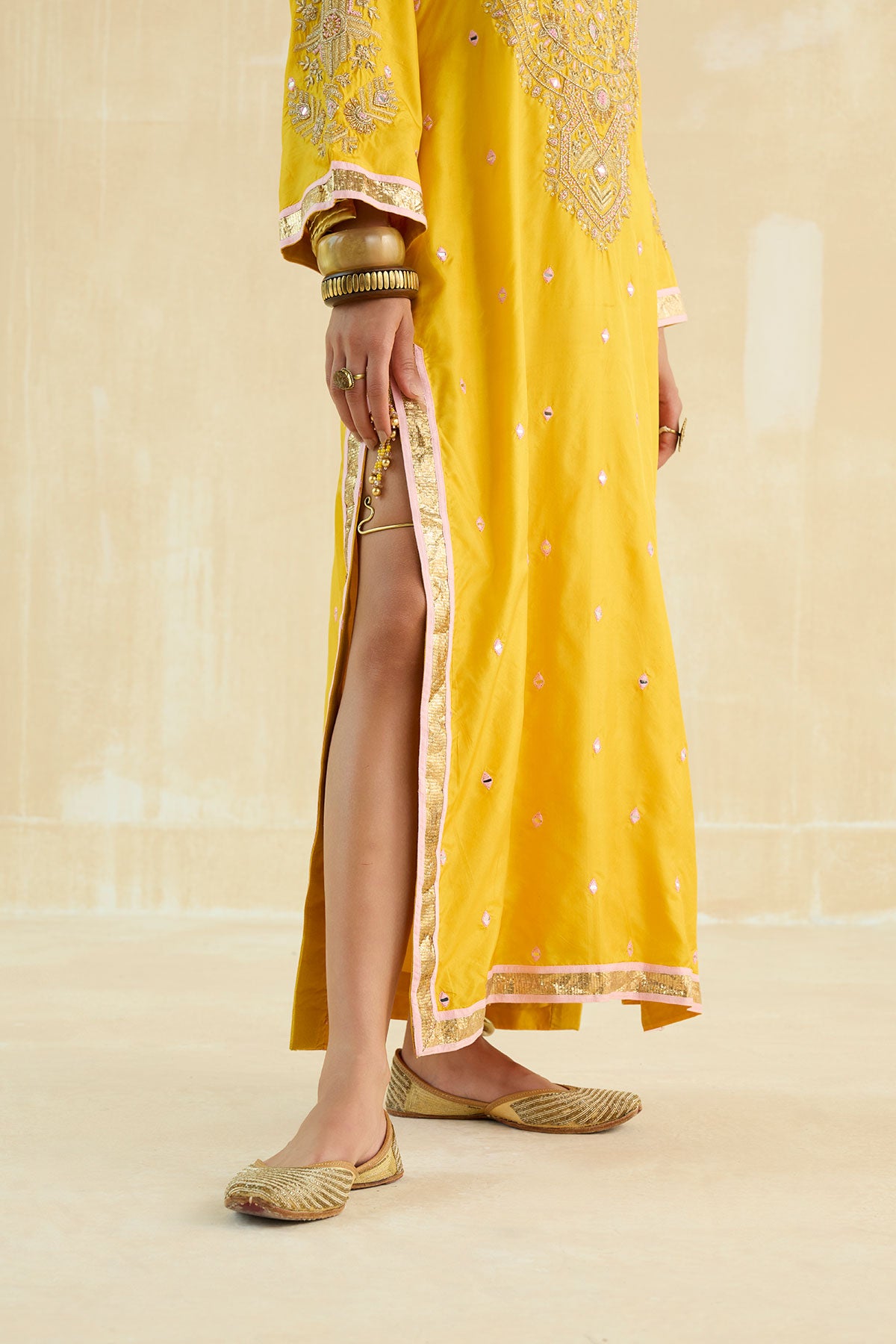This yellow silk kaftan is adorned with intricate threadwork, zardozi, aari and a touch of gota for a festive finish. The Mughal neckline and gota-bordered edges make this piece stand out.
