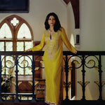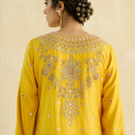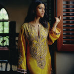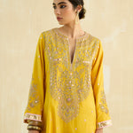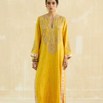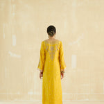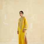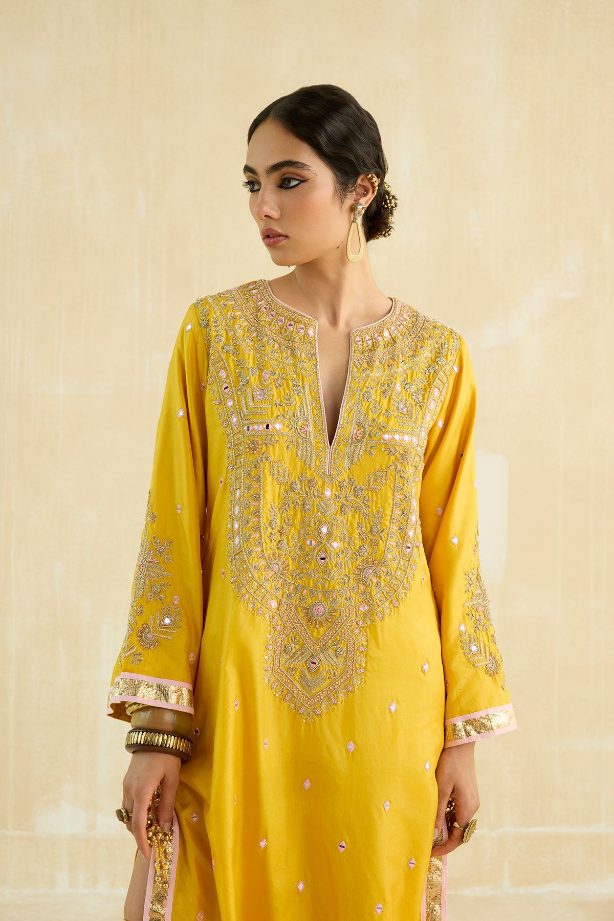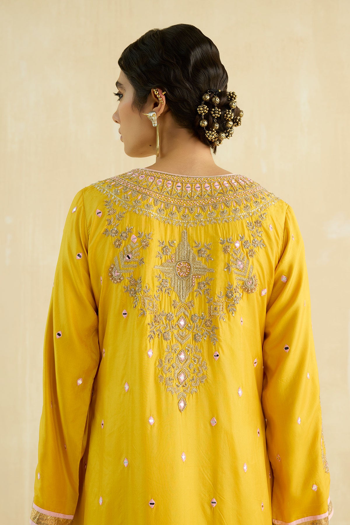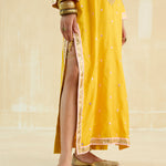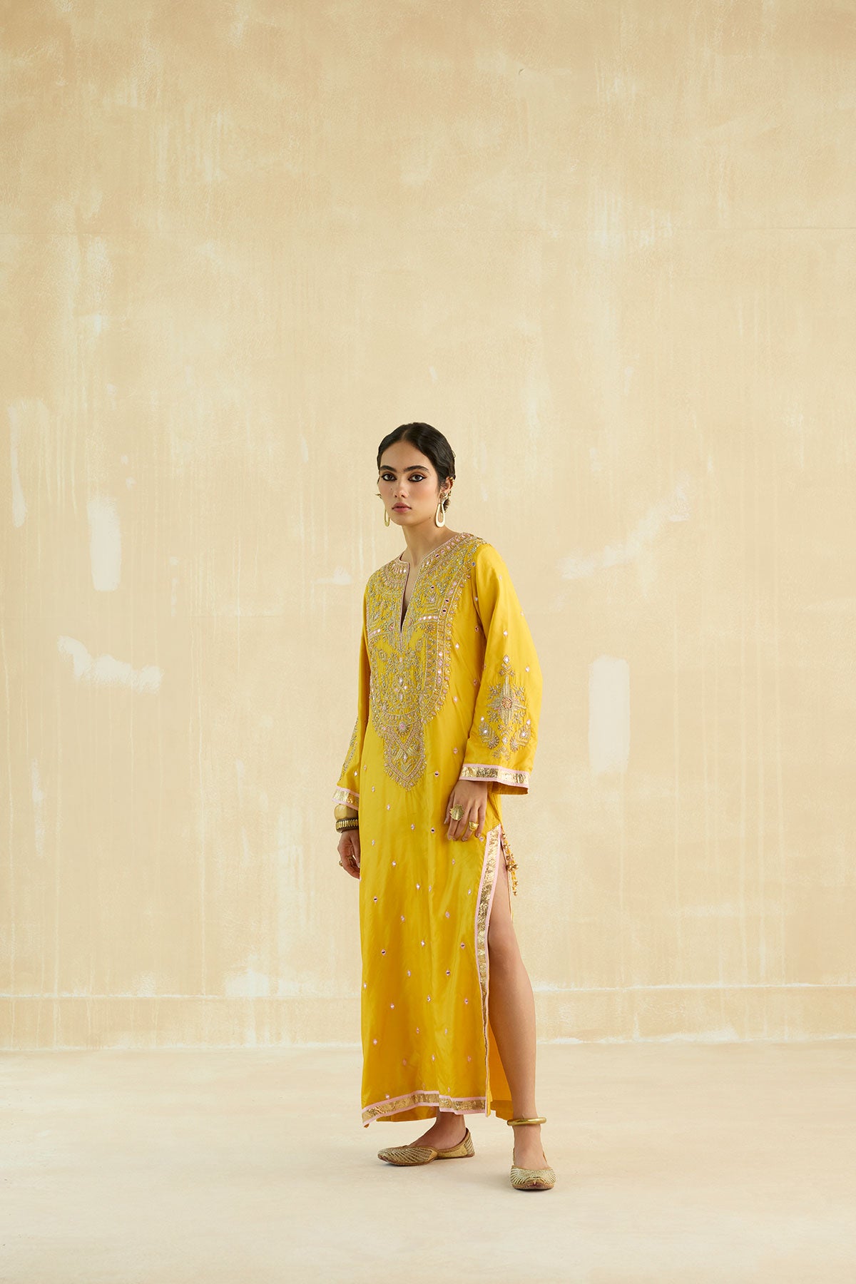 This yellow silk kaftan is adorned with intricate threadwork, zardozi, aari and a touch of gota for a festive finish. The Mughal neckline and gota-bordered edges make this piece stand out.