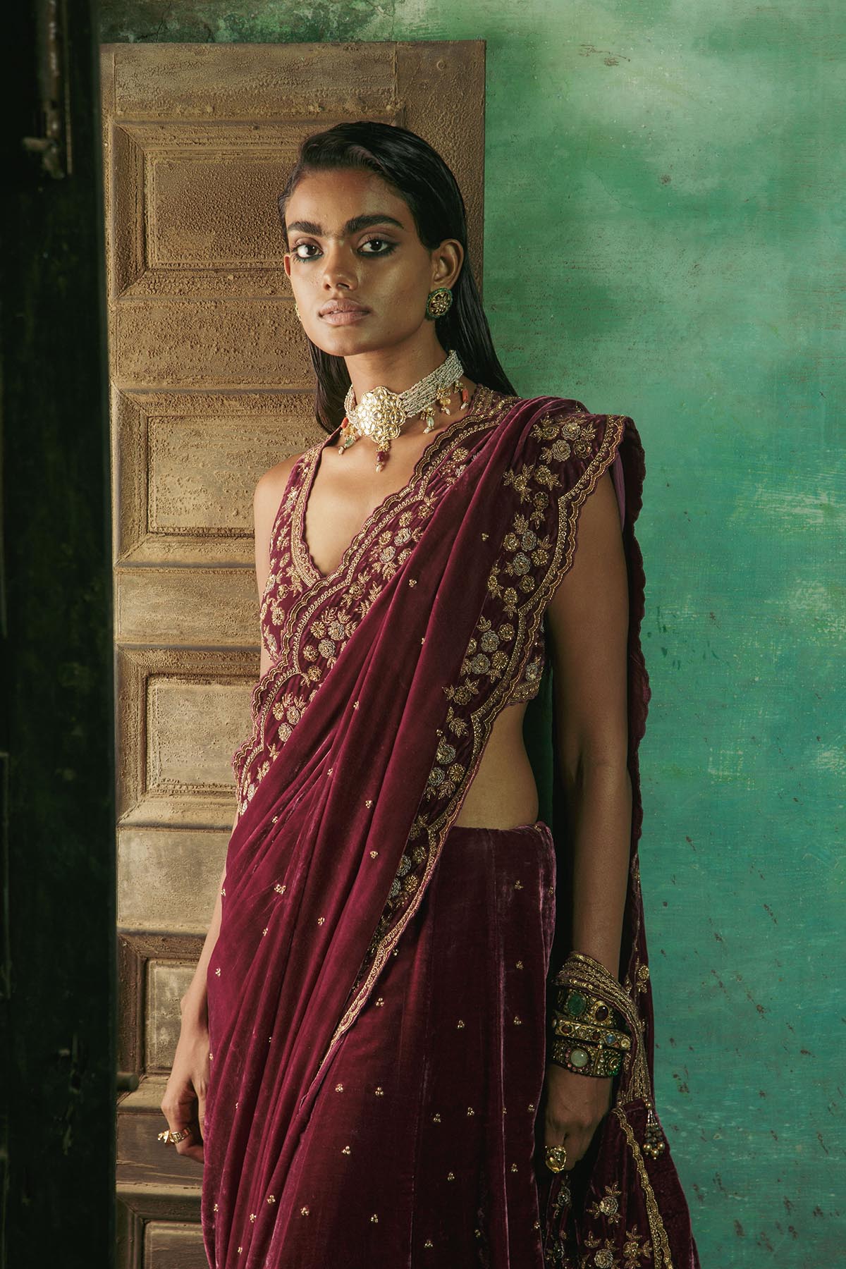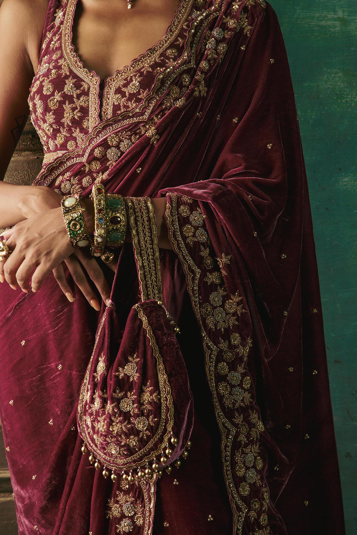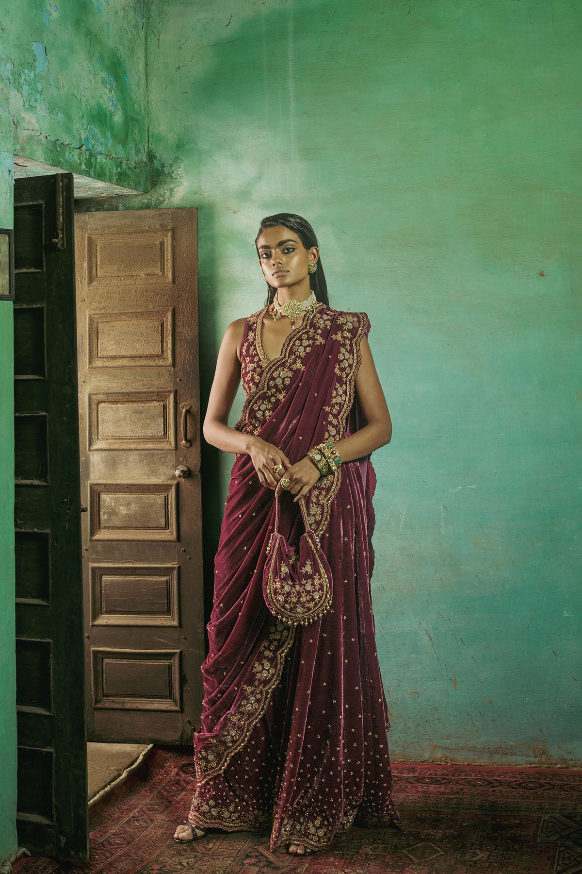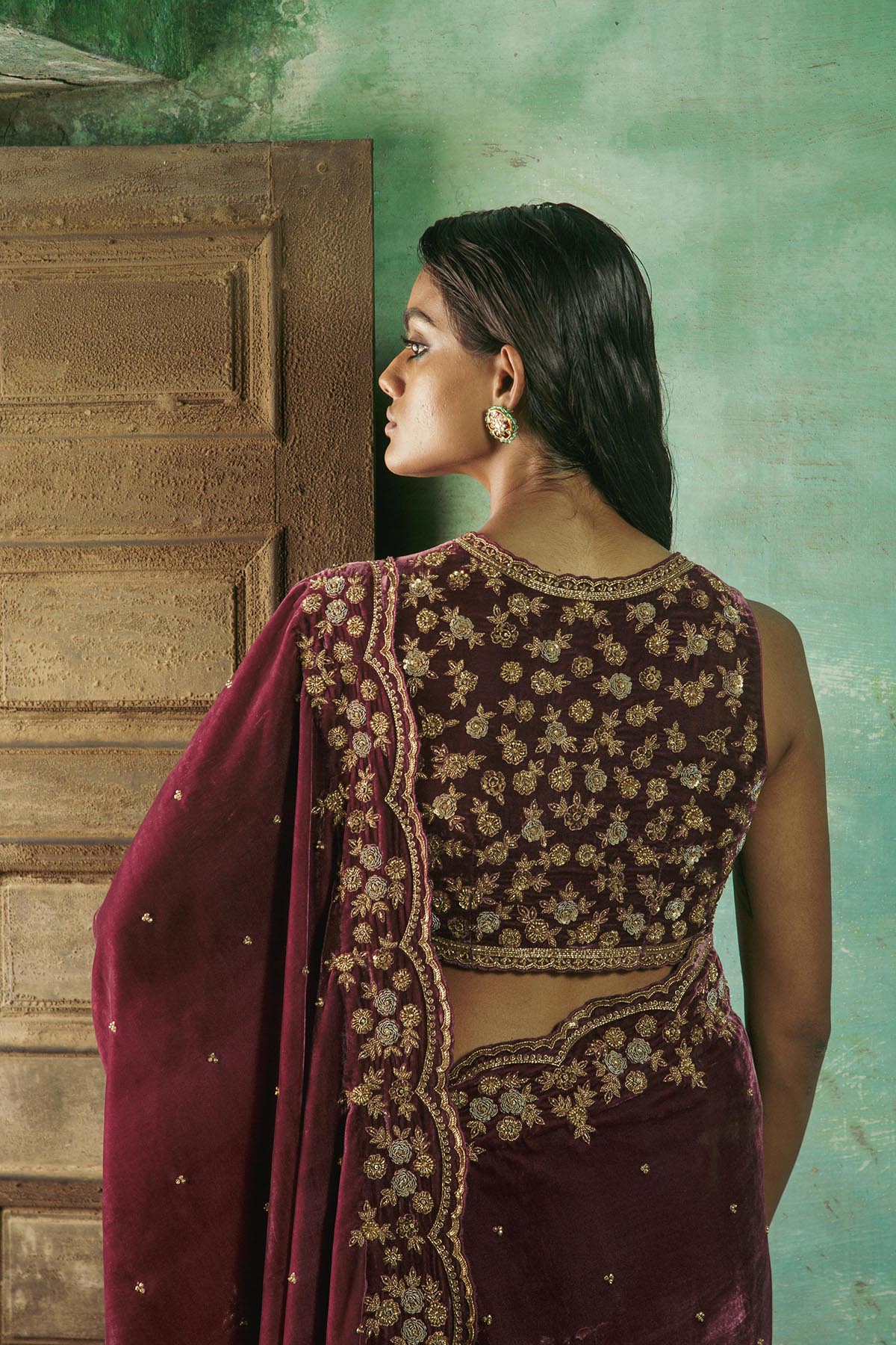 The sari that dreams are made of — nine yards of decadent silk velvet is adorned with hand embroidered thread, sitara, bead and cutdana work in the most beautiful floral motifs along the border. The sleeveles blouse with matching intricate floral motifs adds a touch of modernity to the otherwise retro sari.