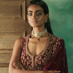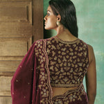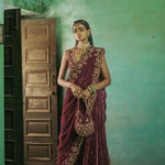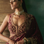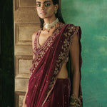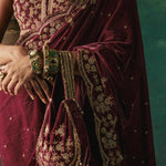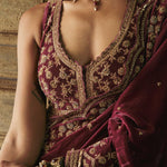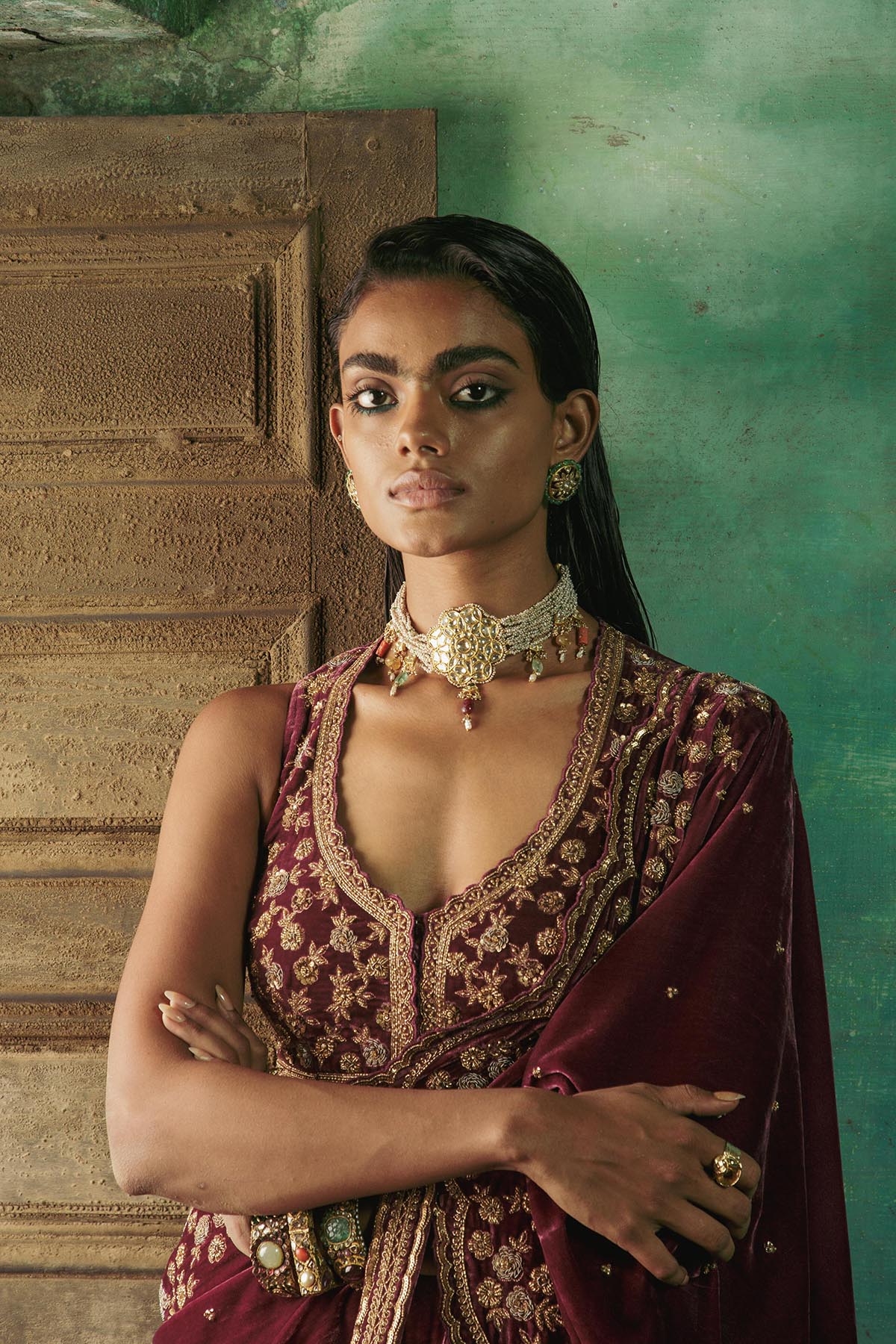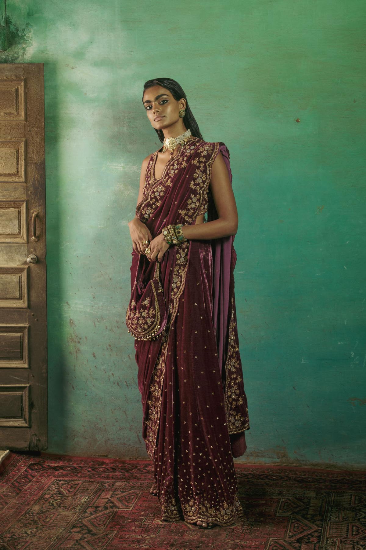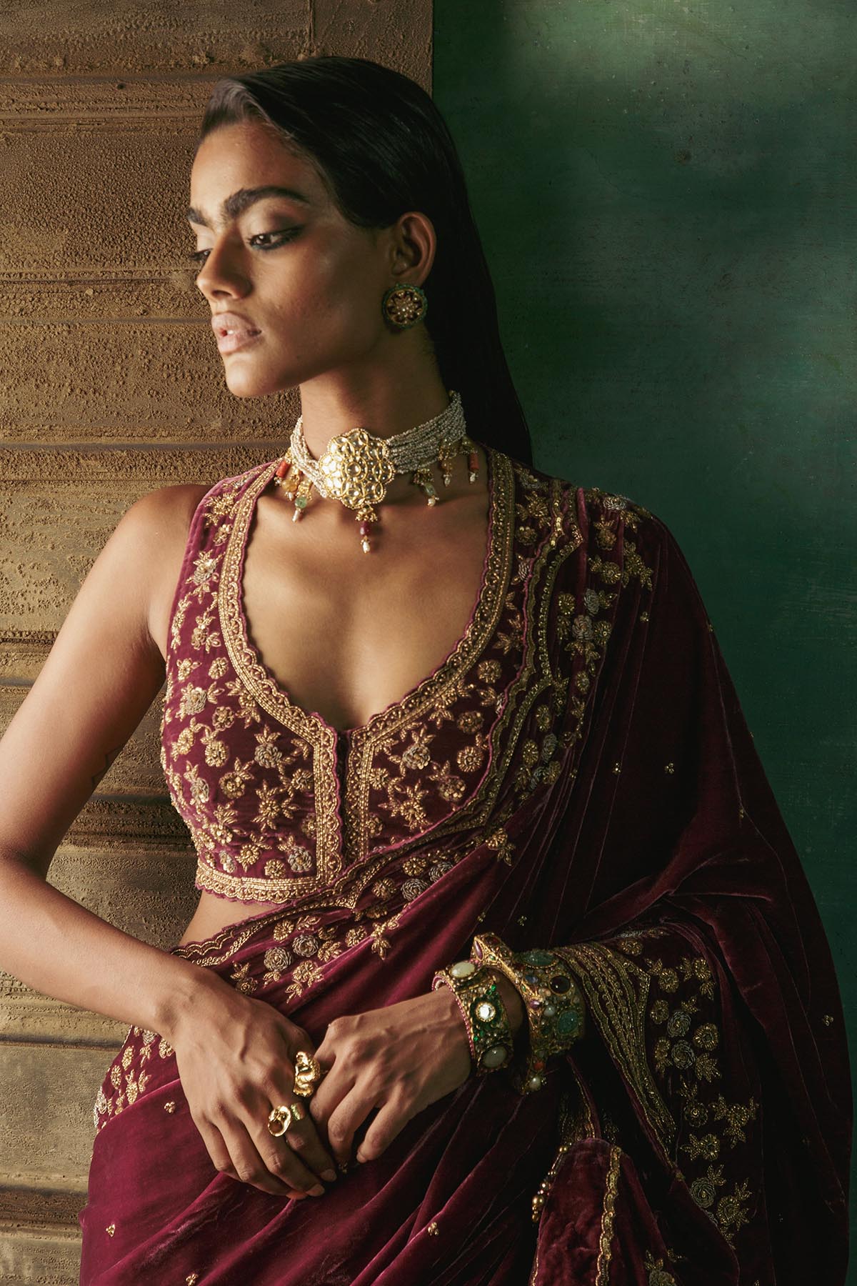 The sari that dreams are made of — nine yards of decadent silk velvet is adorned with hand embroidered thread, sitara, bead and cutdana work in the most beautiful floral motifs along the border. The sleeveles blouse with matching intricate floral motifs adds a touch of modernity to the otherwise retro sari.