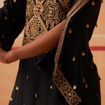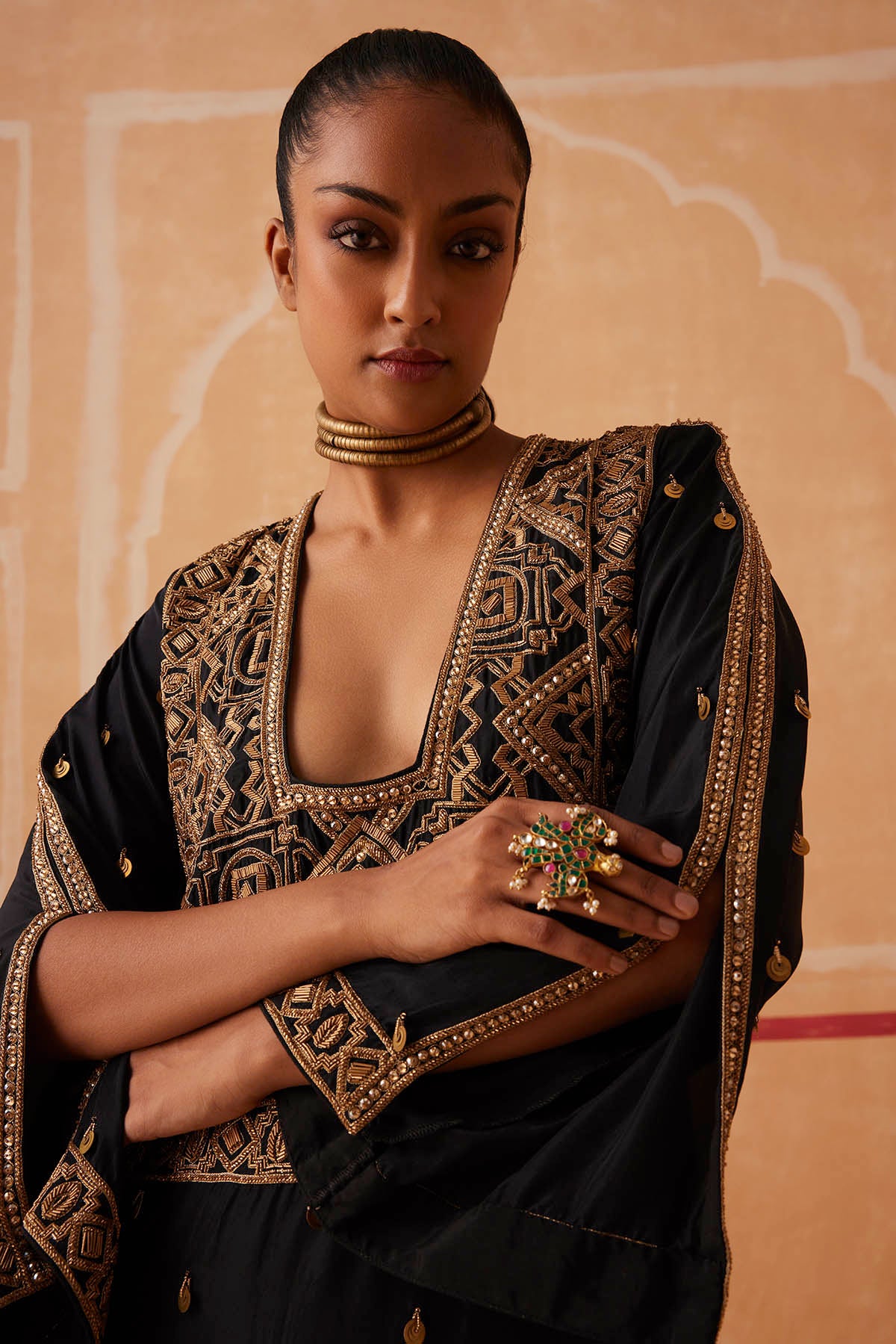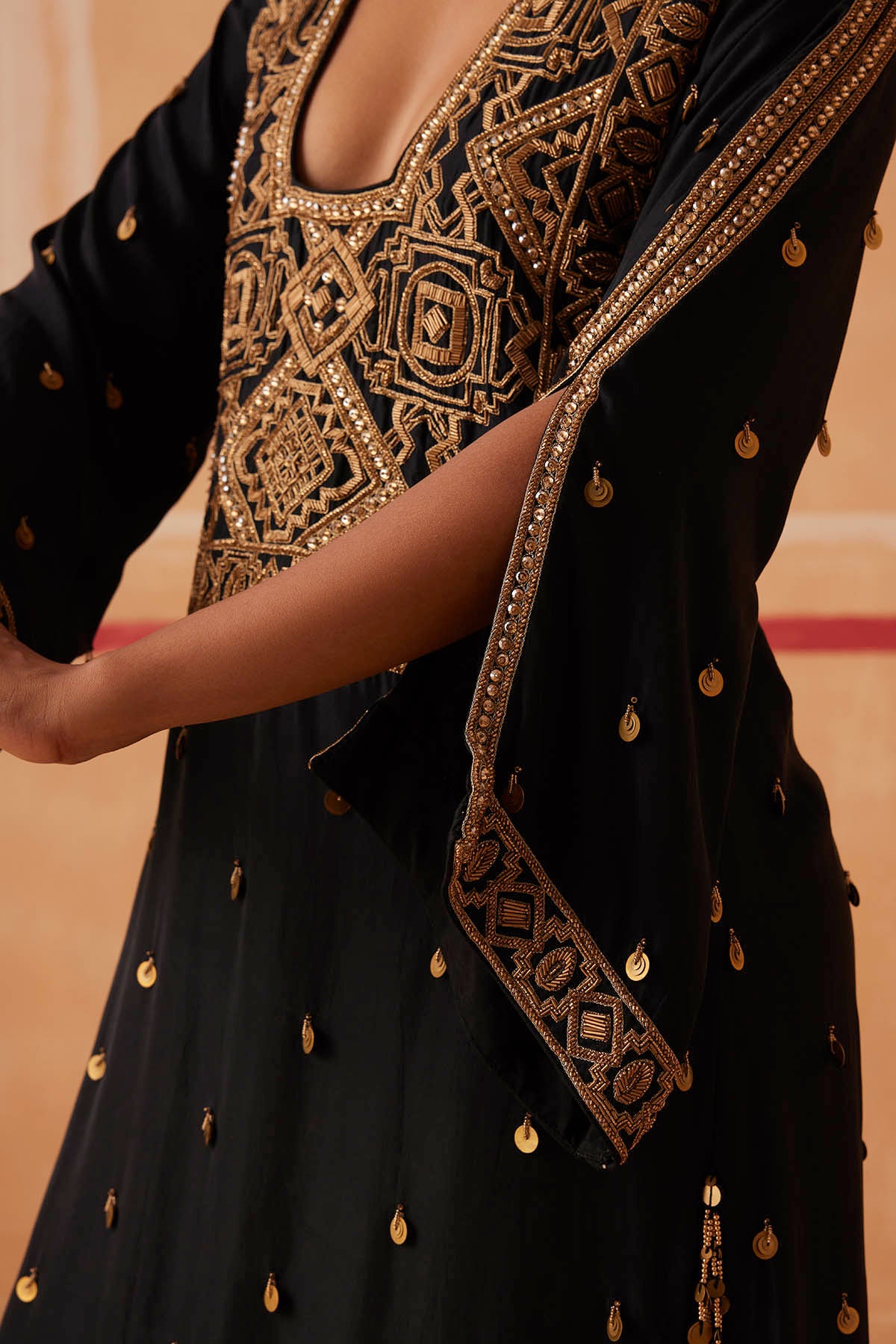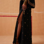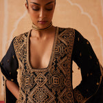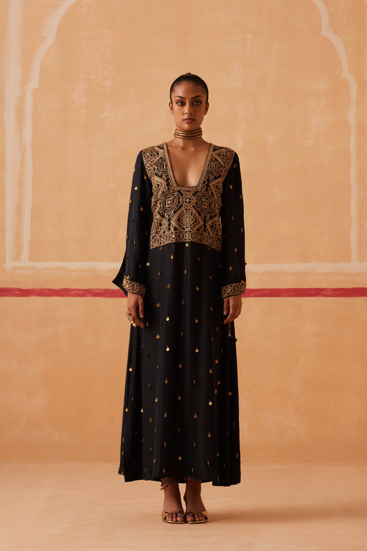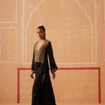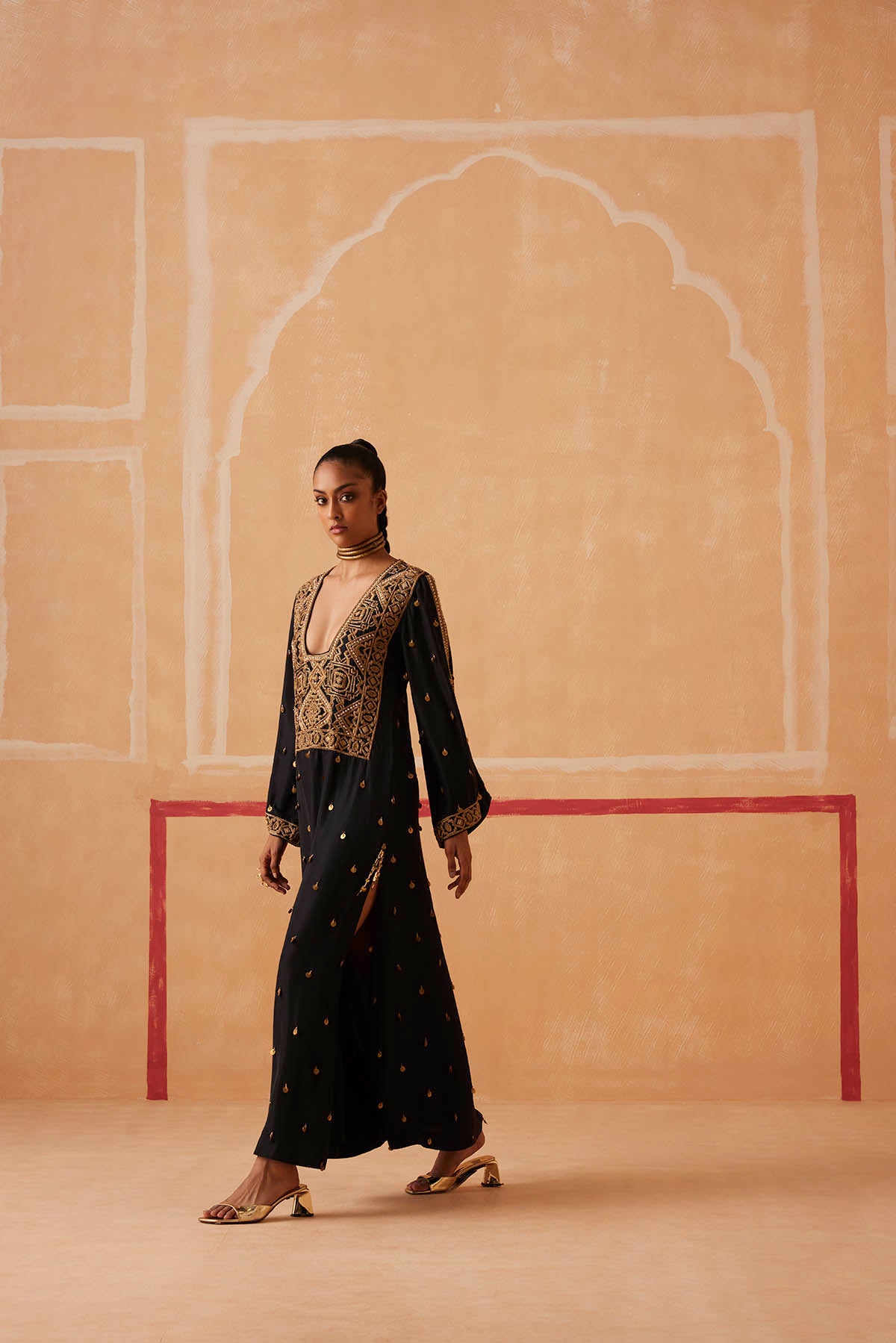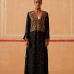 Whether it’s an intimate soiree or a celebration that lasts all night, our Hazrat Kaftan is all you need to exude elegance without compromising on comfort. The slit sleeves and straight silhouette celebrate the luxury of simplicity, while the antique gold zardozi work on the yoke elevates the outfit.