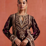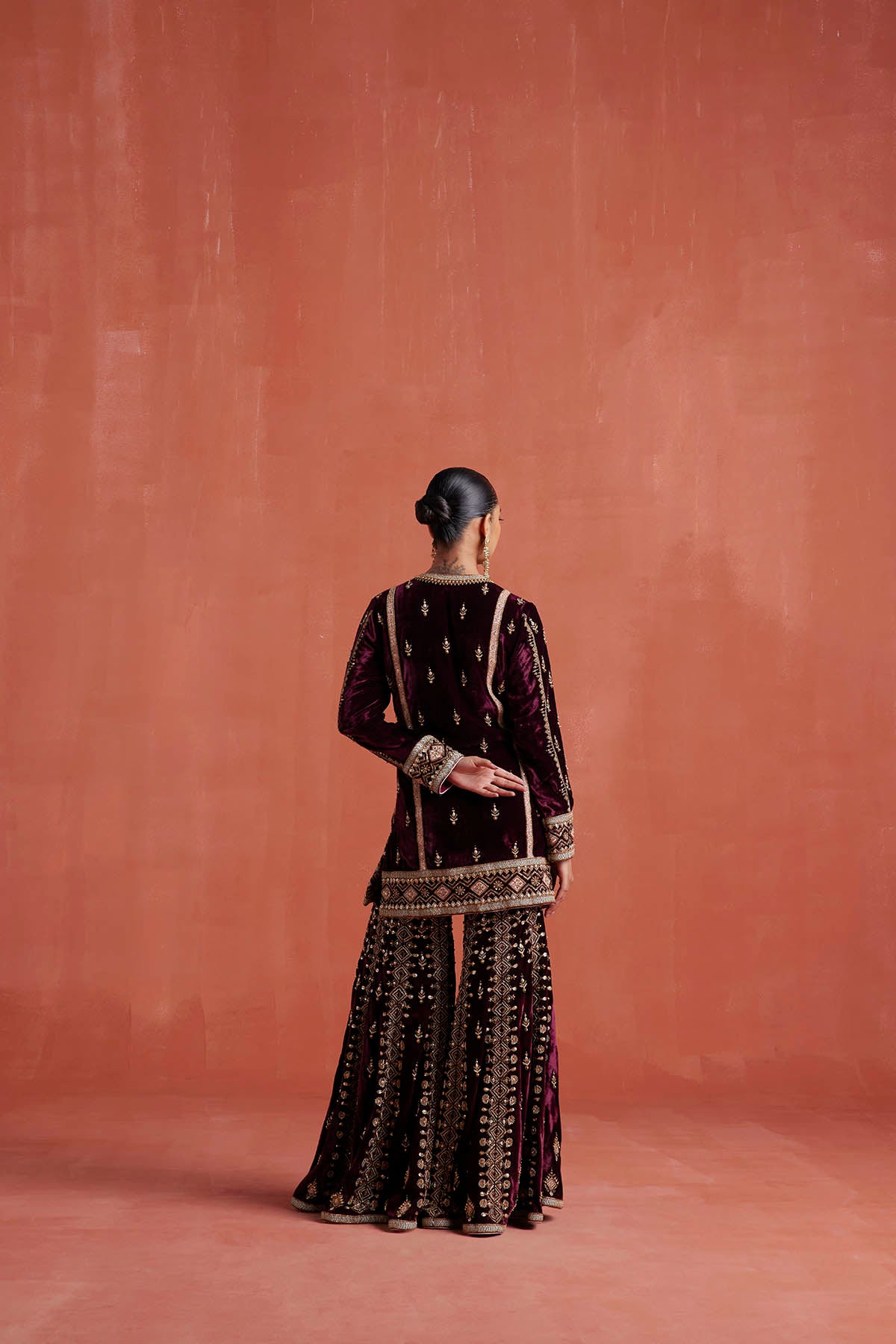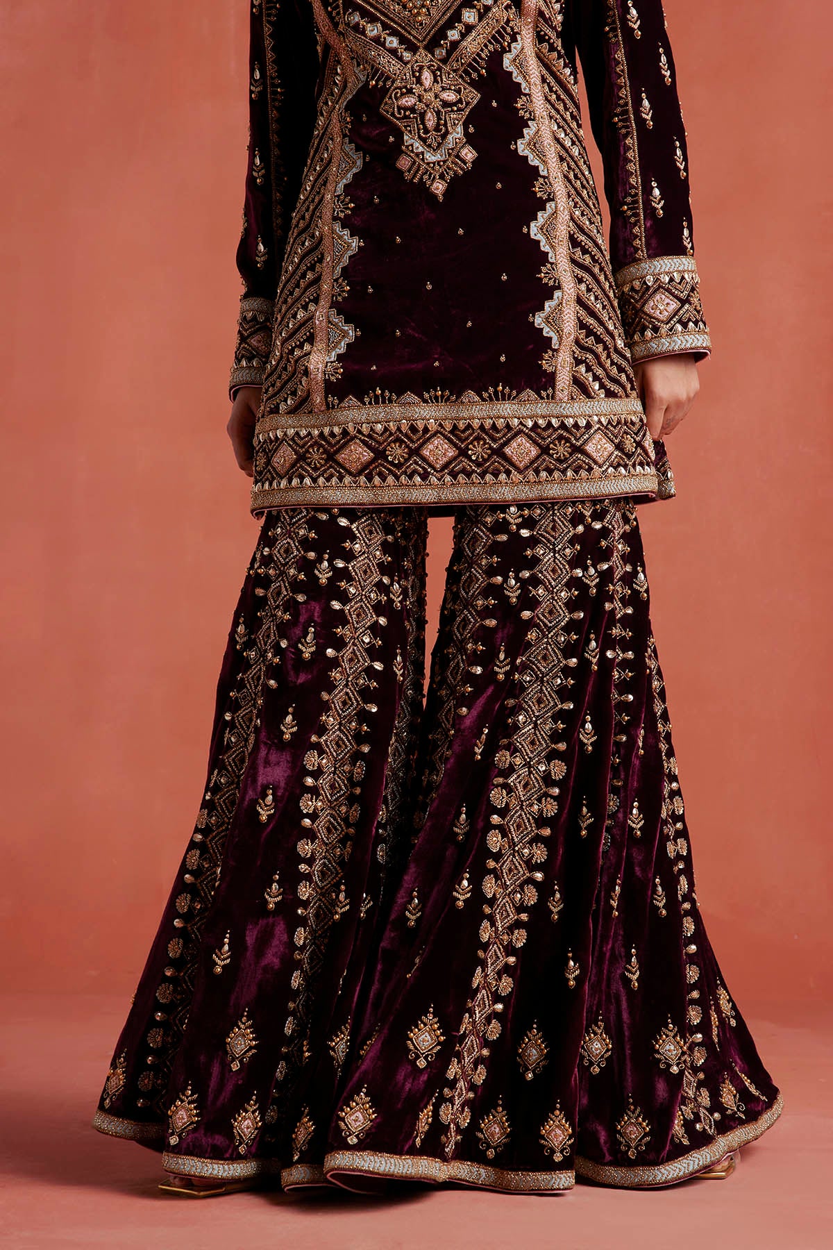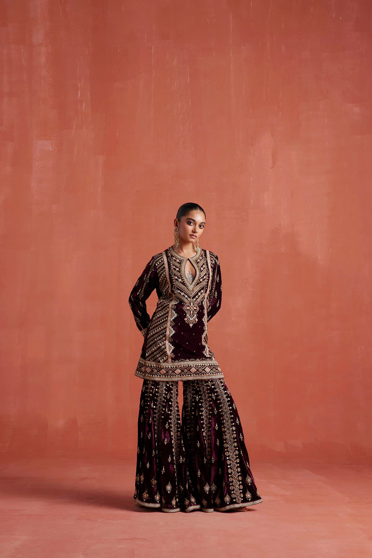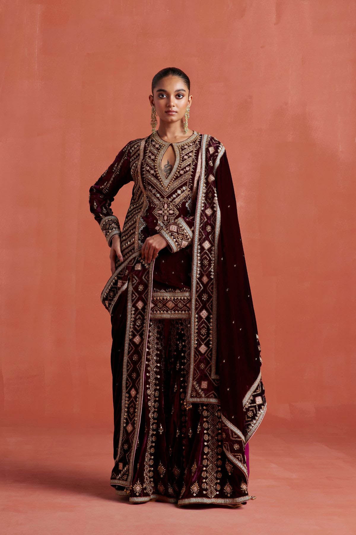 Your time to shine – This mulberry silk velvet gharara set perfectly captures the glory of an era gone by. Steeped in heritage, the ornate gharara and matching short kurta have been elevated with the use of intricate aari and zardozi work on contrasting applique patches. The dupatta borrows from mughal motifs that are reimagined into a border to complete the look.