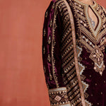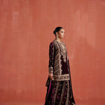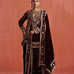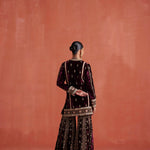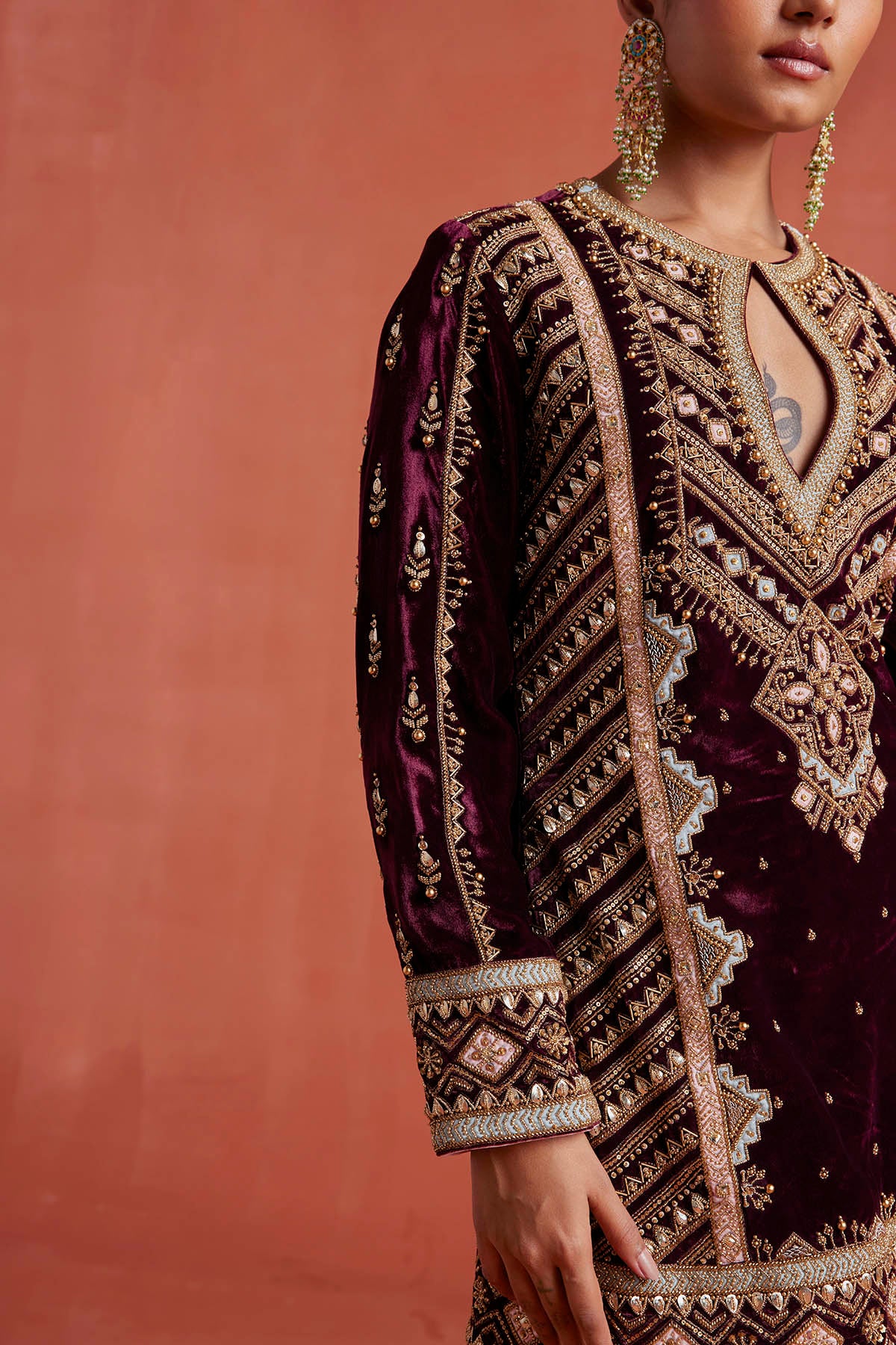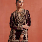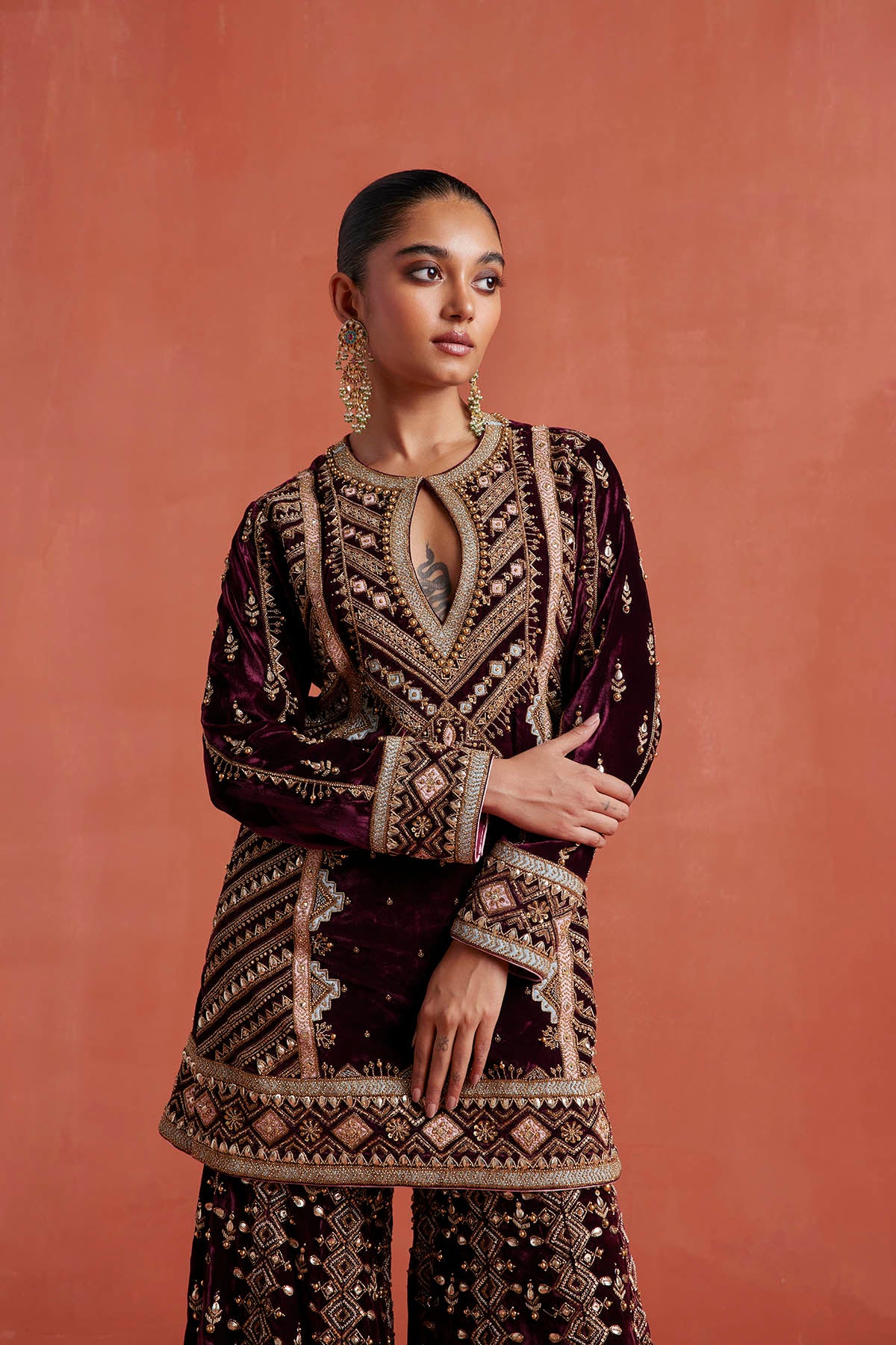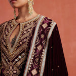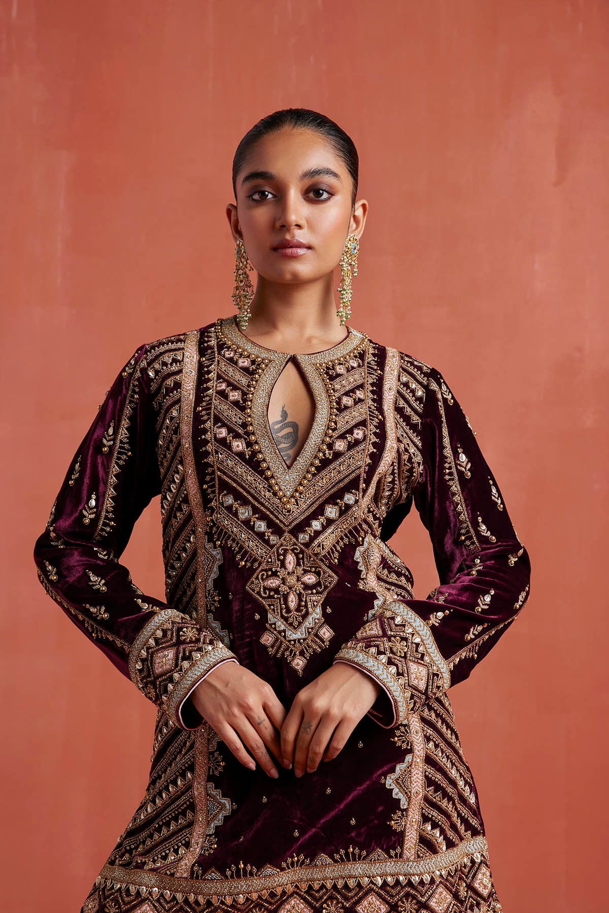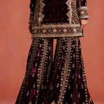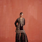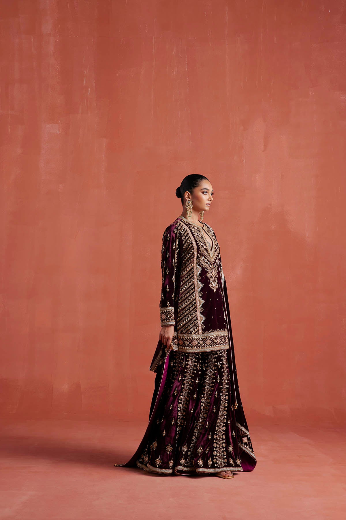 Your time to shine – This mulberry silk velvet gharara set perfectly captures the glory of an era gone by. Steeped in heritage, the ornate gharara and matching short kurta have been elevated with the use of intricate aari and zardozi work on contrasting applique patches. The dupatta borrows from mughal motifs that are reimagined into a border to complete the look.