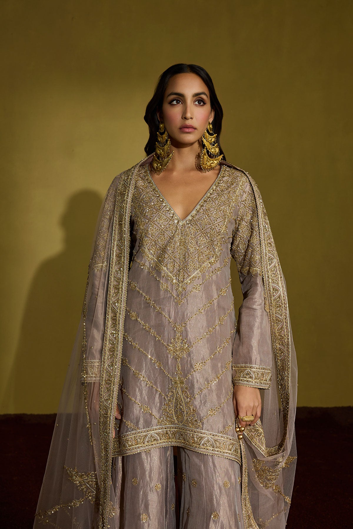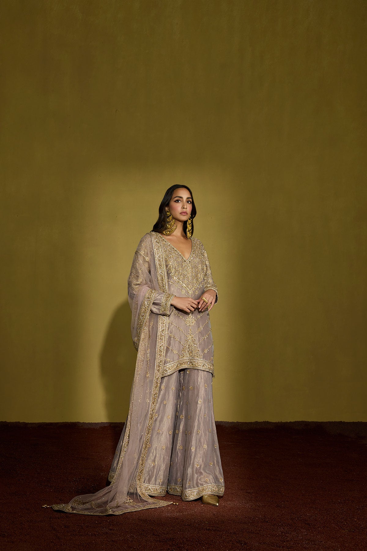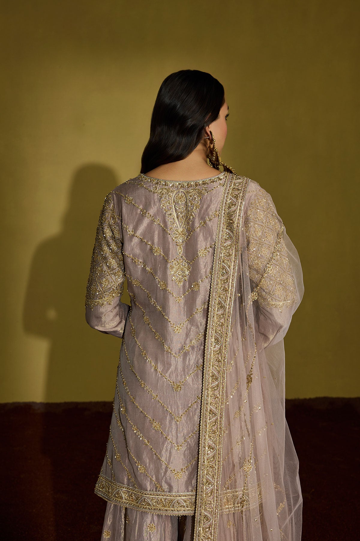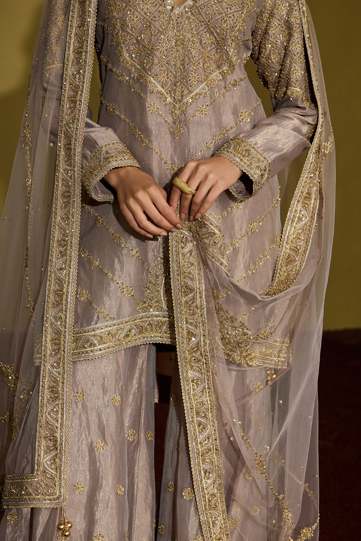 This gharara set pairs fluid tissue silk with a light-as-air net dupatta. The yoke is richly detailed with intricate handwork that extends along the sleeves, while the monotone palette shimmers with understated elegance. A beautiful choice for festive soirées and wedding celebrations alike.