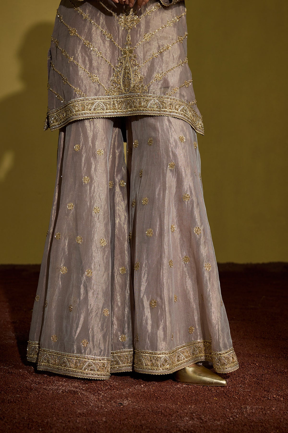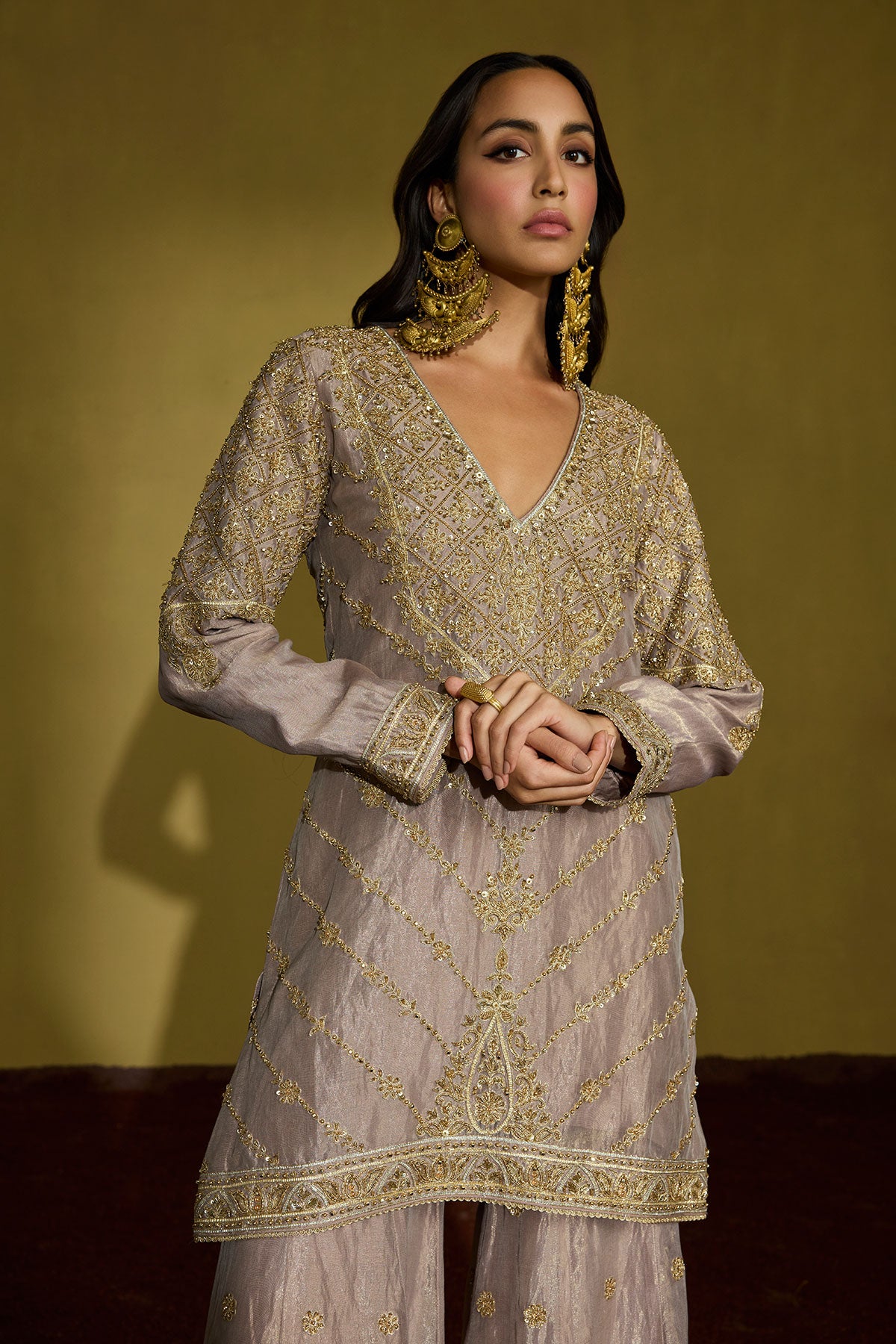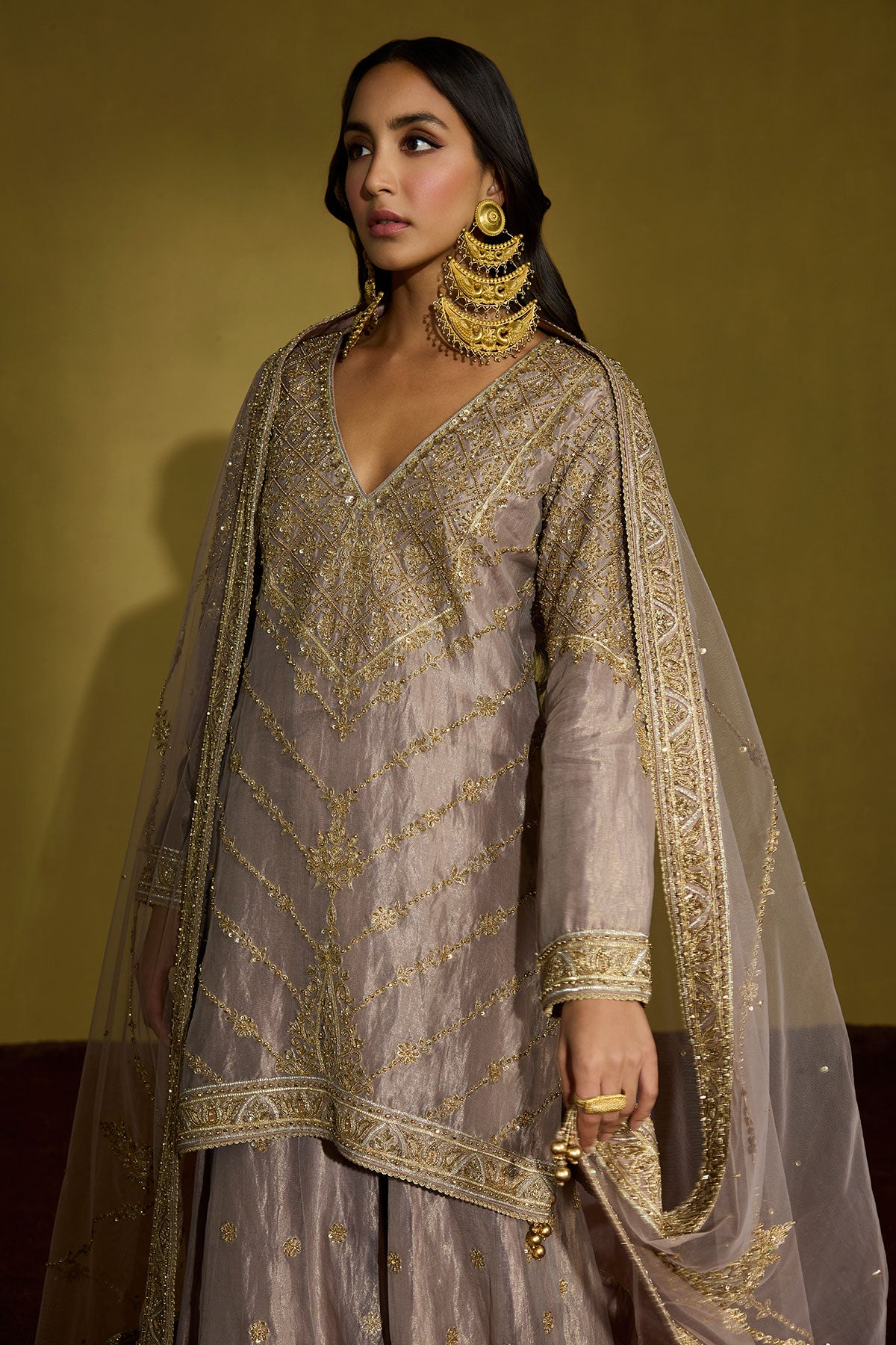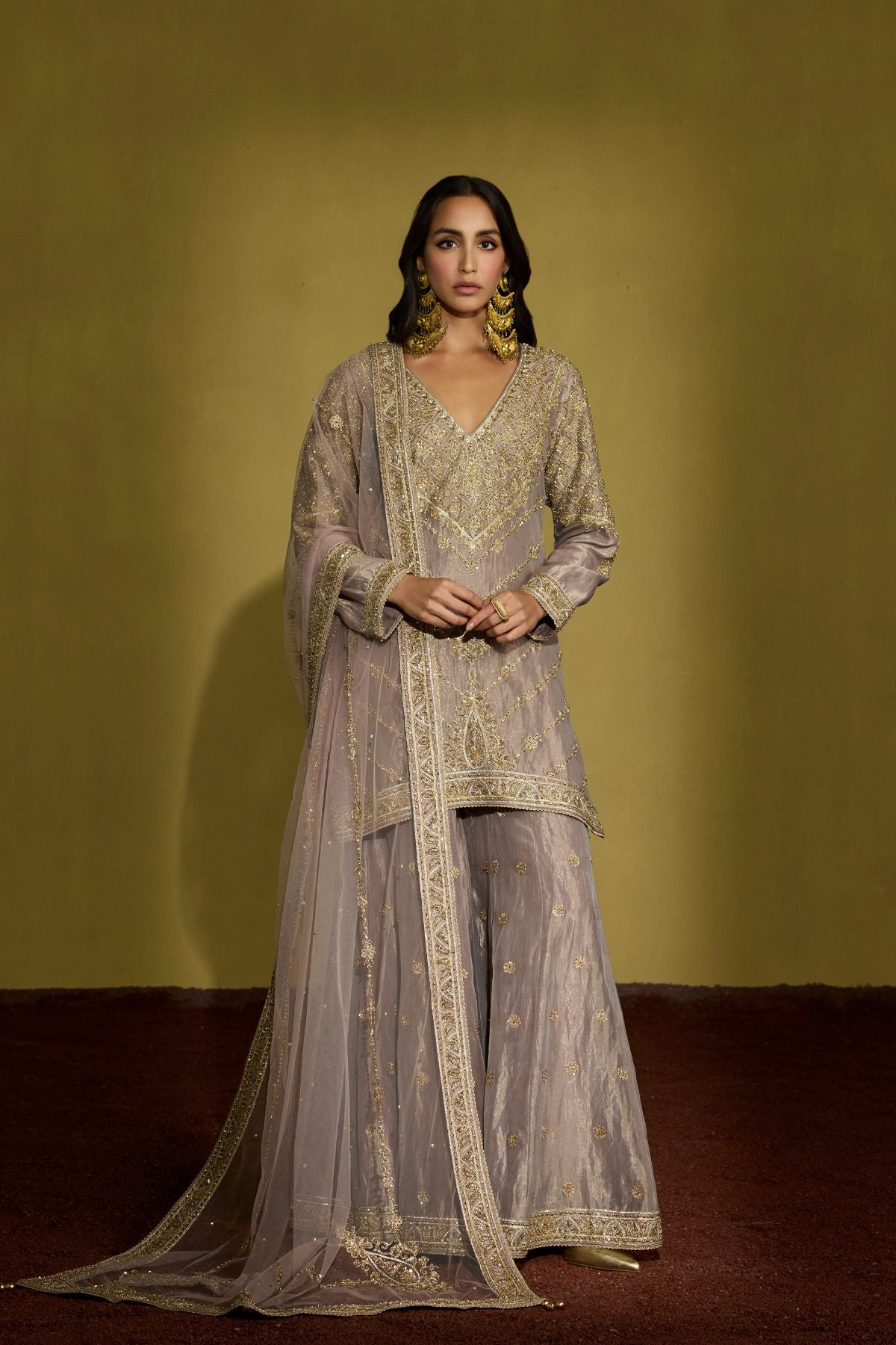 This gharara set pairs fluid tissue silk with a light-as-air net dupatta. The yoke is richly detailed with intricate handwork that extends along the sleeves, while the monotone palette shimmers with understated elegance. A beautiful choice for festive soirées and wedding celebrations alike.