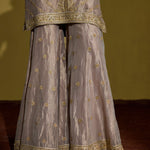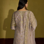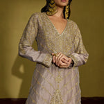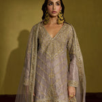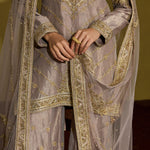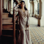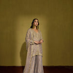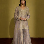 This gharara set pairs fluid tissue silk with a light-as-air net dupatta. The yoke is richly detailed with intricate handwork that extends along the sleeves, while the monotone palette shimmers with understated elegance. A beautiful choice for festive soirées and wedding celebrations alike.