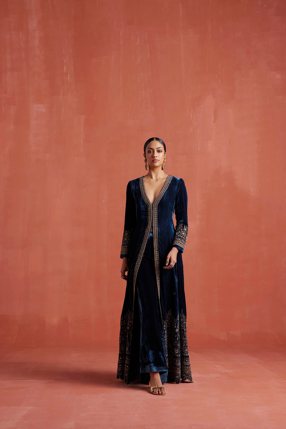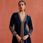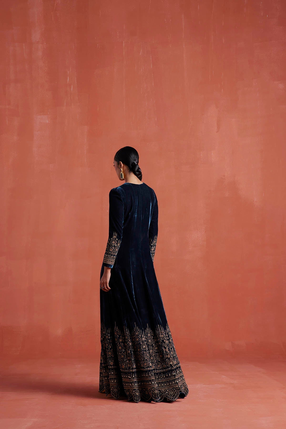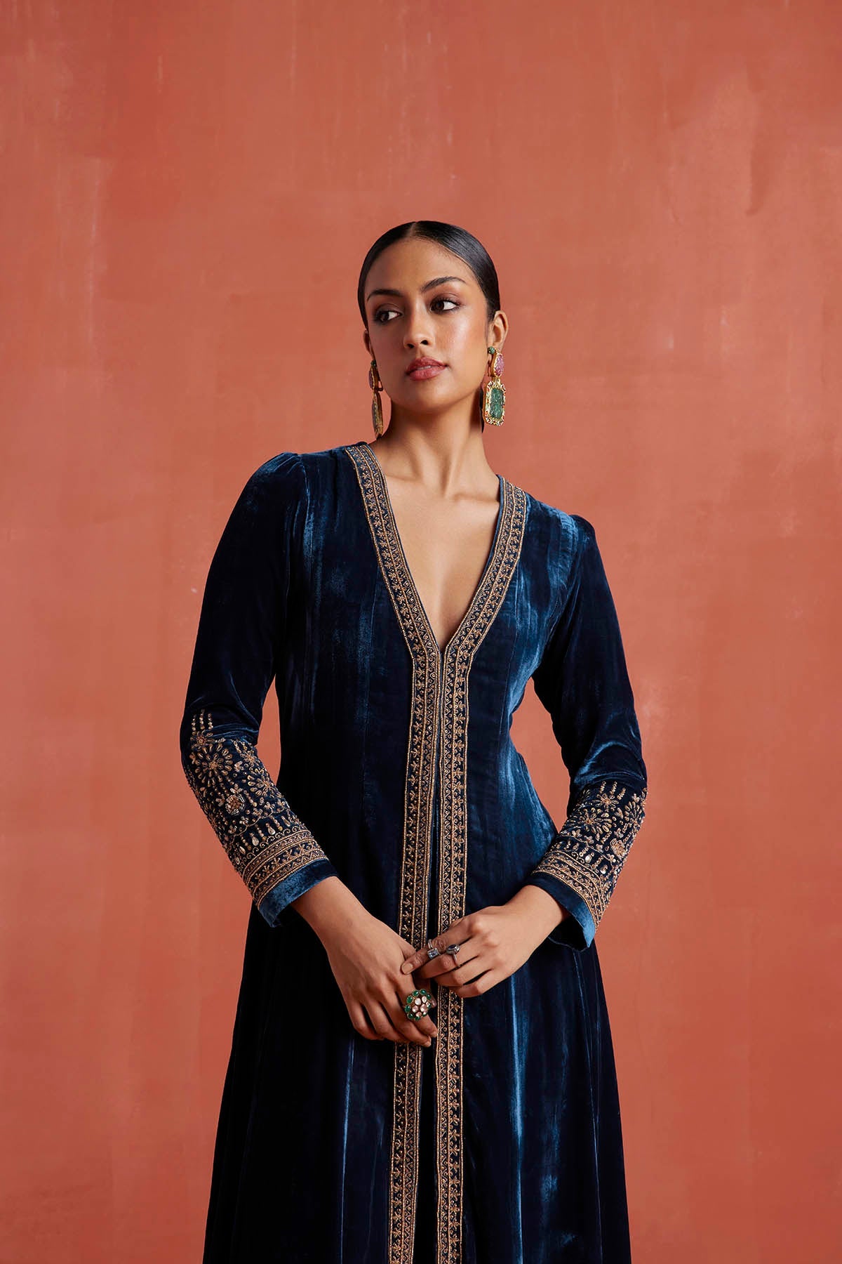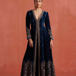 Step back in time – We’ve taken a regal silhouette from the Mughal era and kept its sanctity intact with our peacock blue silk velvet anarkali. Antique gold aari and zardozi work dress the neckline and hem, while the use of beads and sequins enhance the royal undertones of this piece. We’ve styled it without a dupatta to marry the age old with the contemporary.