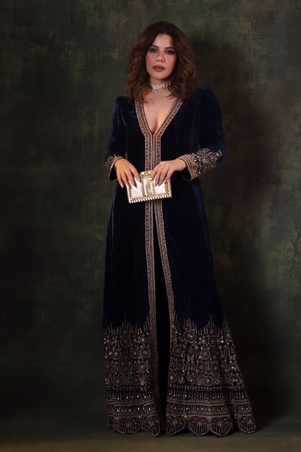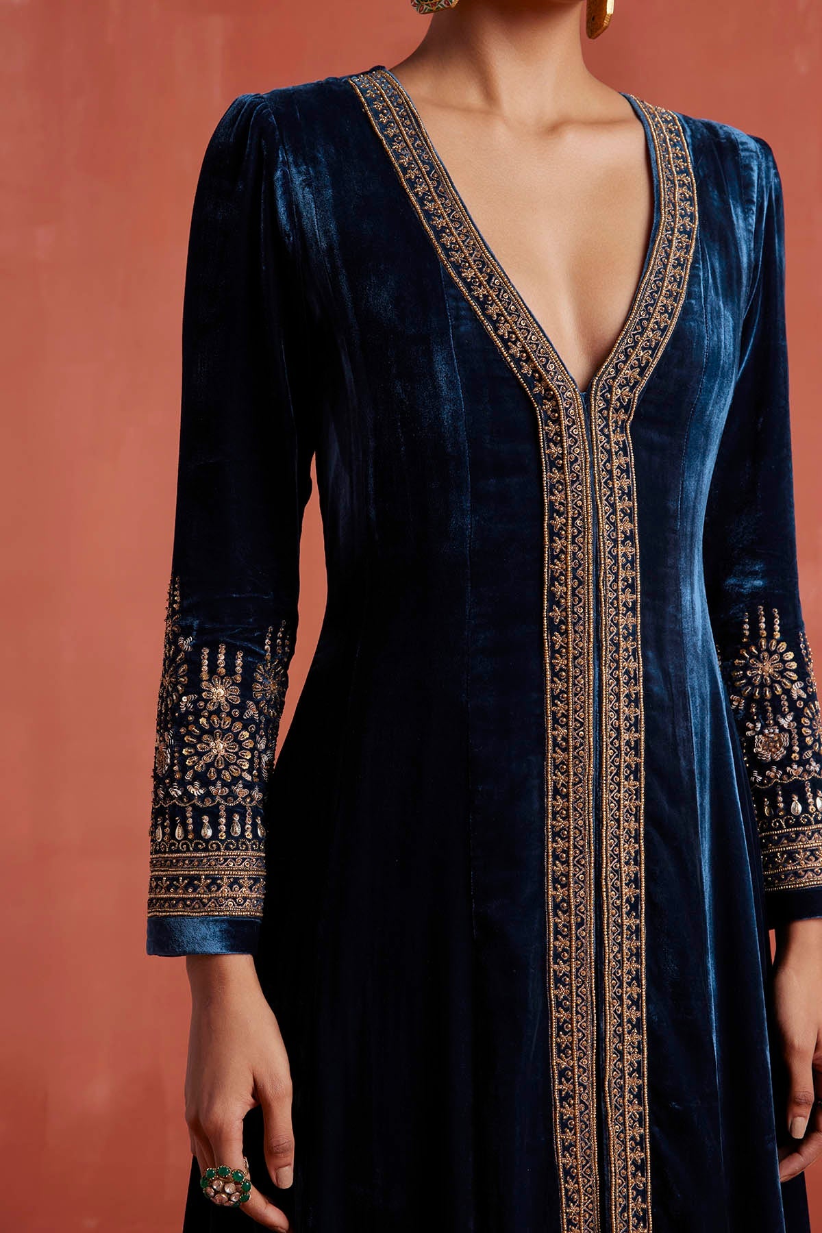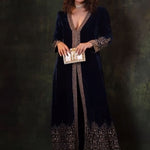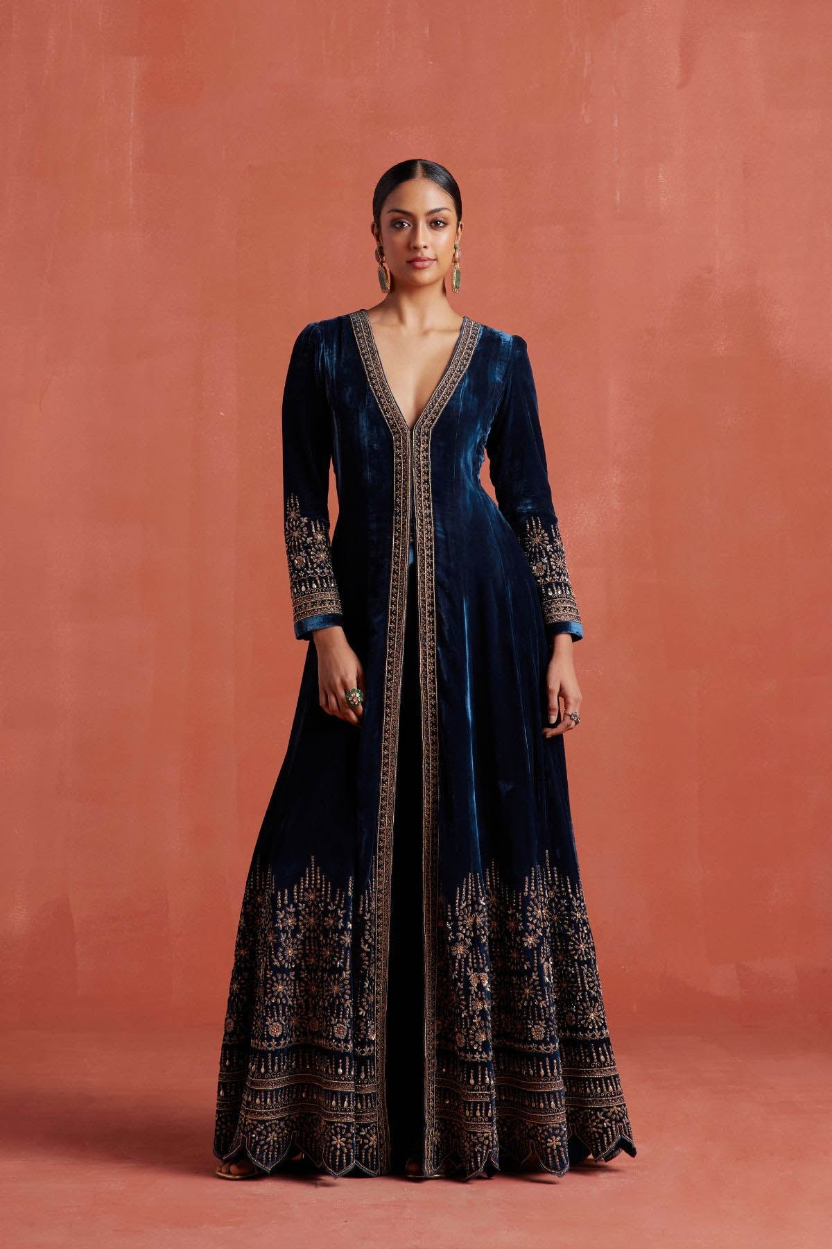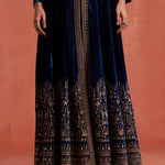 Step back in time – We’ve taken a regal silhouette from the Mughal era and kept its sanctity intact with our peacock blue silk velvet anarkali. Antique gold aari and zardozi work dress the neckline and hem, while the use of beads and sequins enhance the royal undertones of this piece. We’ve styled it without a dupatta to marry the age old with the contemporary.