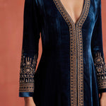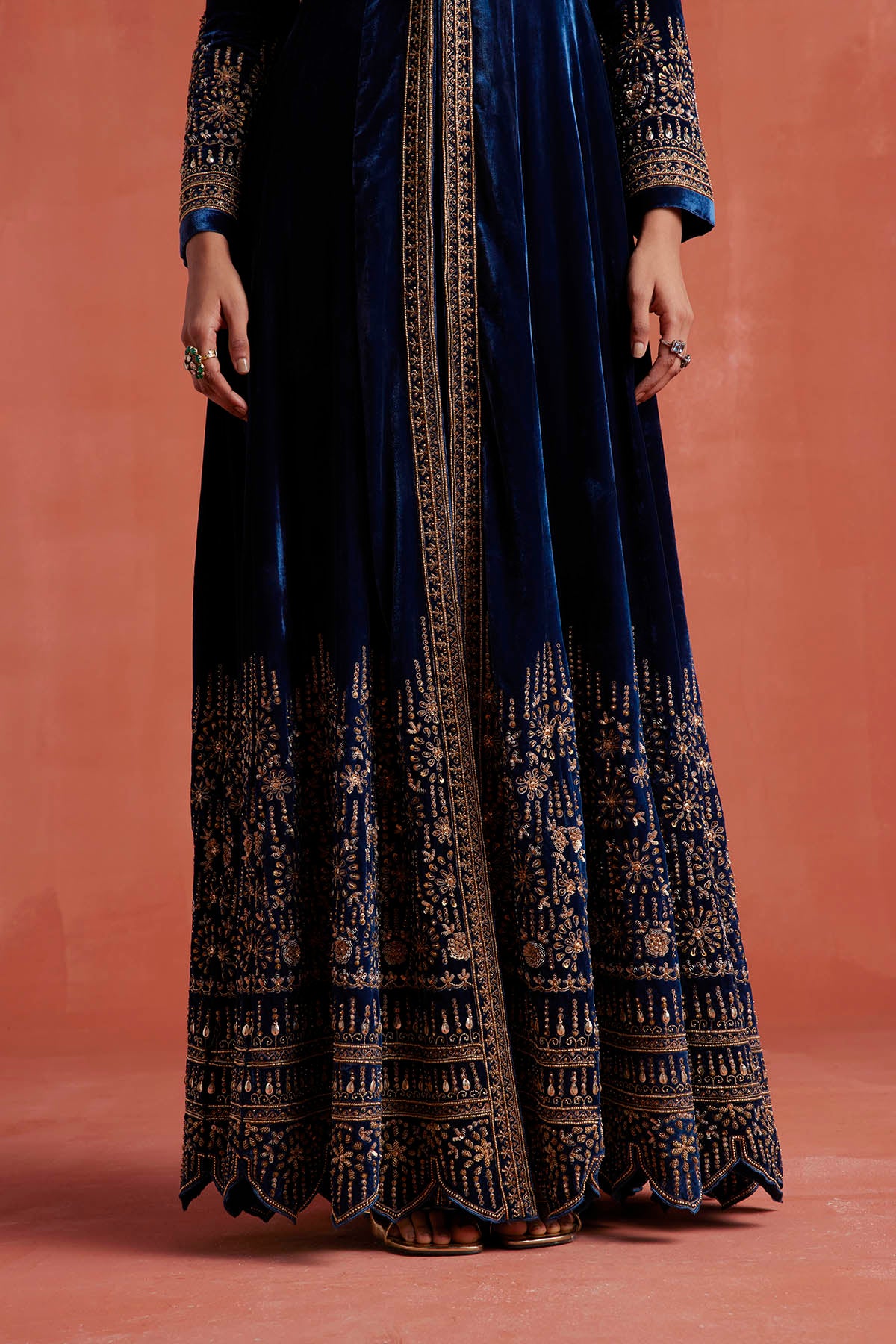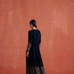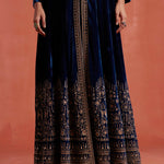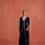 Step back in time – We’ve taken a regal silhouette from the Mughal era and kept its sanctity intact with our peacock blue silk velvet anarkali. Antique gold aari and zardozi work dress the neckline and hem, while the use of beads and sequins enhance the royal undertones of this piece. We’ve styled it without a dupatta to marry the age old with the contemporary.
