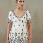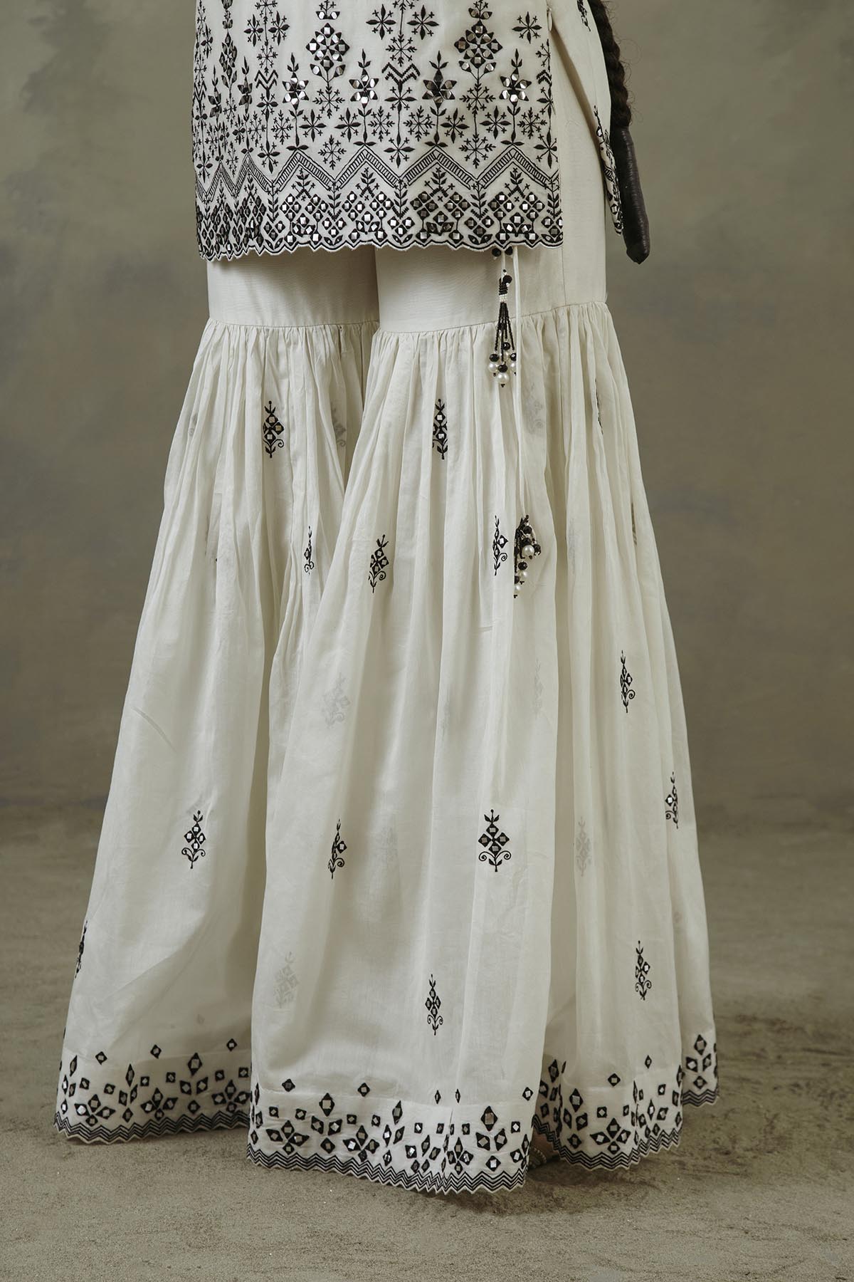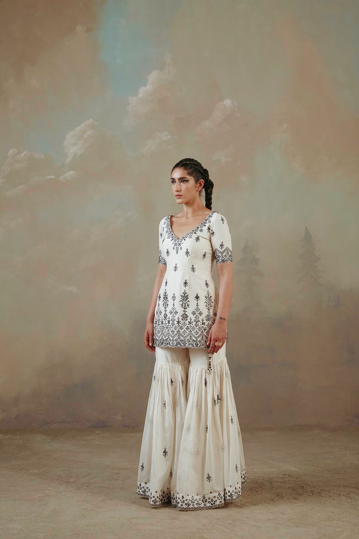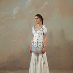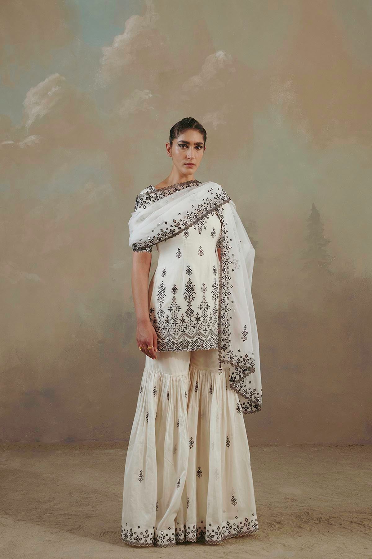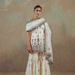 Ivory Extravaganza – a perfectly embellished fitted short kurta comes paired with a voluminous embroidered gharara. The set features a mix of intricate aari thread work along with delicate mirrors to add a sophisticated touch of bling. Complete the look with our sheer organza dupatta that is edged on all sides with matching thread and mirror work along with matching motifs spread across the surface.