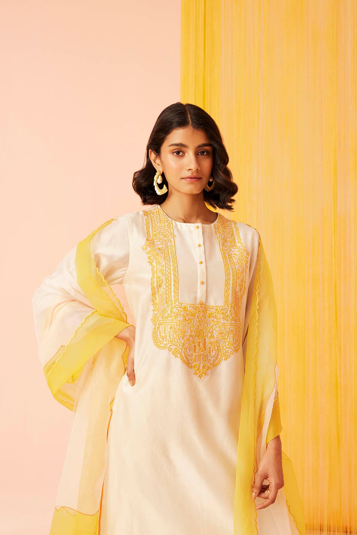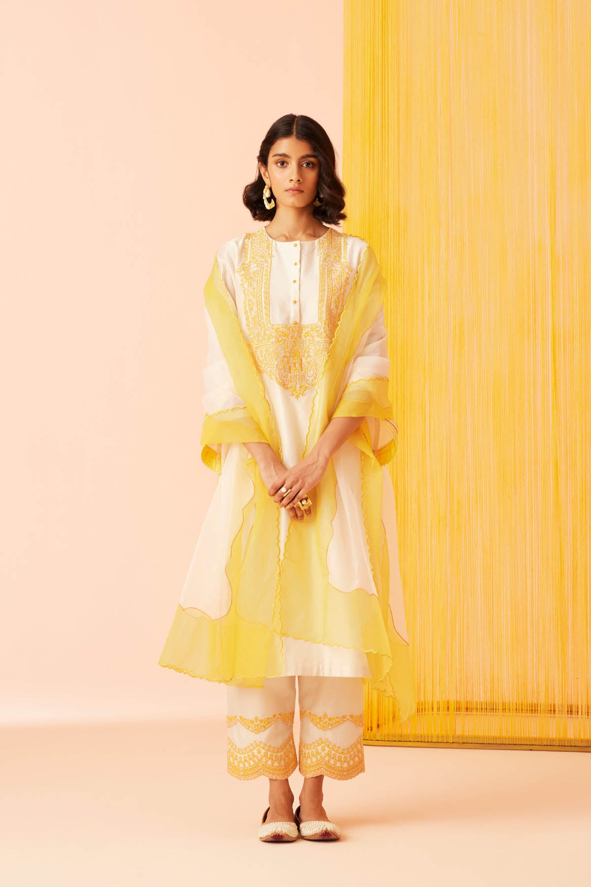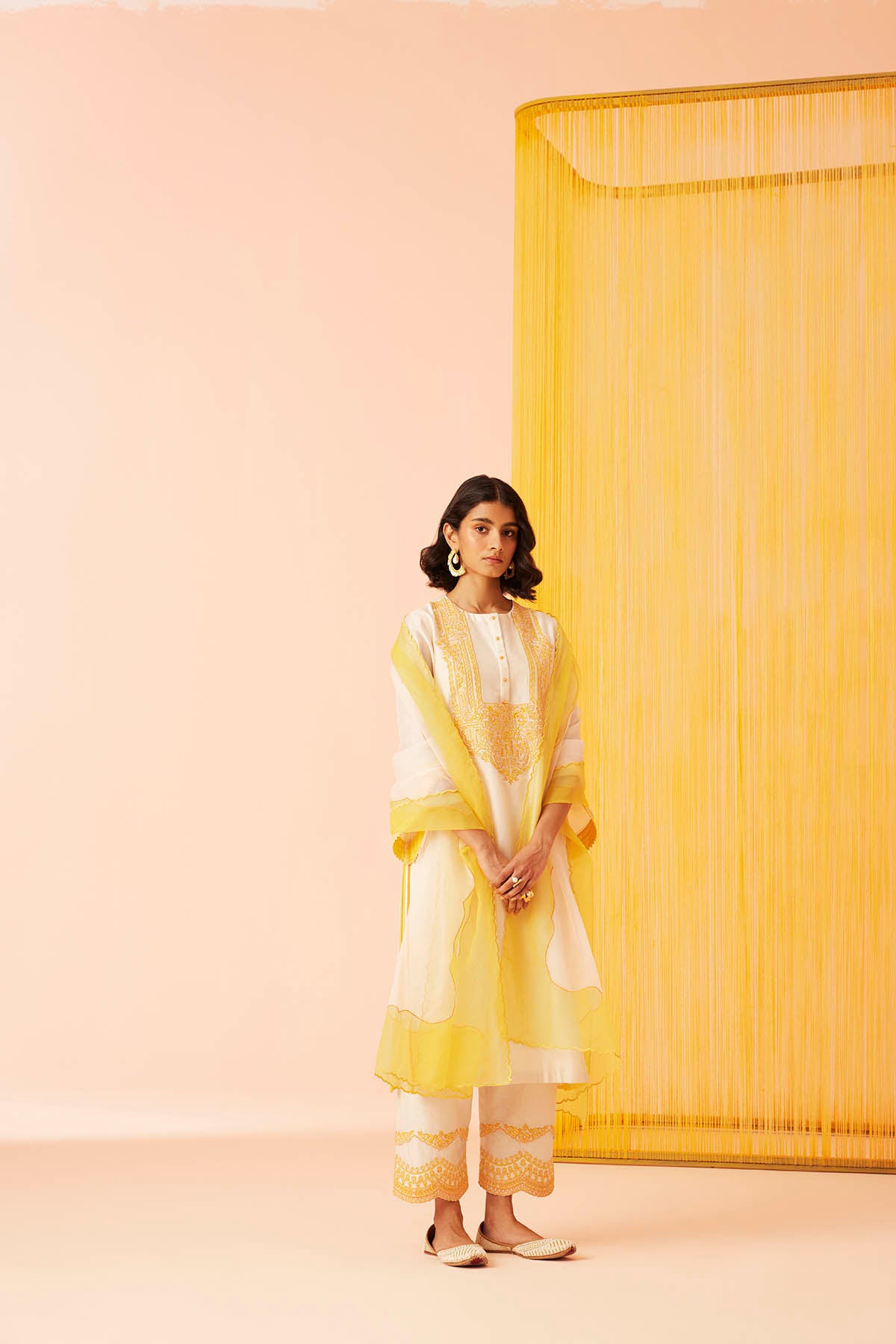This ivory kurta set is a timeless beauty with intricate yellow and orange resham embroidery on the yoke. The bell sleeves with lace detailing add a touch of sophistication to the look. The scalloped palazzos with matching embroidery and the sheer organza dupatta complete the outfit perfectly. This is your ideal AM to PM look.