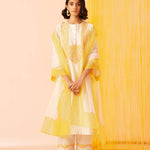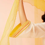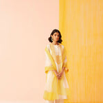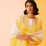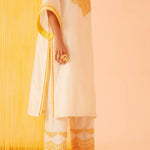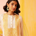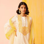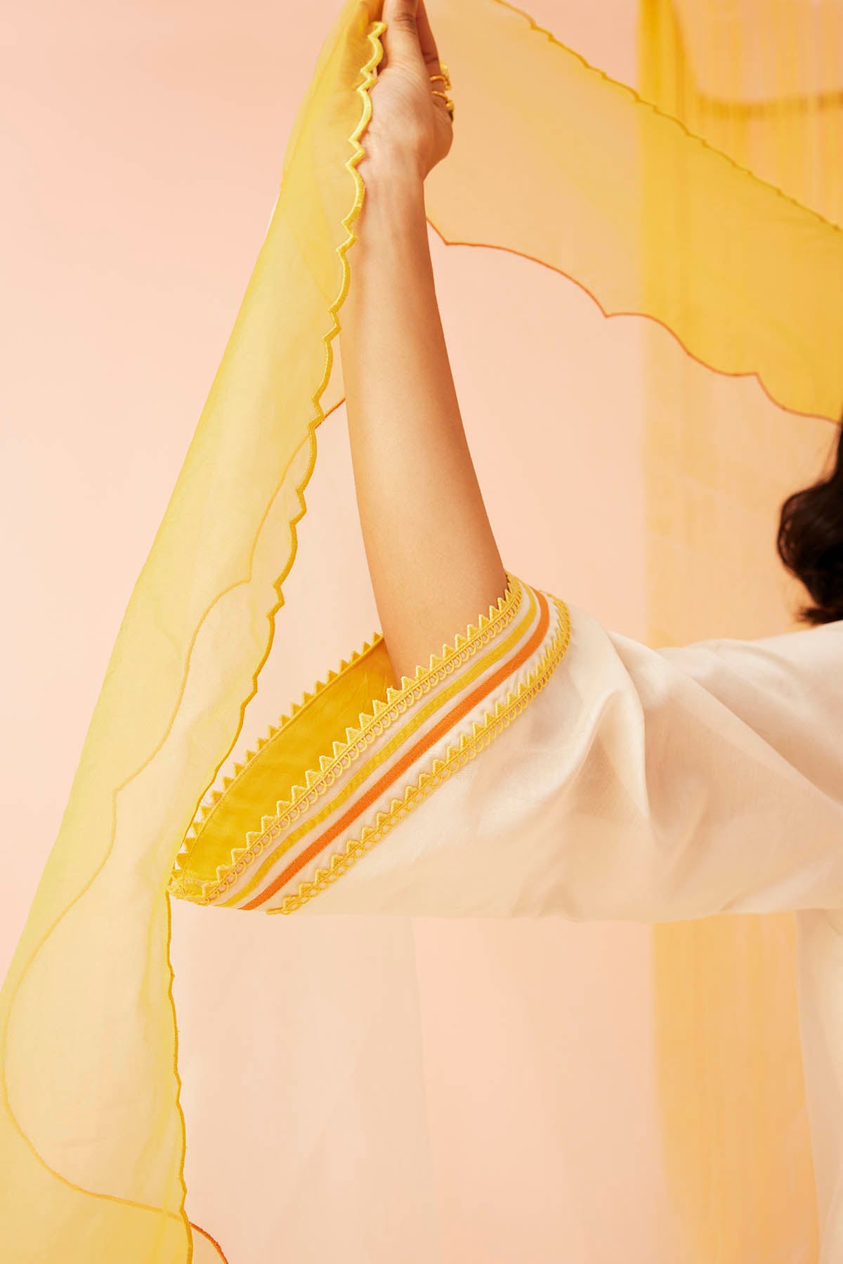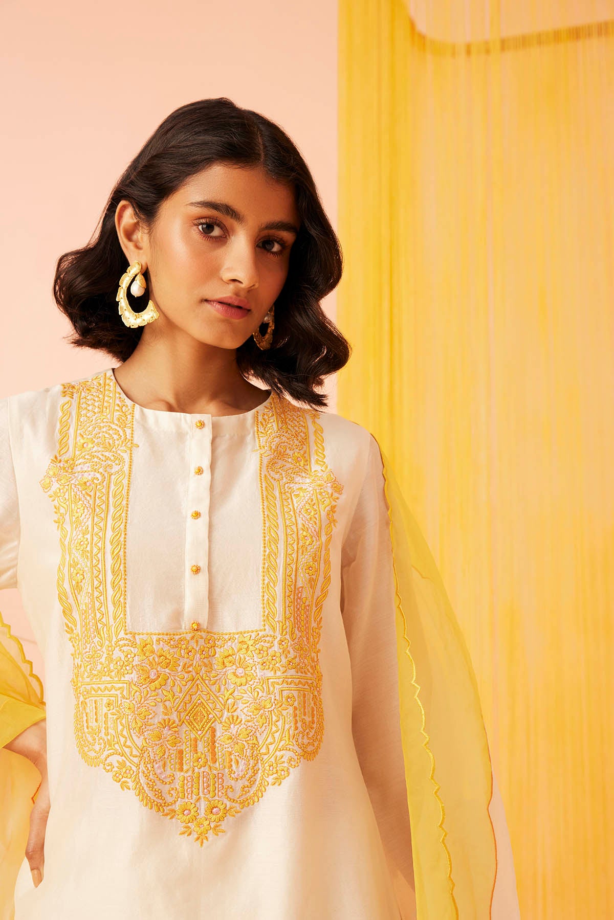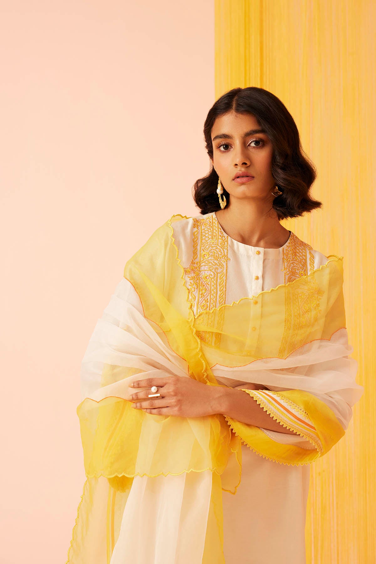 This ivory kurta set is a timeless beauty with intricate yellow and orange resham embroidery on the yoke. The bell sleeves with lace detailing add a touch of sophistication to the look. The scalloped palazzos with matching embroidery and the sheer organza dupatta complete the outfit perfectly. This is your ideal AM to PM look.