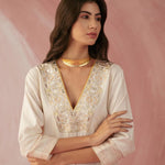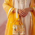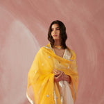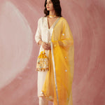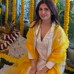 A timeless little gem – this ivory and yellow number comes with expertly cut straight narrow pants (detailed at the hem), a sharp A-line kurta with a plunging neckline and a contrast yellow embroidered dupatta. The neckline features geometric gota patterns placed to perfection. Simple does it!