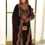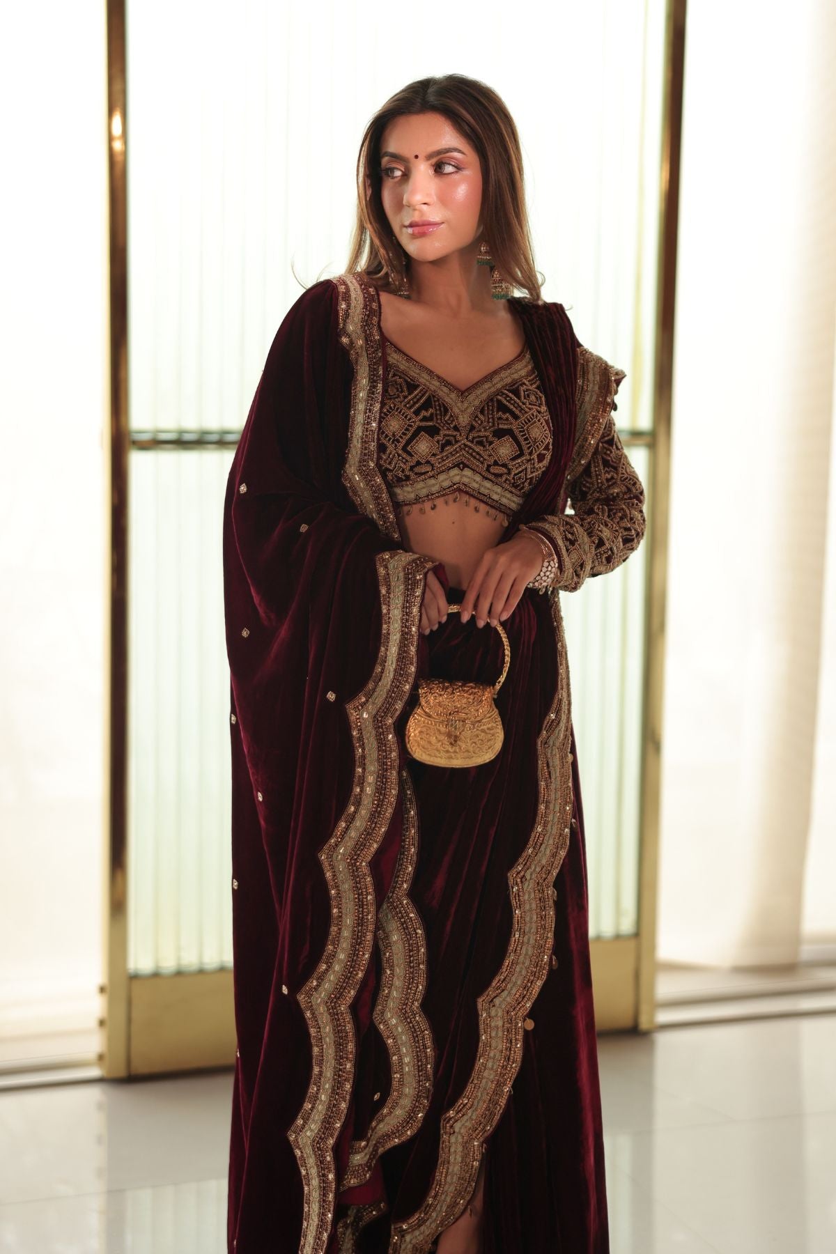 Present perfect – Meet the pre-draped saree, our new spotlight-stealing silhouette for the season. It captures all the time-honoured elegance of a classic saree, elevated with the ease of a pre-stitched drape. The romantic burgundy base of the blouse is enhanced with intricate aari and zardozi antique gold handwork. The drape is scalloped to perfection and getting in and out of a saree has just never been easier.
