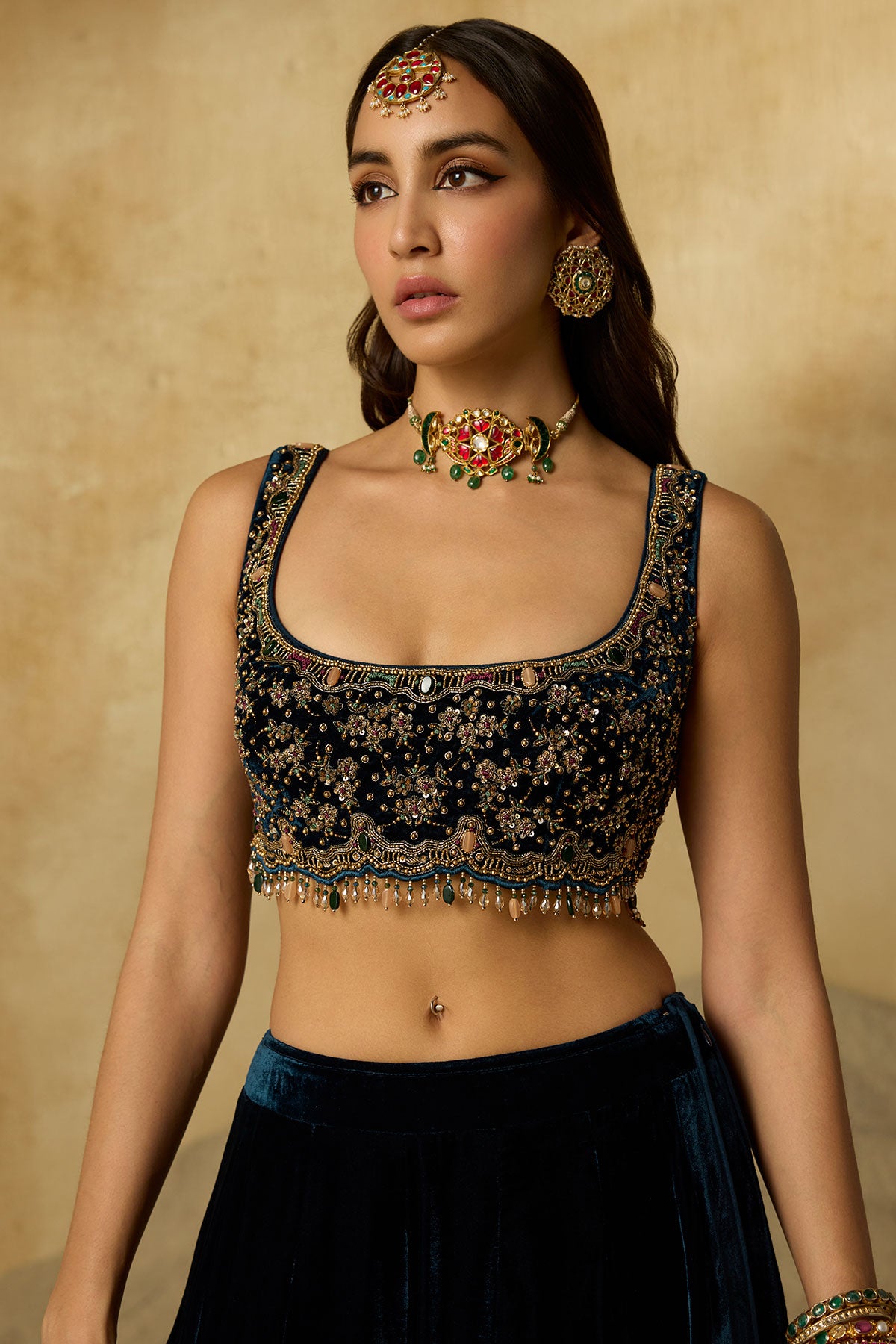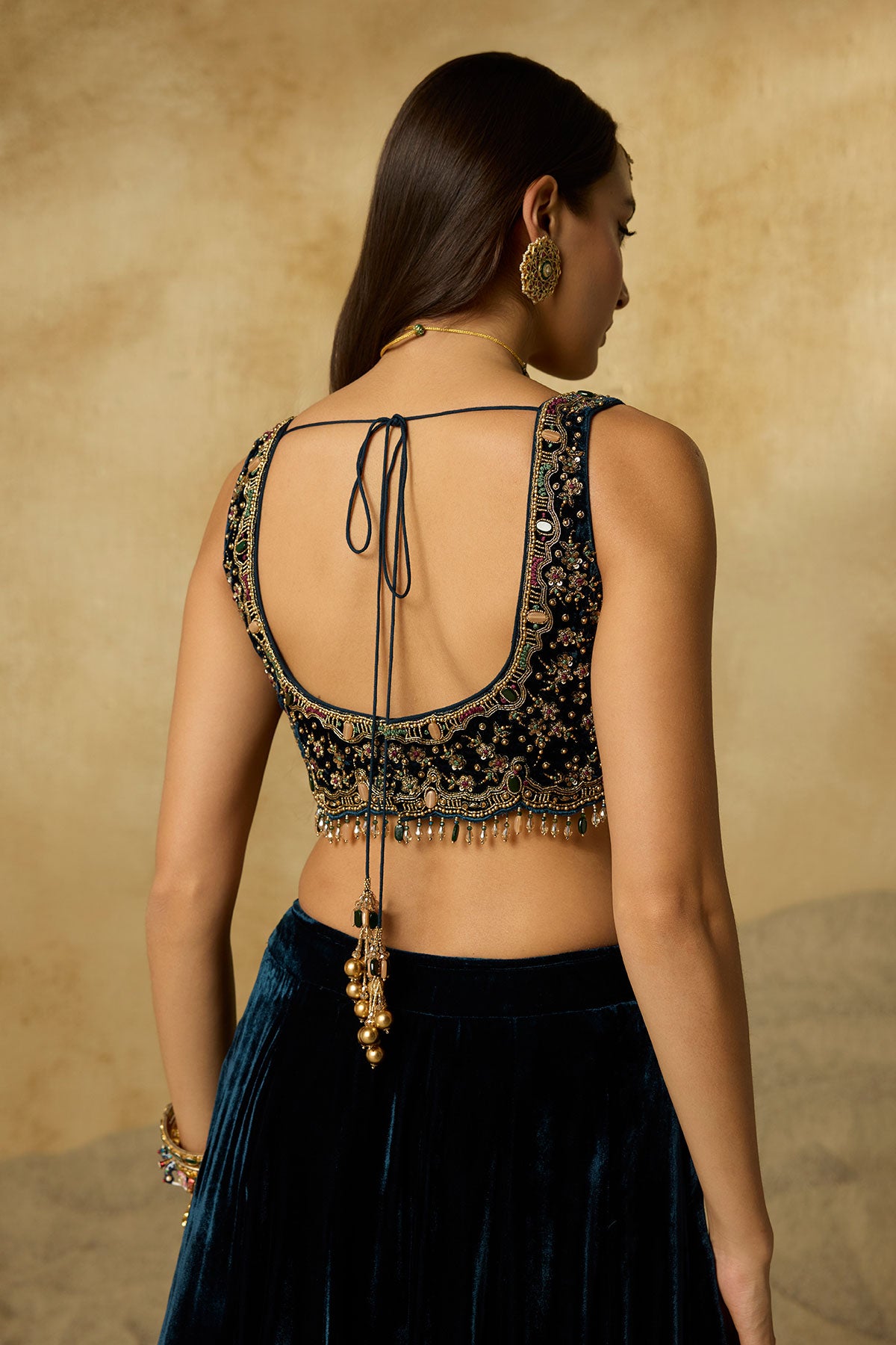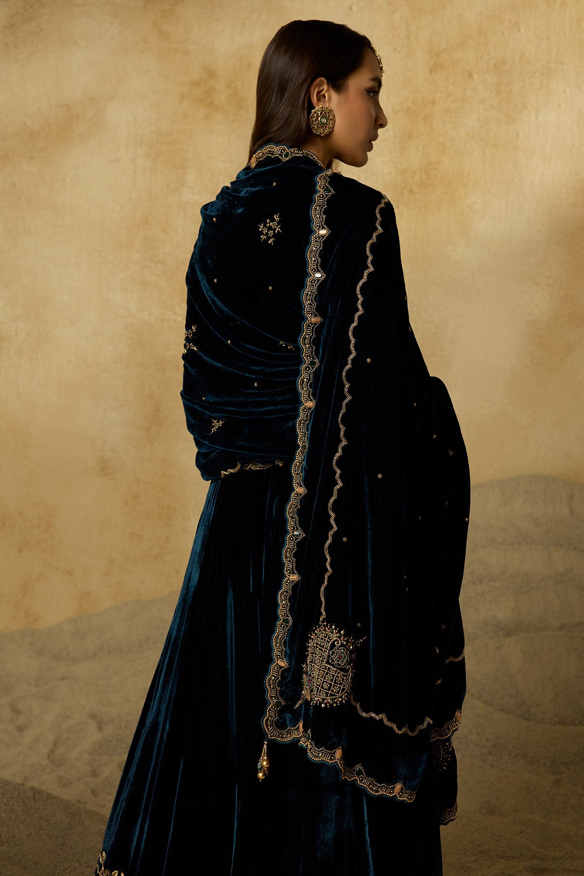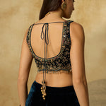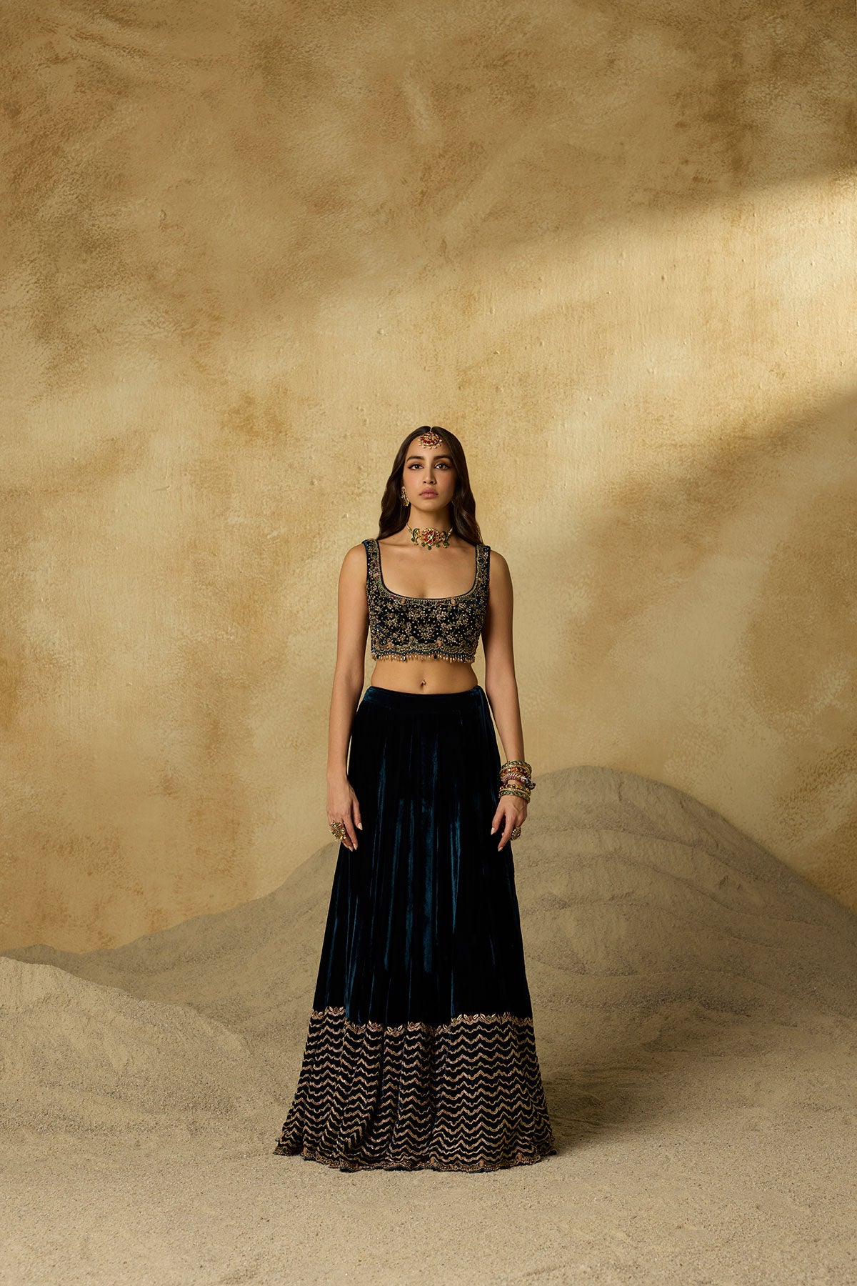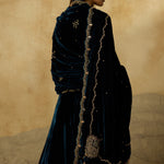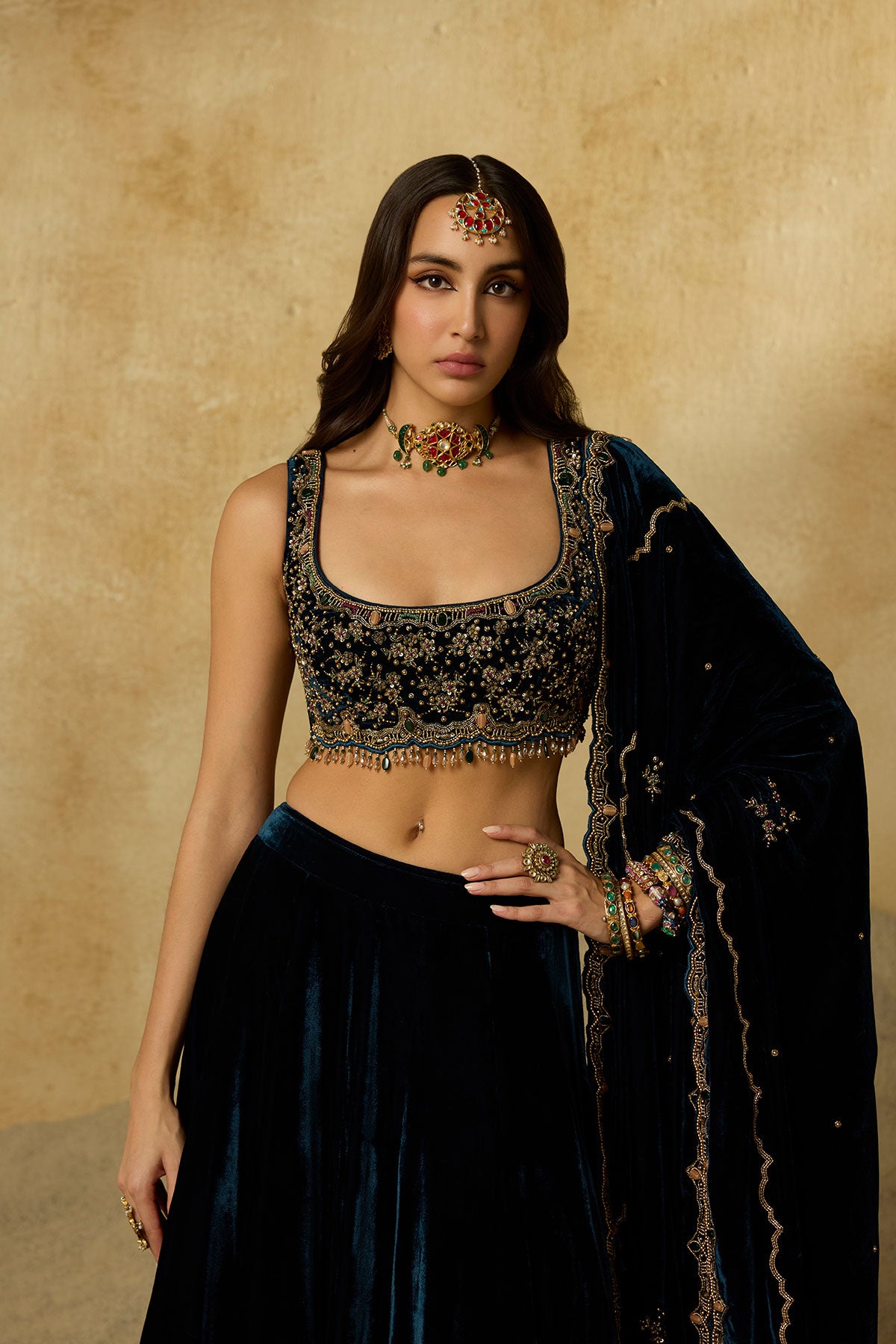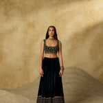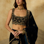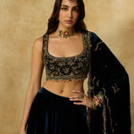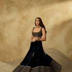 A lehenga made to be cherished season after season. Its deep peacock blue base is detailed with zig-zag handwork on the hem, while the strapless blouse blooms with intricate floral motifs. Paired with a tone-on-tone dupatta, it’s an ensemble where every detail makes a statement.