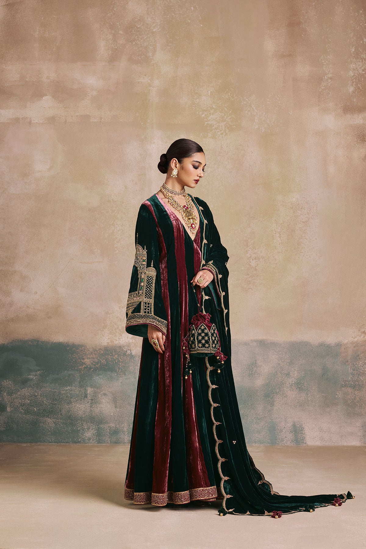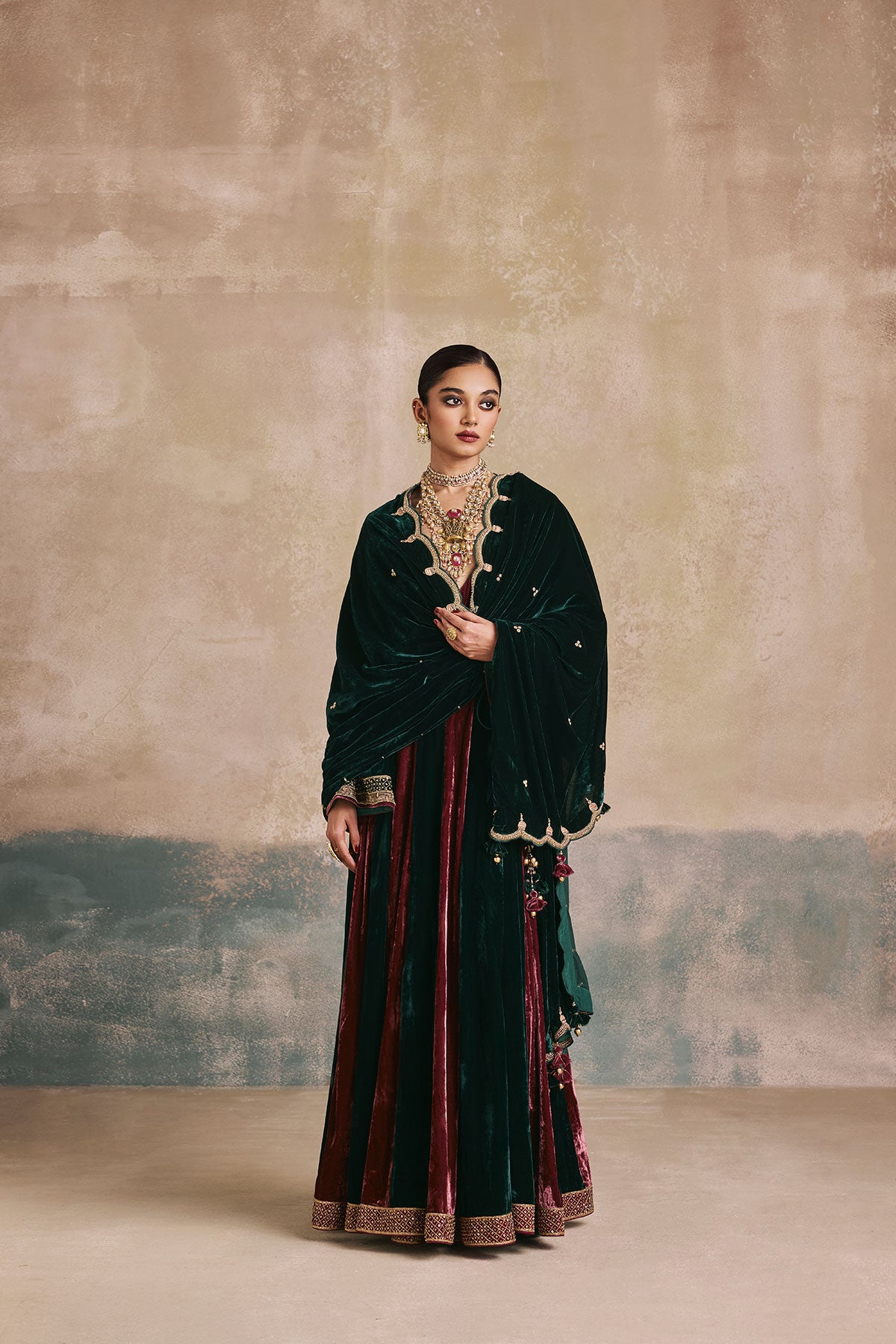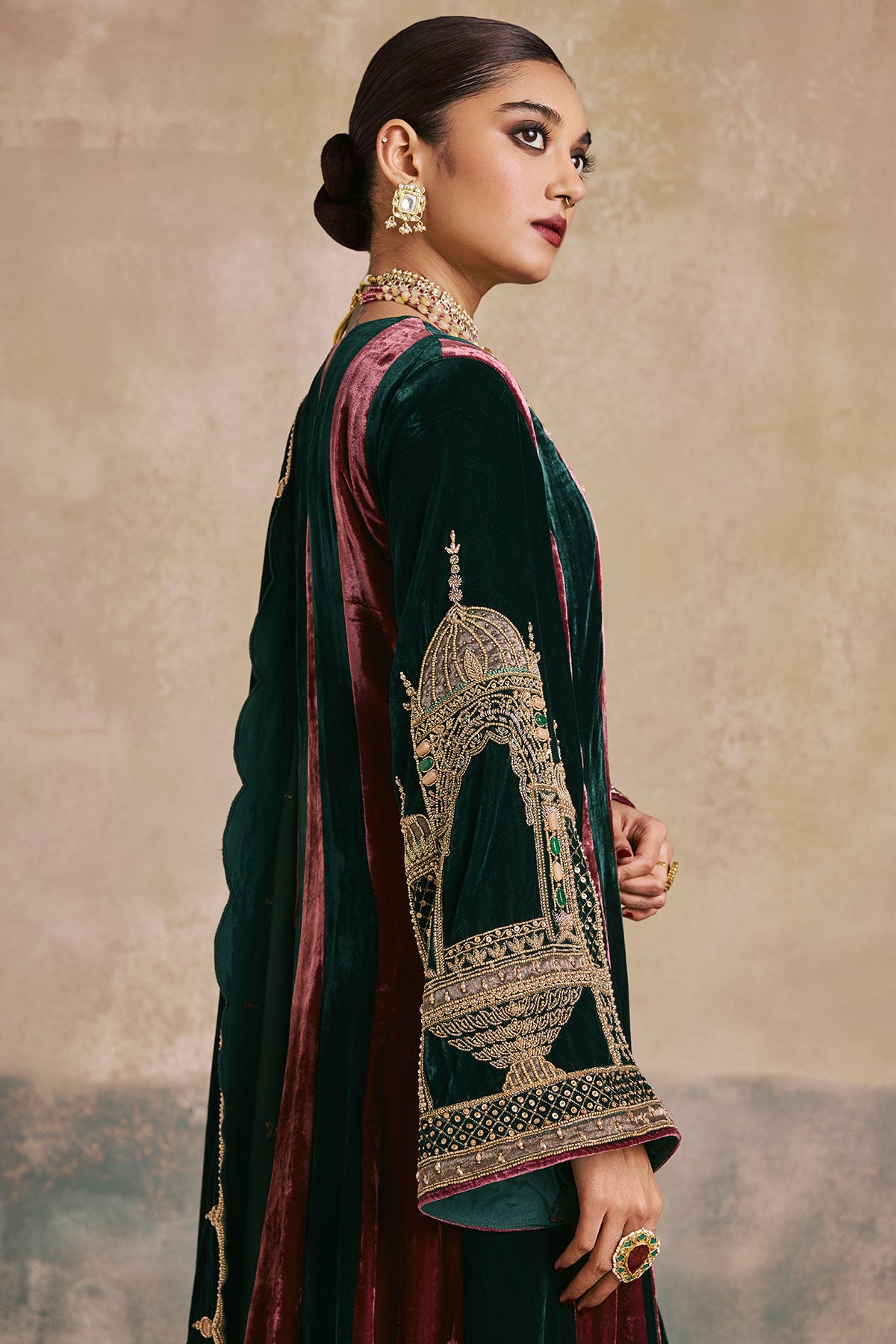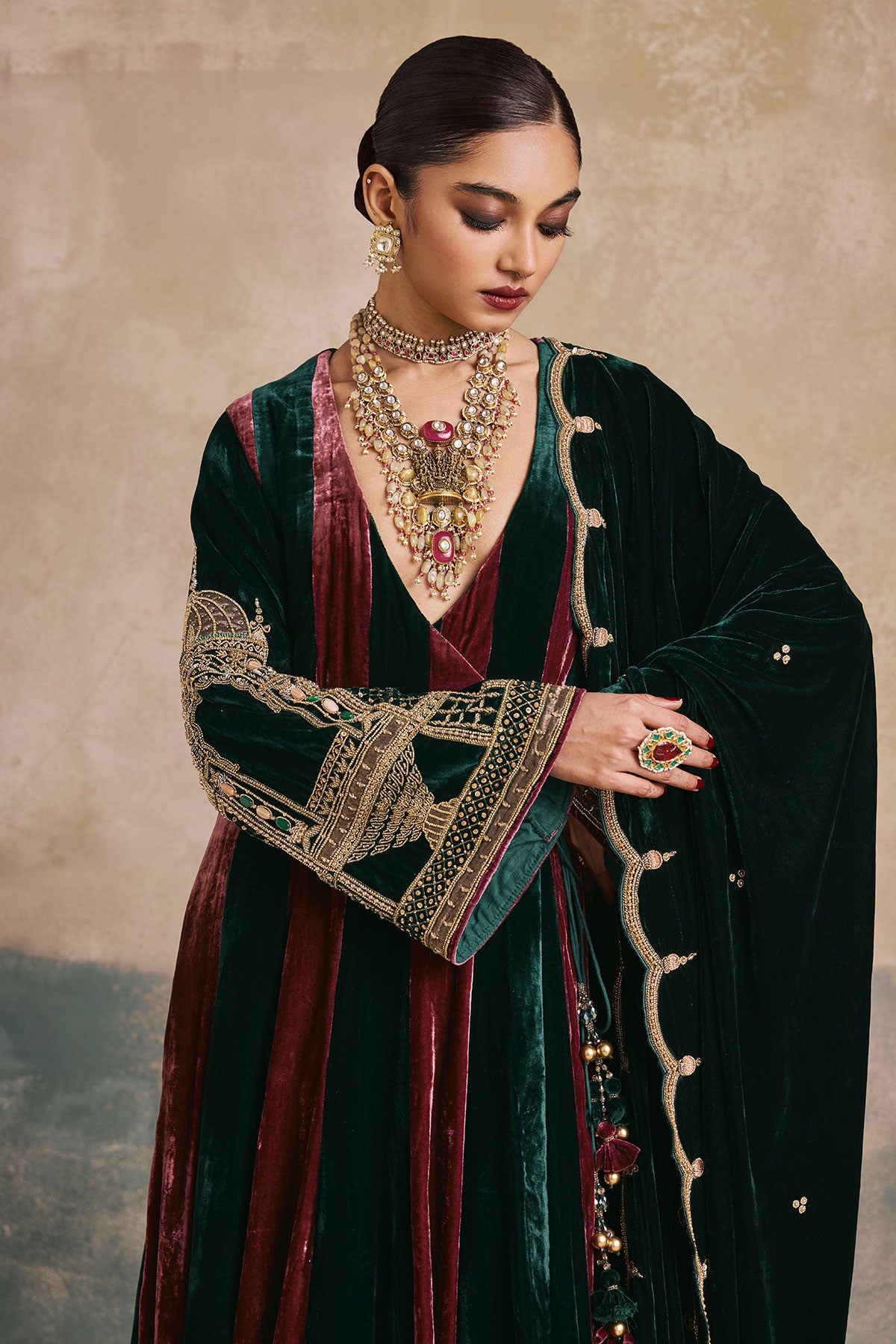 The Jahanara Anarkali Set reimagines luxury with its patched two-tone velvet in wine and bottle green. Flowing scalloped embroidery and antique heritage detailing make this angrakha silhouette an artistic treasure—crafted for generations to cherish.