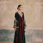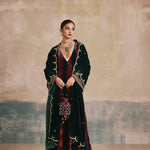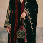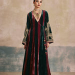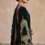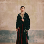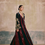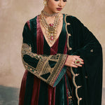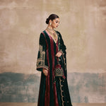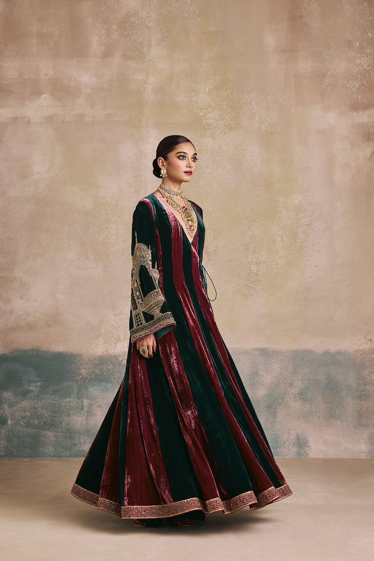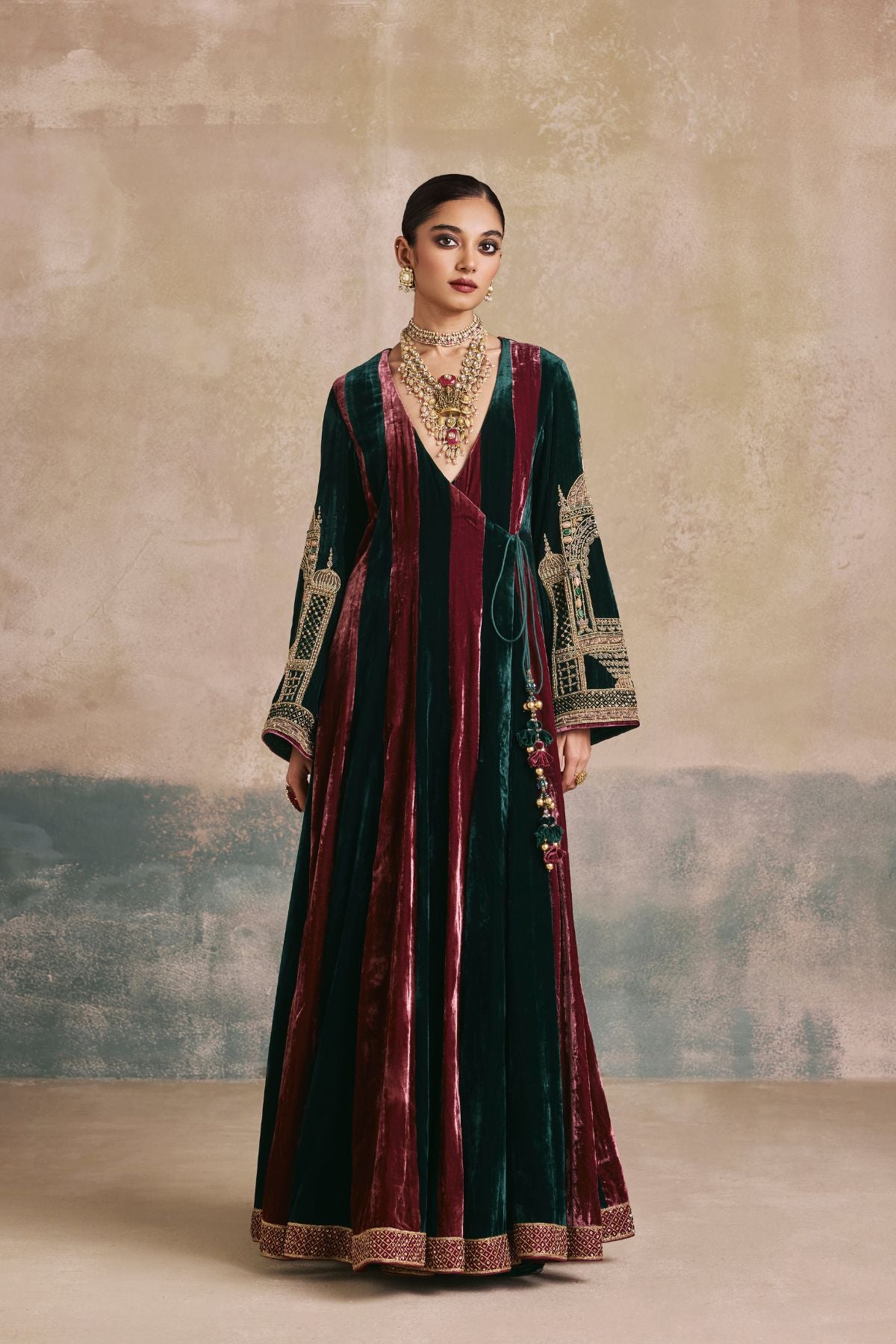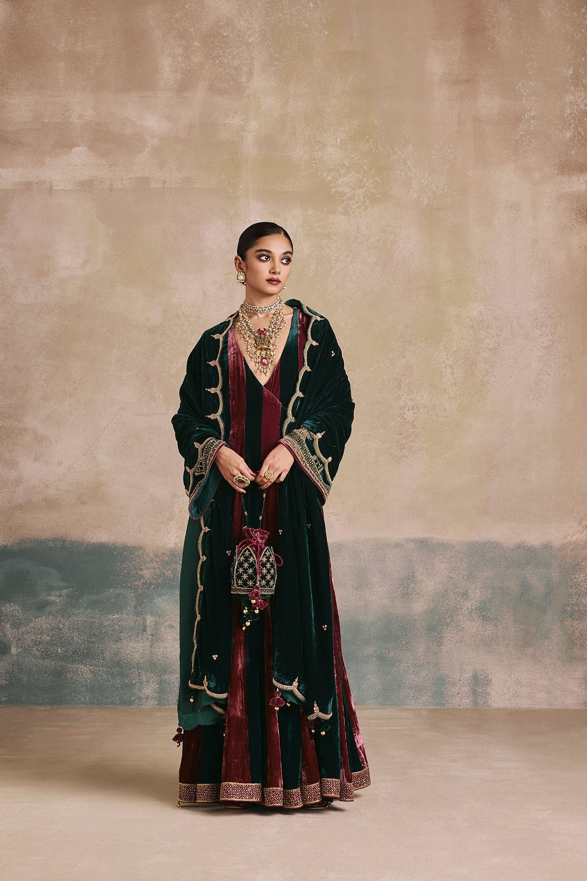 The Jahanara Anarkali Set reimagines luxury with its patched two-tone velvet in wine and bottle green. Flowing scalloped embroidery and antique heritage detailing make this angrakha silhouette an artistic treasure—crafted for generations to cherish.