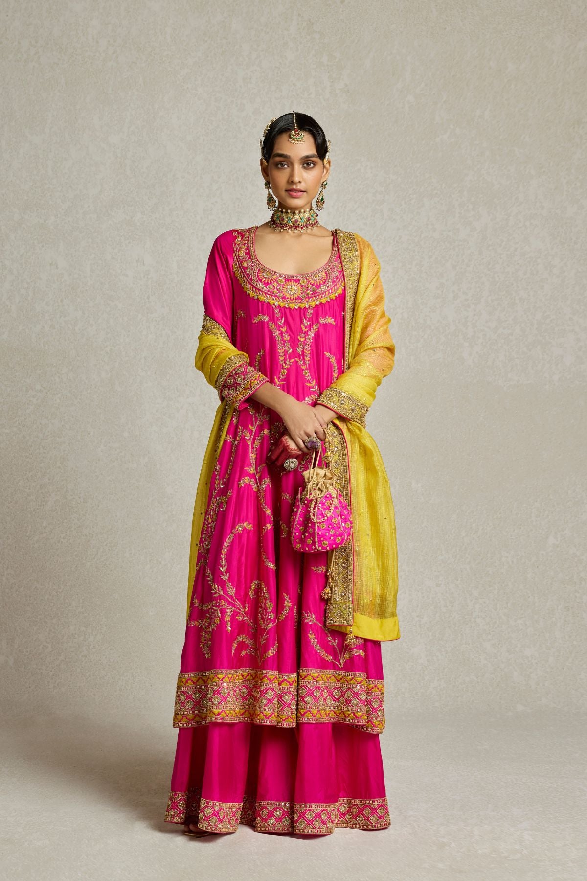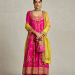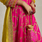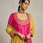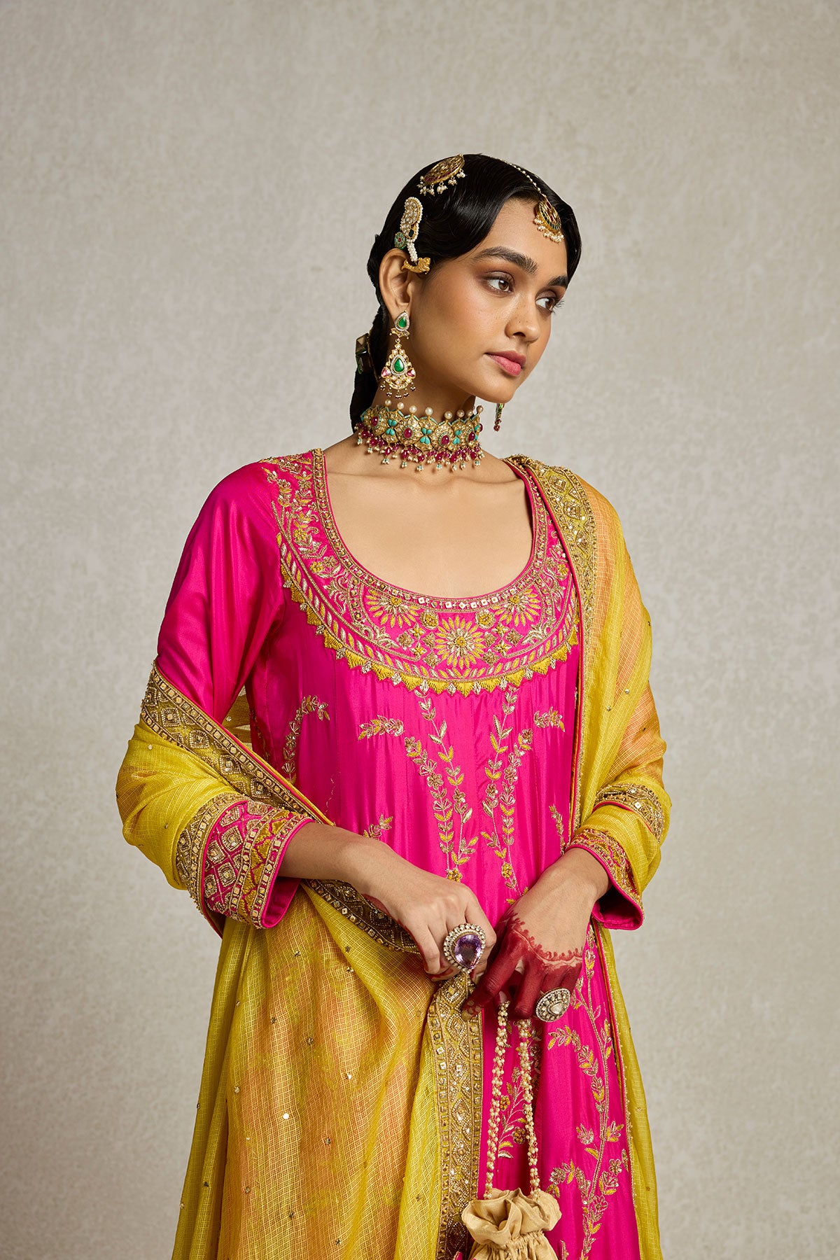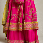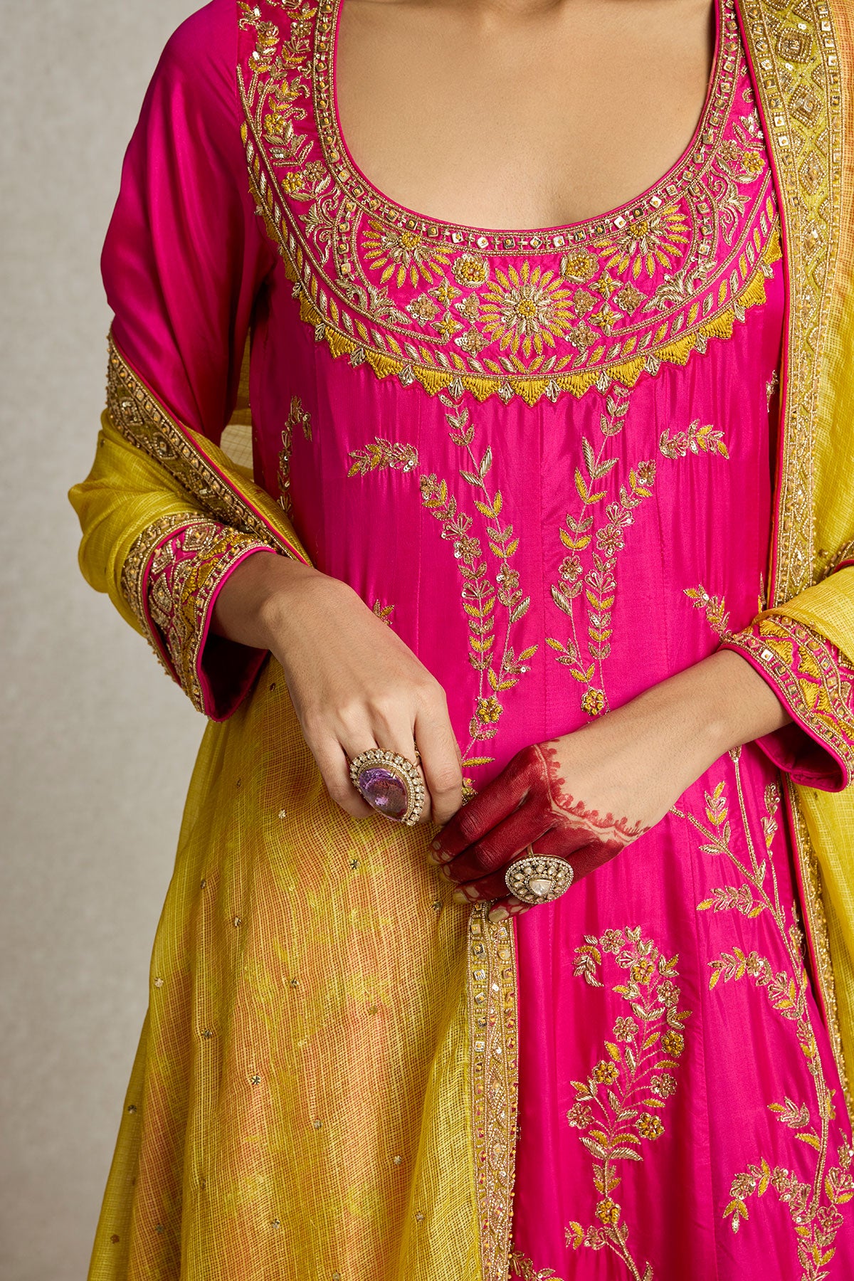 This radiant rani pink Anarkali paired with a sharara showcases a stunning combination of threadwork, zardozi, and aari hand embroidery. The contrast yellow silk doria dupatta adds the perfect pop of colour to this set that is handcrafted for head turns and heavy on yesteryear charm.