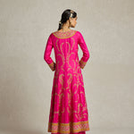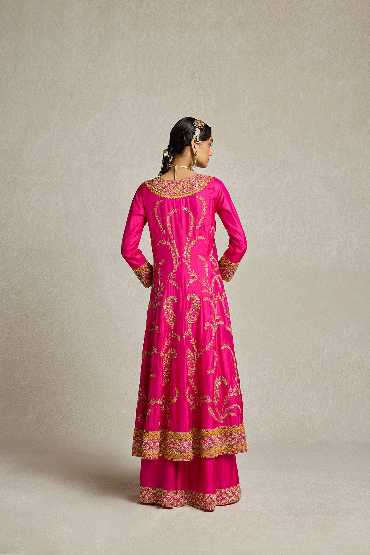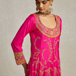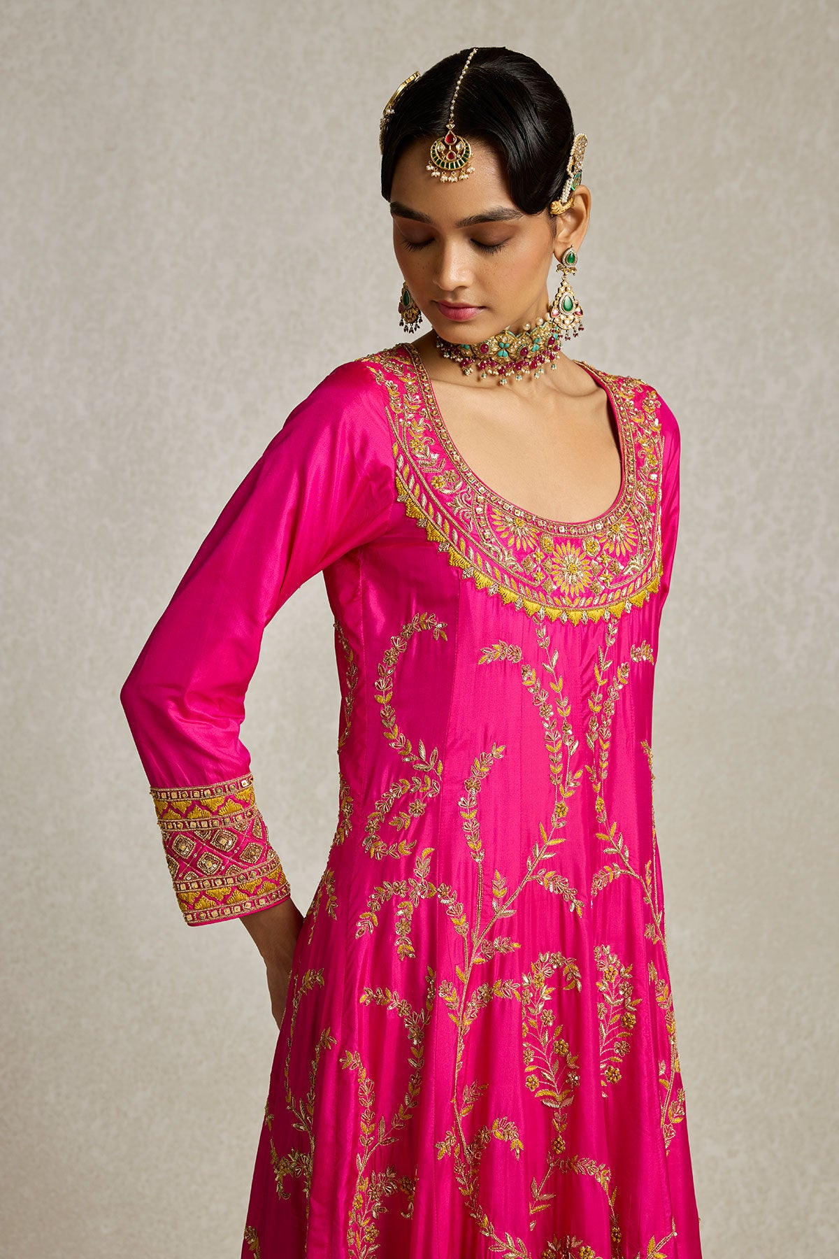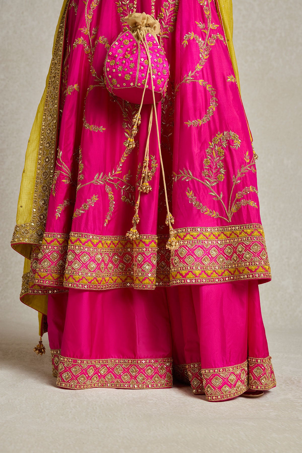 This radiant rani pink Anarkali paired with a sharara showcases a stunning combination of threadwork, zardozi, and aari hand embroidery. The contrast yellow silk doria dupatta adds the perfect pop of colour to this set that is handcrafted for head turns and heavy on yesteryear charm.