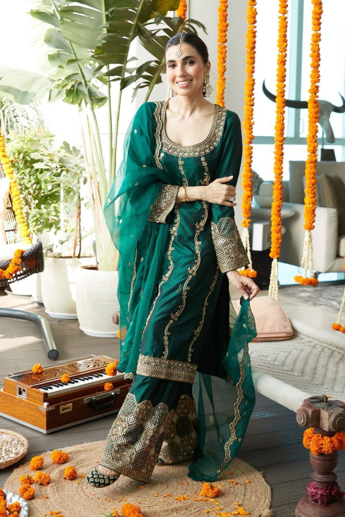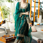 This pure silk kurta set in bottle green is the perfect blend of comfort and elegance. The intricate zardozi hand embroidery adorning the surface of the kurta and lounge pants adds a touch of timeless luxury to this otherwise simple silhouette. Complete the set with an intricately embroidered organza dupatta, or skip it for modern charm.
