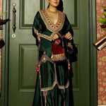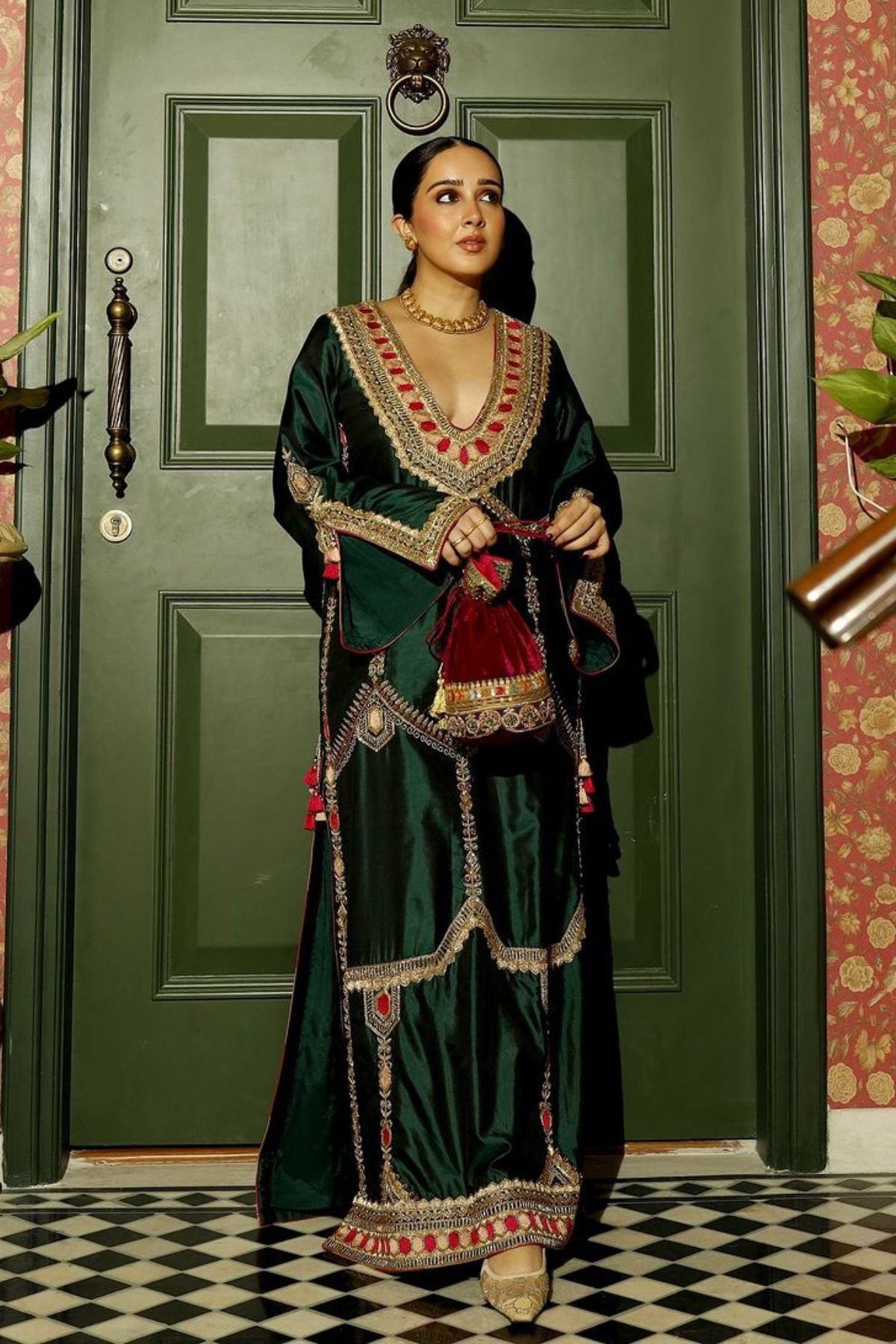 Opulent and luxurious, this bottle green silk kaftan is embellished with zardozi, resham, aari, and sitara hand embroidery. The beautifully detailed neckline and embroidered surface offer a touch of grandeur, making it an ideal choice for those who embrace comfort with a side of royalty.