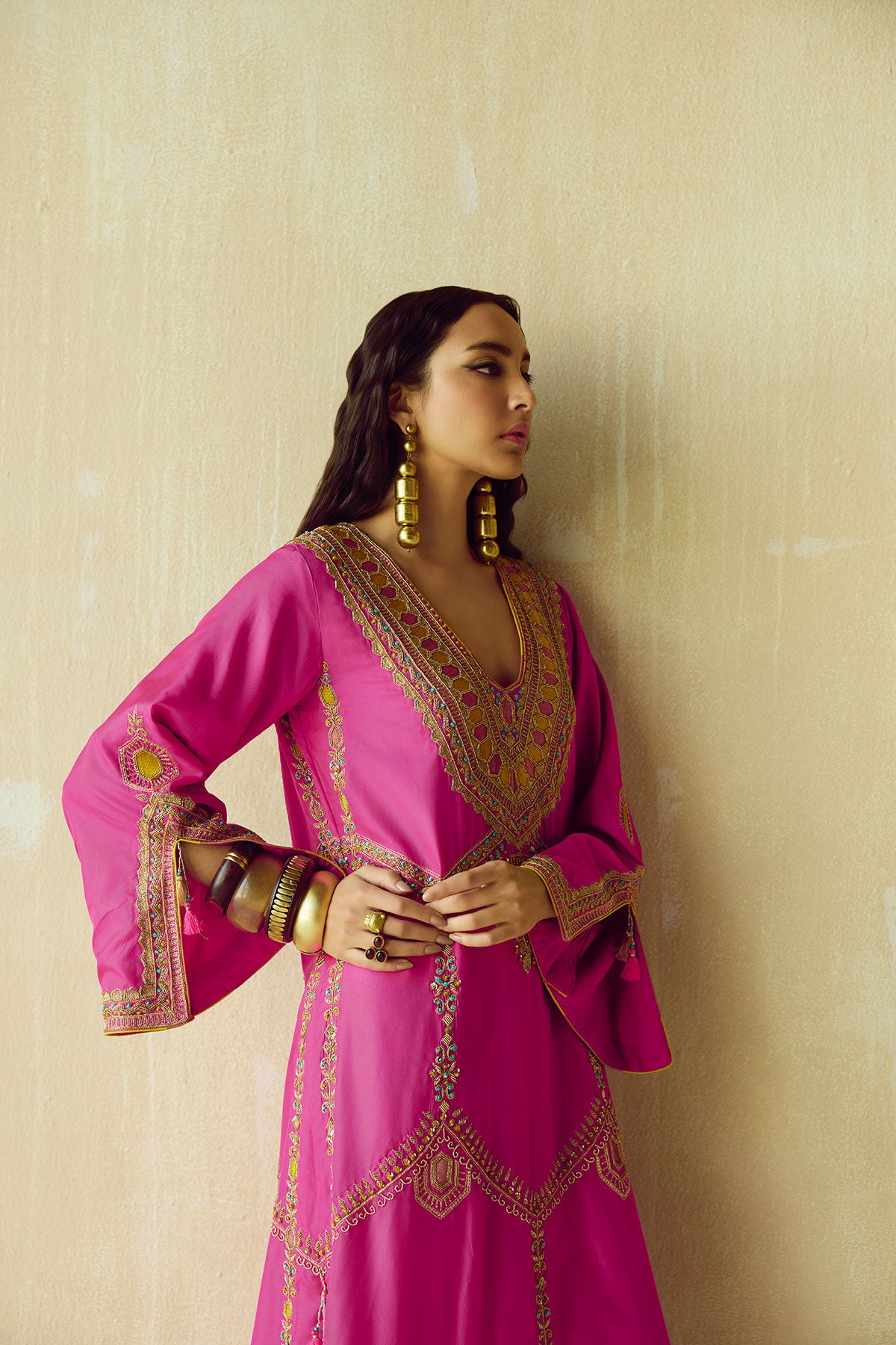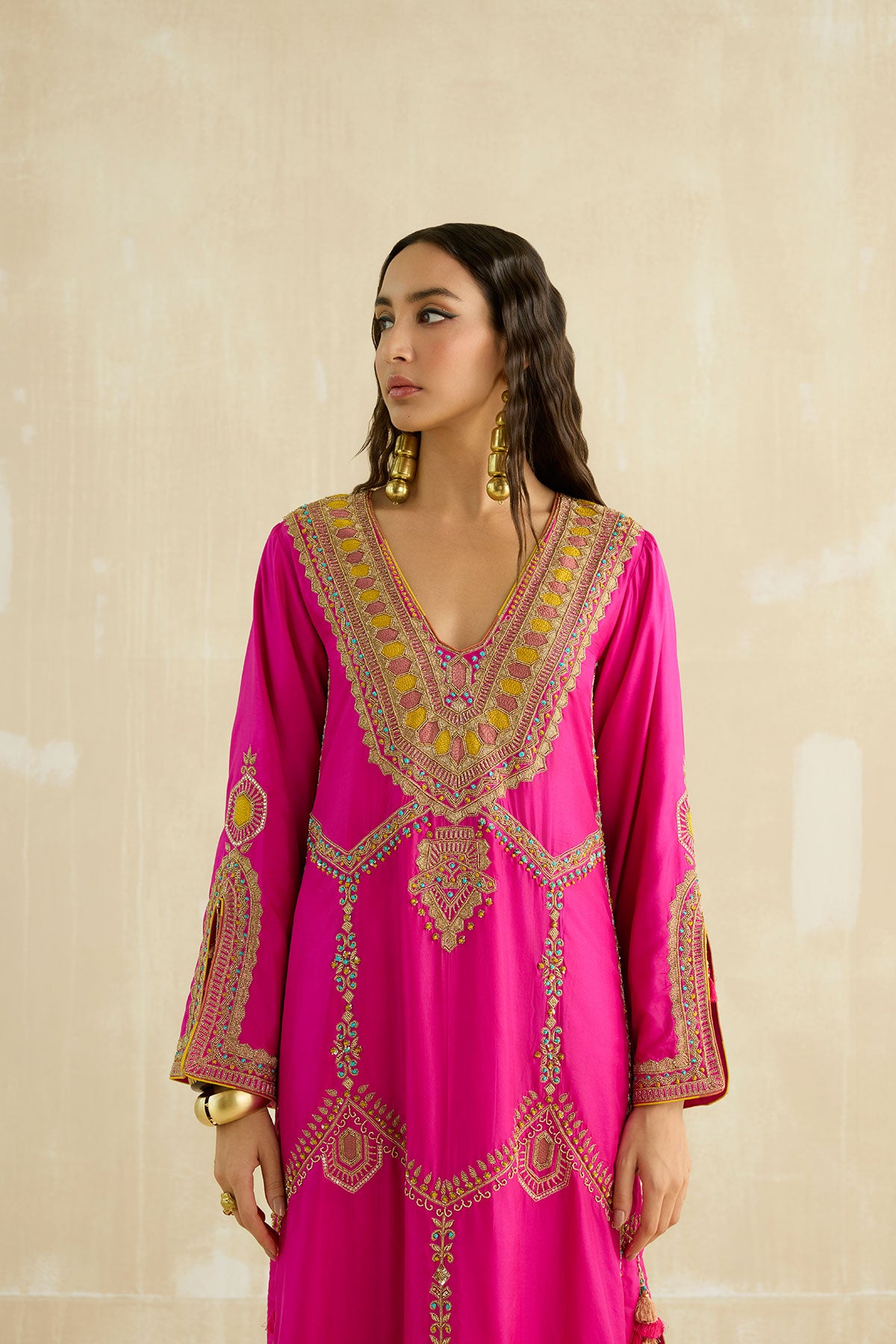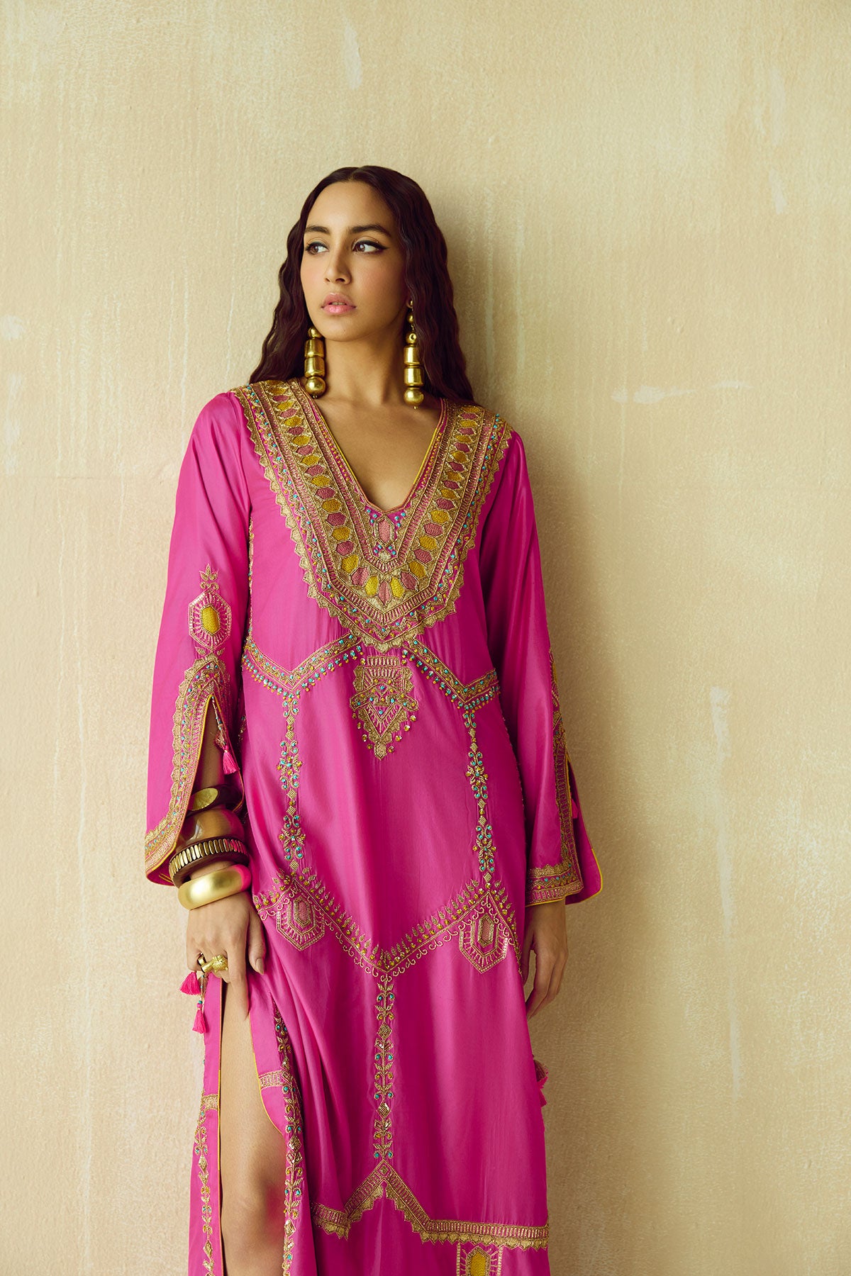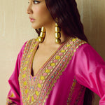Opulent and luxurious, this rani pink silk kaftan is embellished with zardozi, resham, aari, and sitara hand embroidery. The beautifully detailed neckline and embroidered surface offer a touch of grandeur, making it an ideal choice for those who embrace comfort with a side of royalty.