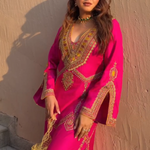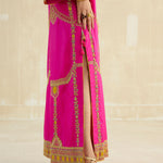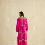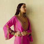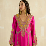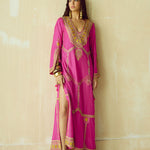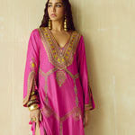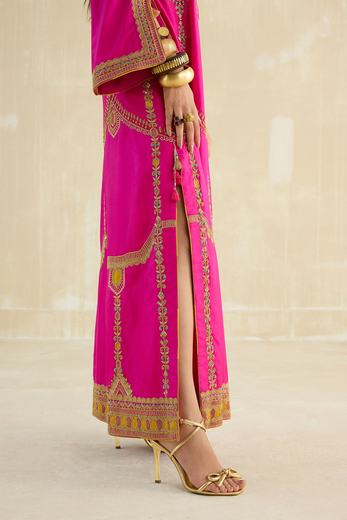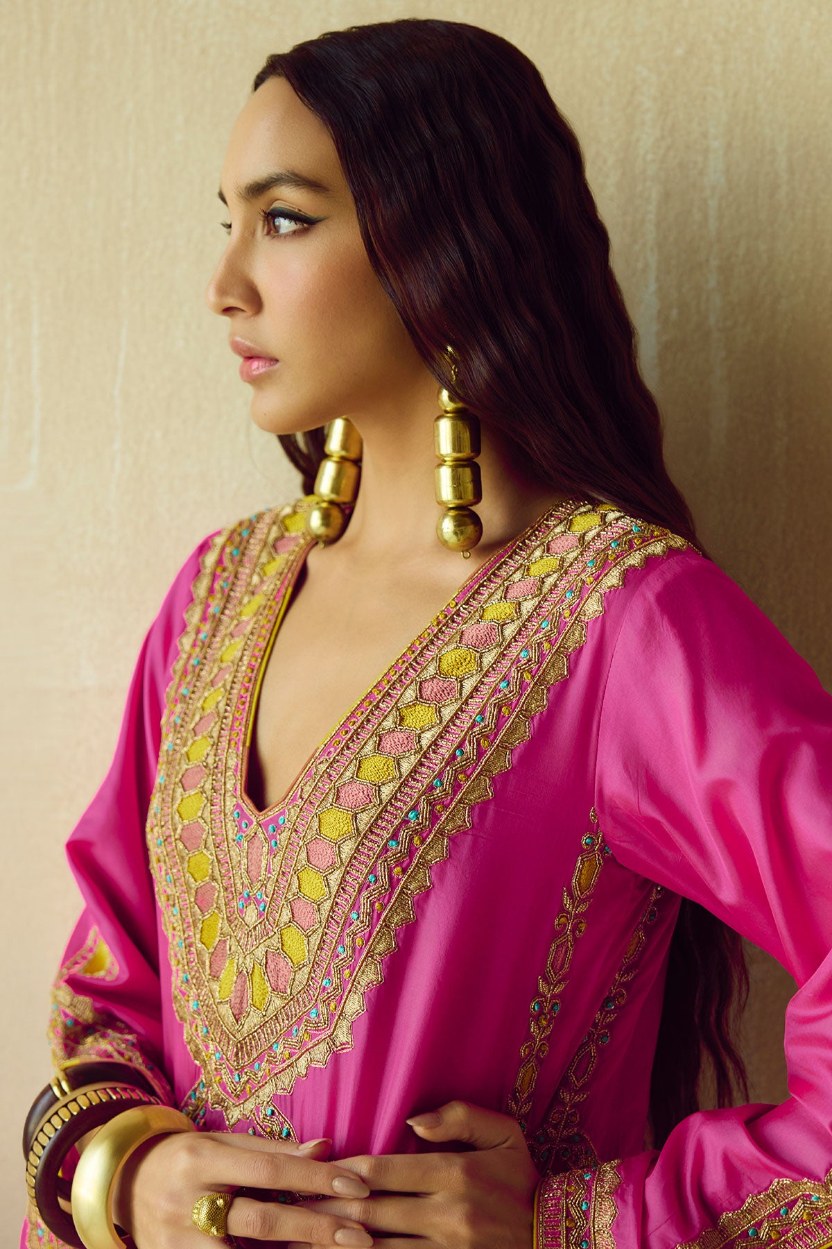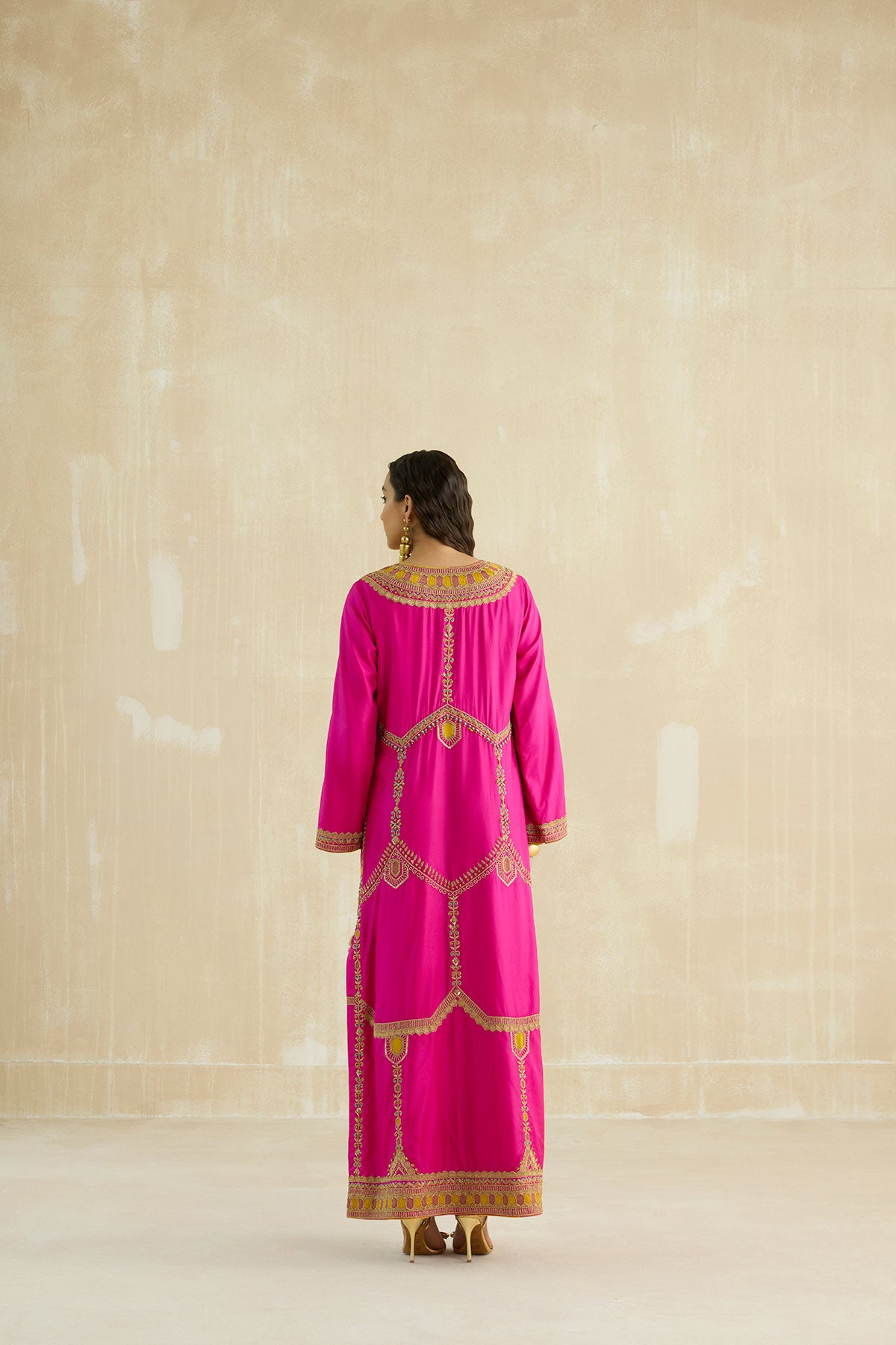 Opulent and luxurious, this rani pink silk kaftan is embellished with zardozi, resham, aari, and sitara hand embroidery. The beautifully detailed neckline and embroidered surface offer a touch of grandeur, making it an ideal choice for those who embrace comfort with a side of royalty.