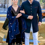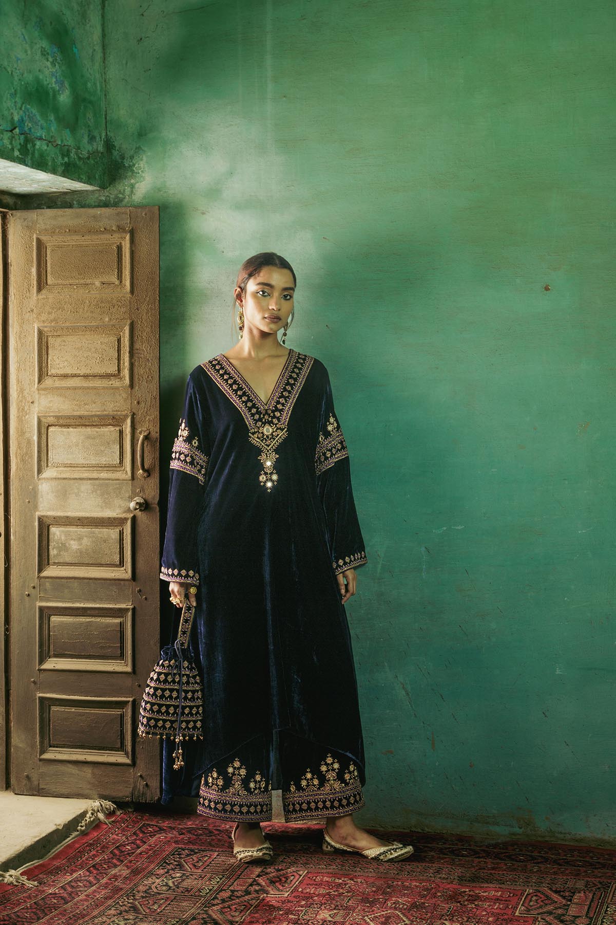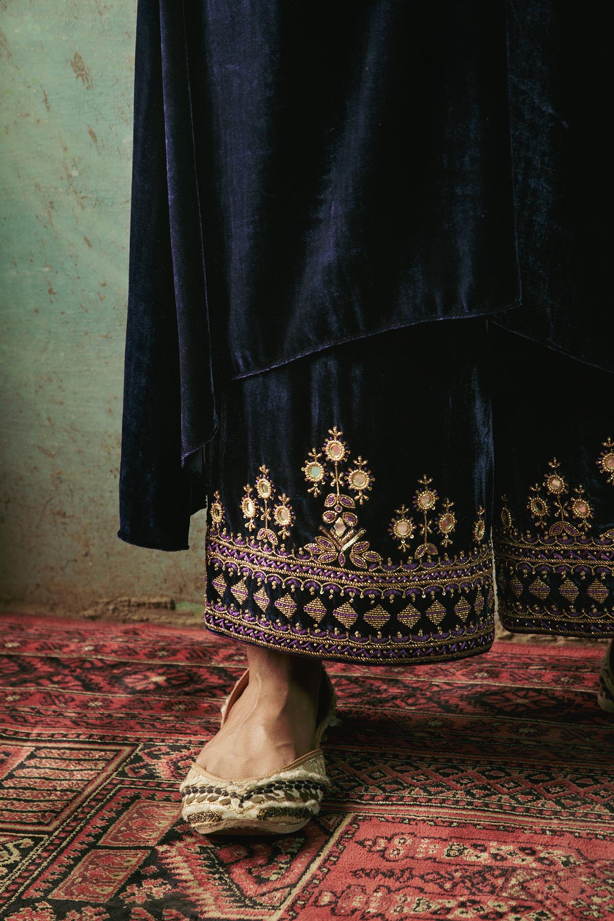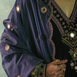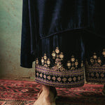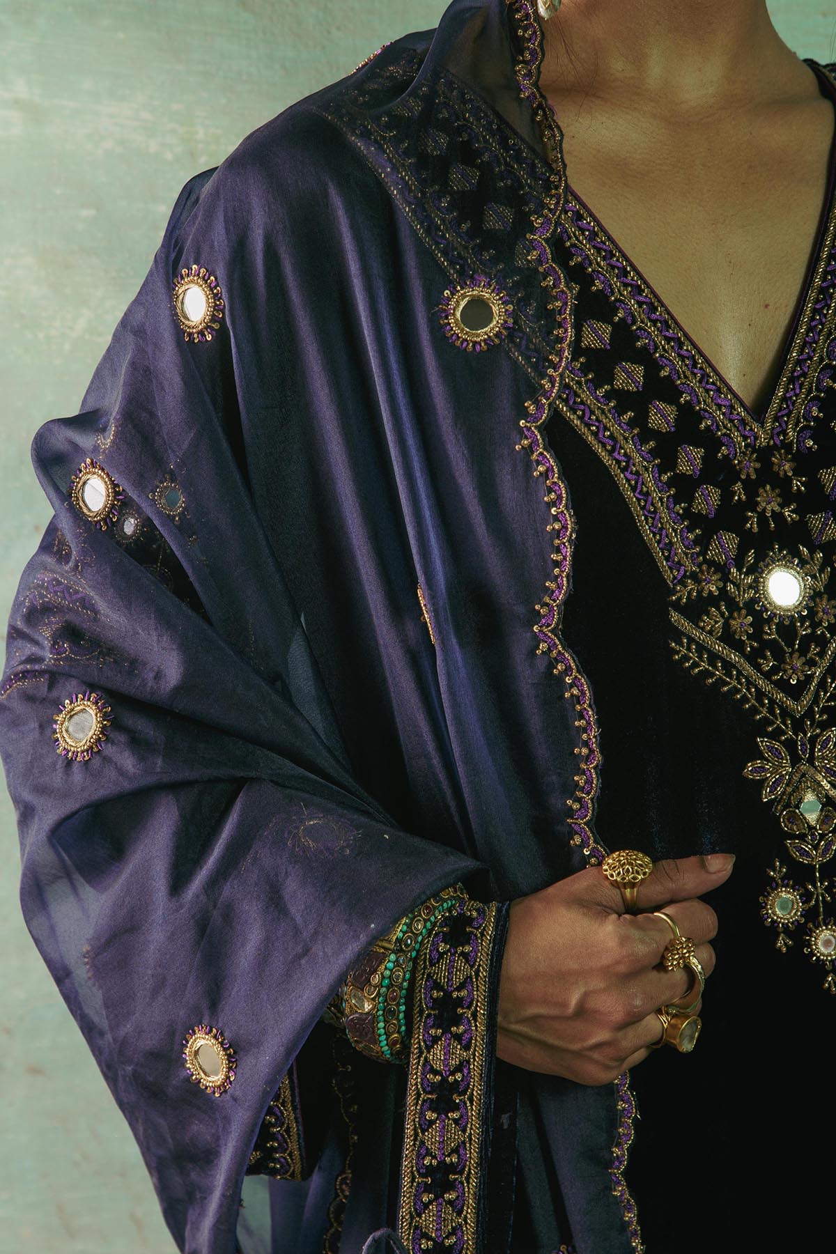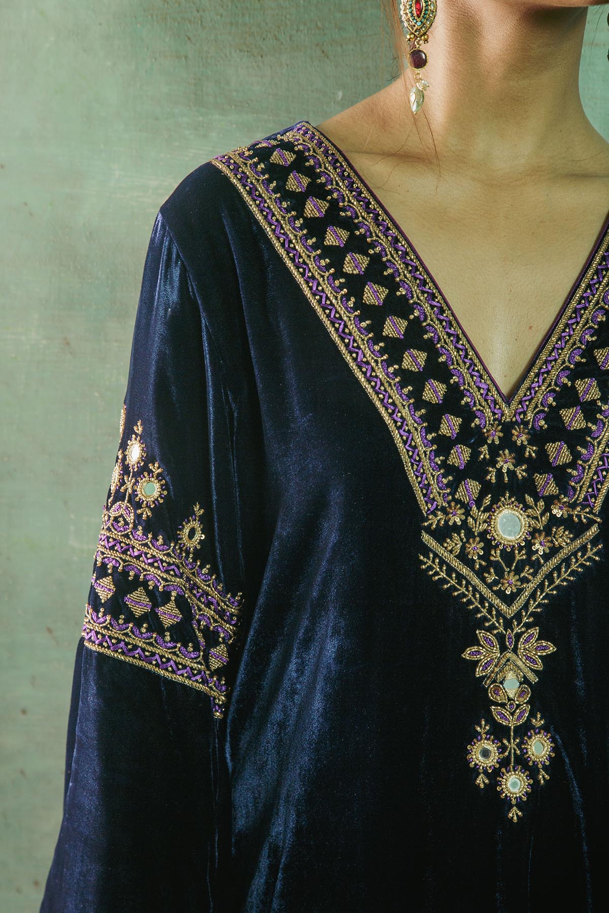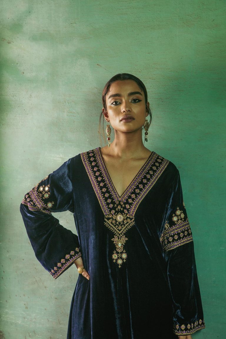 Something old, something new — this asymmetrical silk velvet kurta with a plunging neckline is traditional yet modern. The silhouette is its standout feature. The drama has been reserved for the flared sleeves accentuated with aari and zardozi thread, mirror, sitara, bead and cutdana work. Add the contrast scalloped dupatta with round mirror motifs for a traditional look or skip it for modern charm.