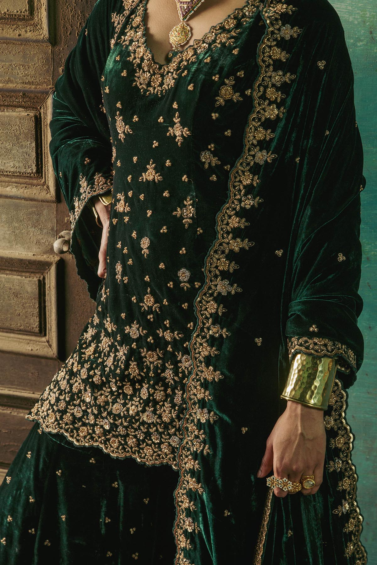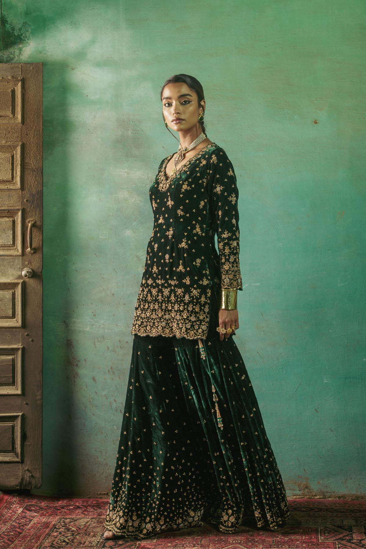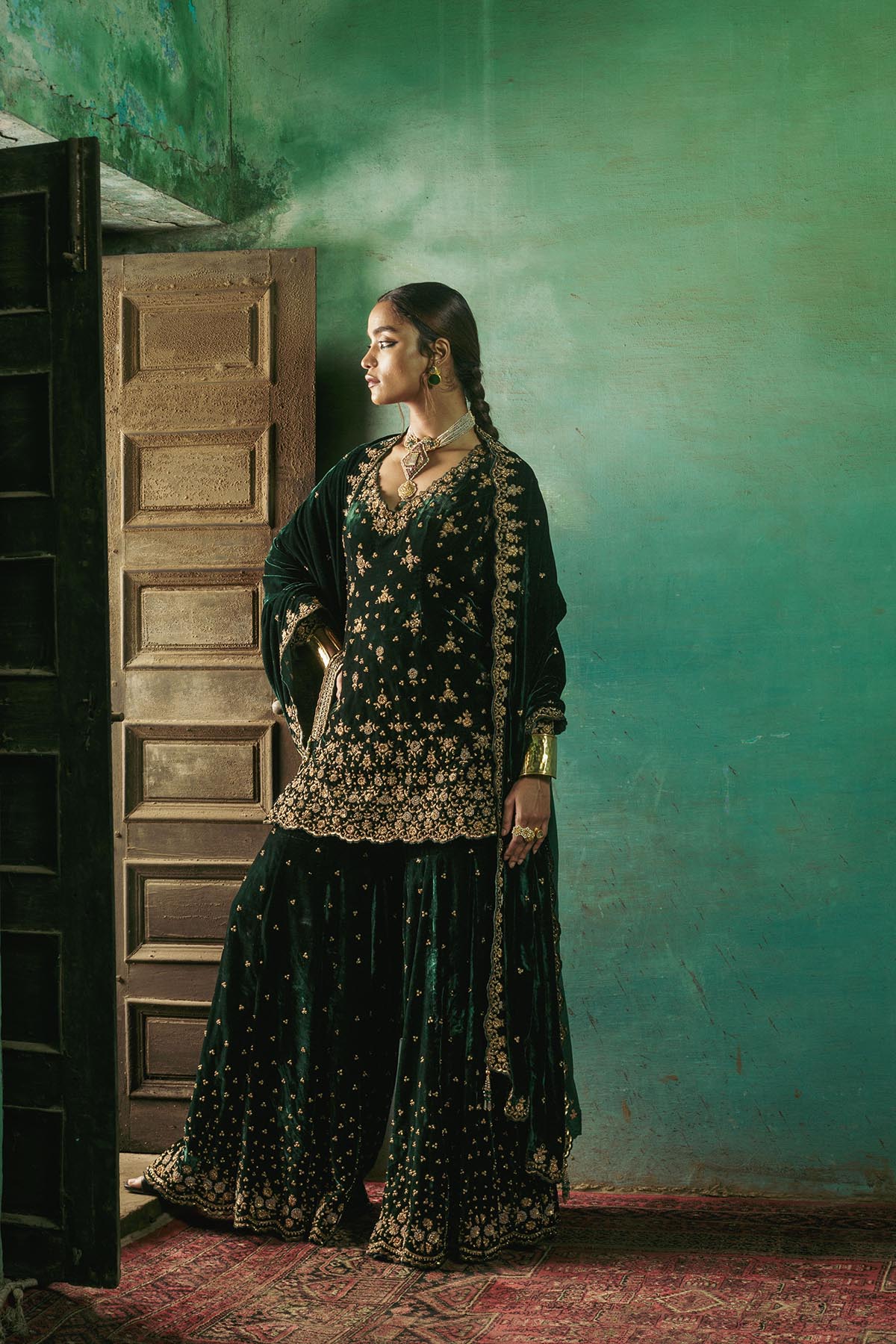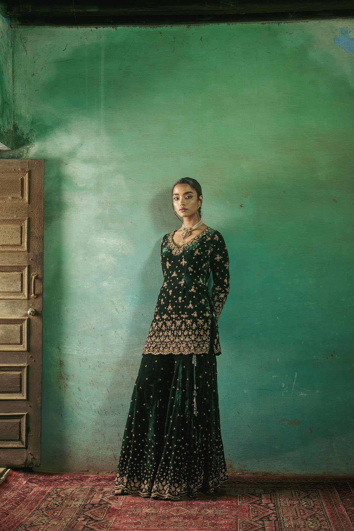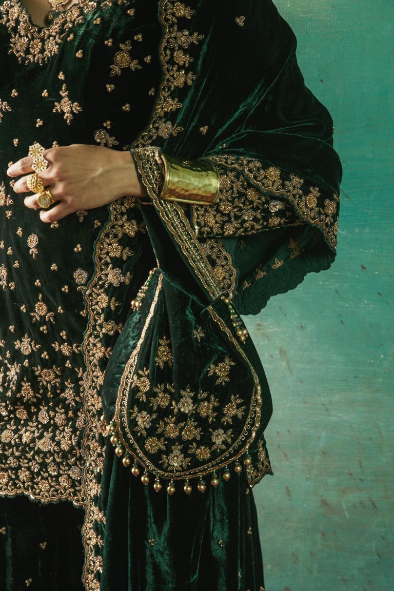 A velvet masterpiece — the perfectly embellished fitted short kurta is paired with a voluminous bottle green gharara. A mix of aari and zardozi antique threadwork, along with heavy sitara and cutdana embellishment, adds a sophisticated touch of bling to this night-time look.