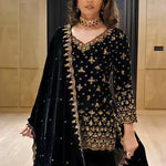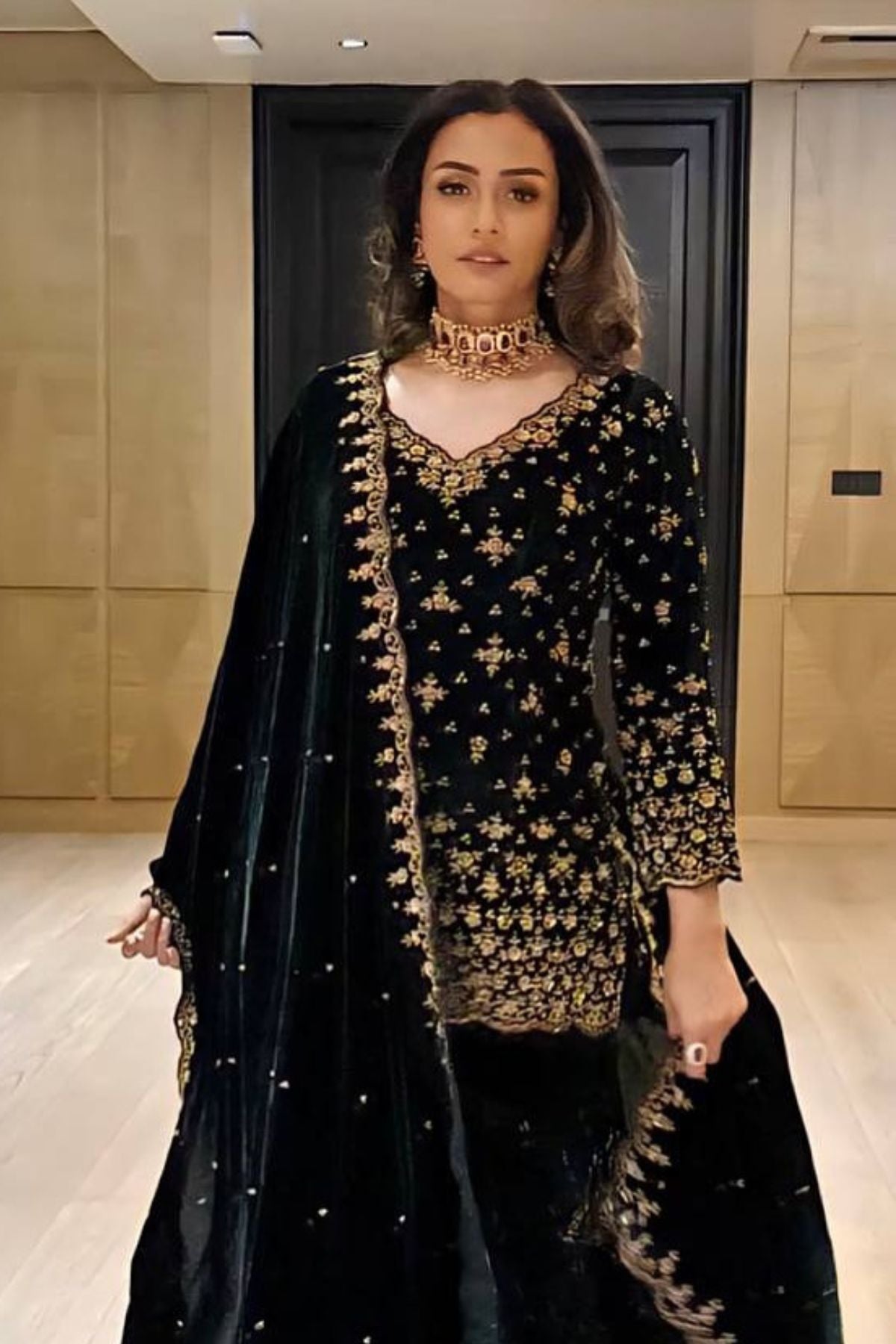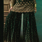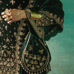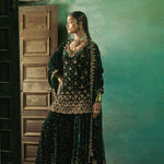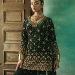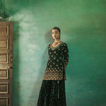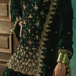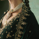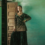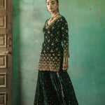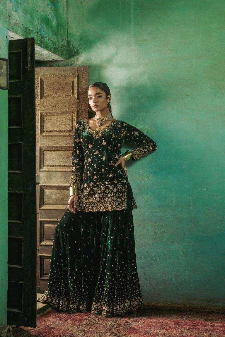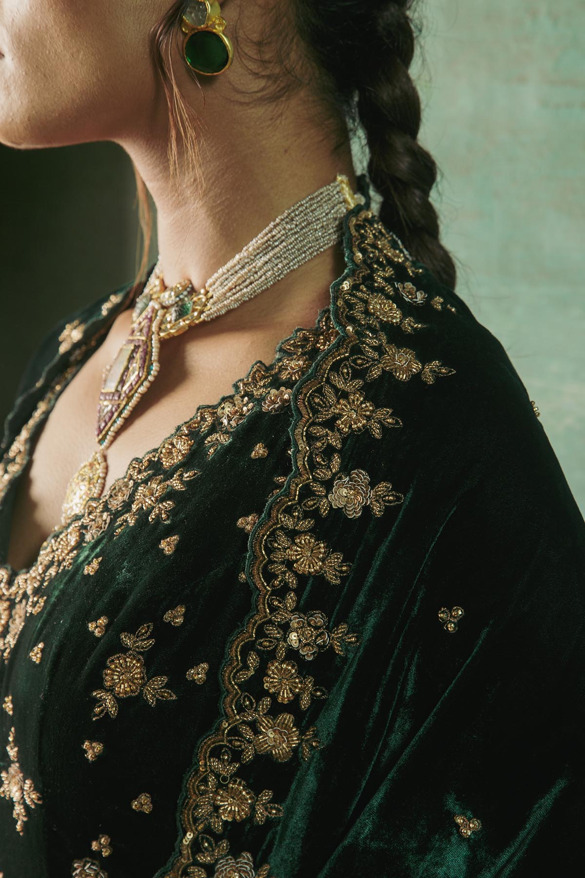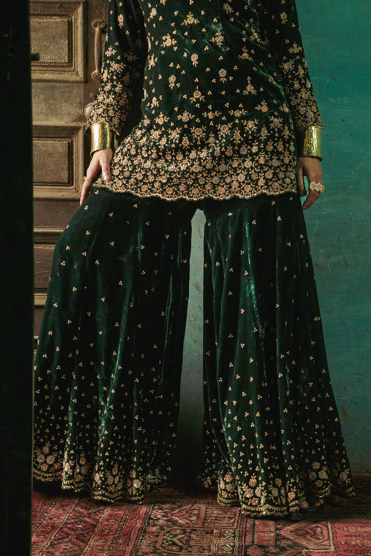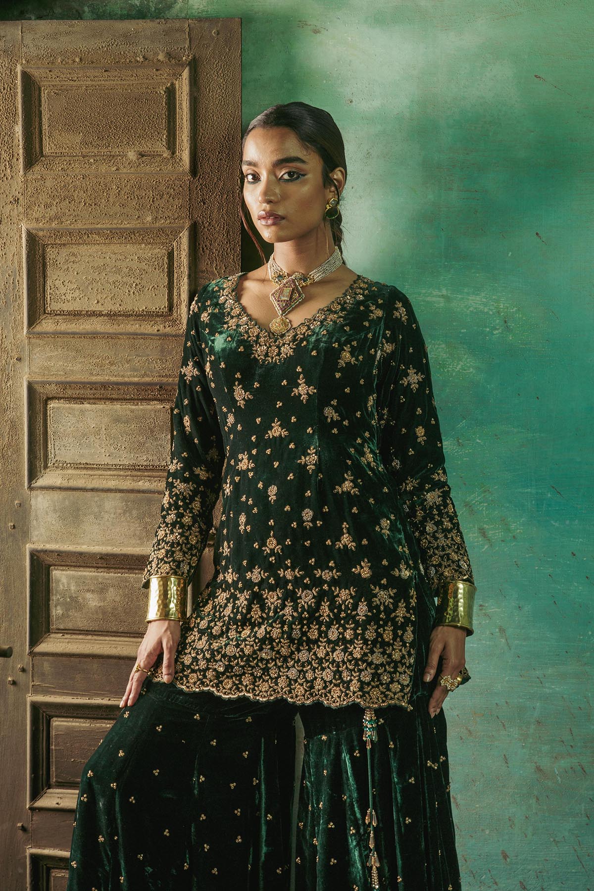 A velvet masterpiece — the perfectly embellished fitted short kurta is paired with a voluminous bottle green gharara. A mix of aari and zardozi antique threadwork, along with heavy sitara and cutdana embellishment, adds a sophisticated touch of bling to this night-time look.
