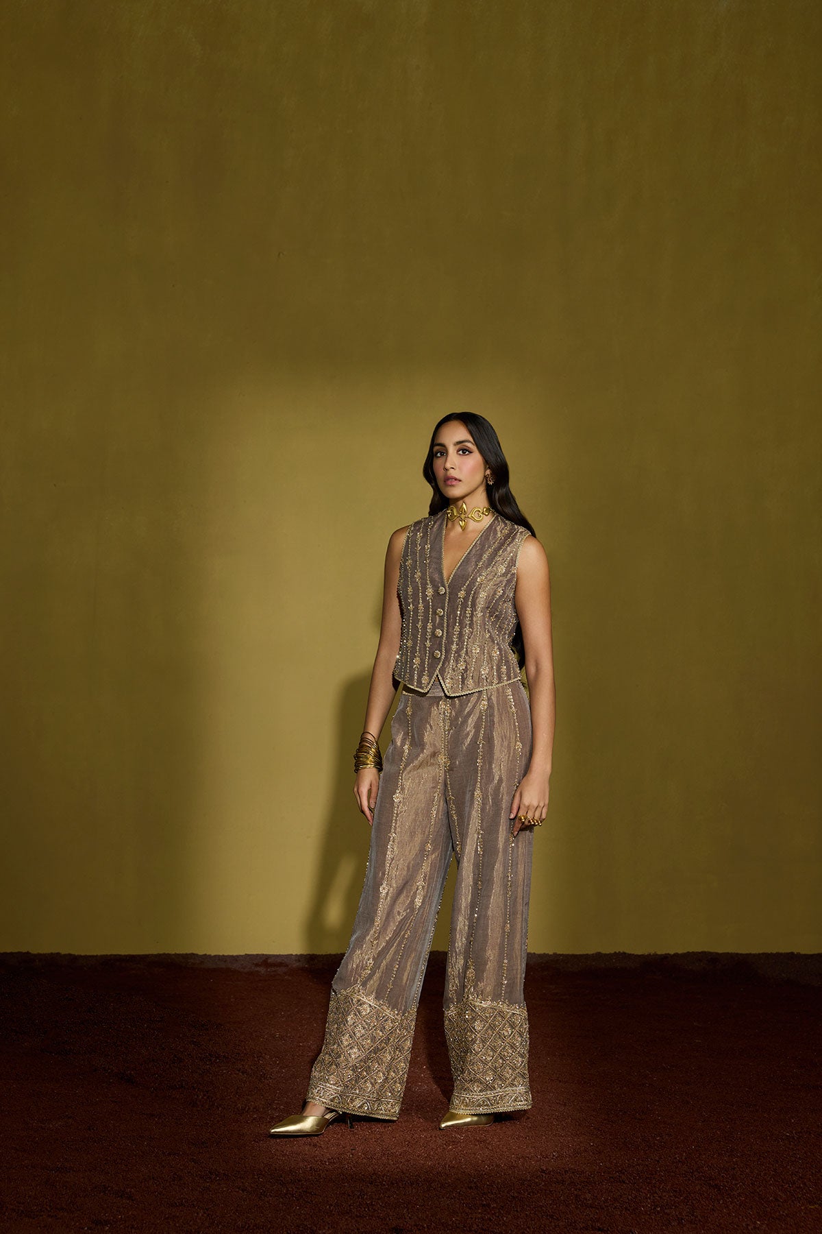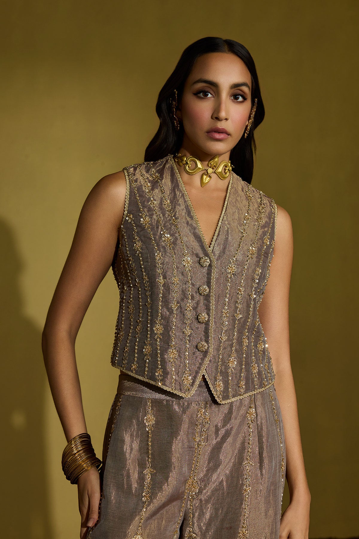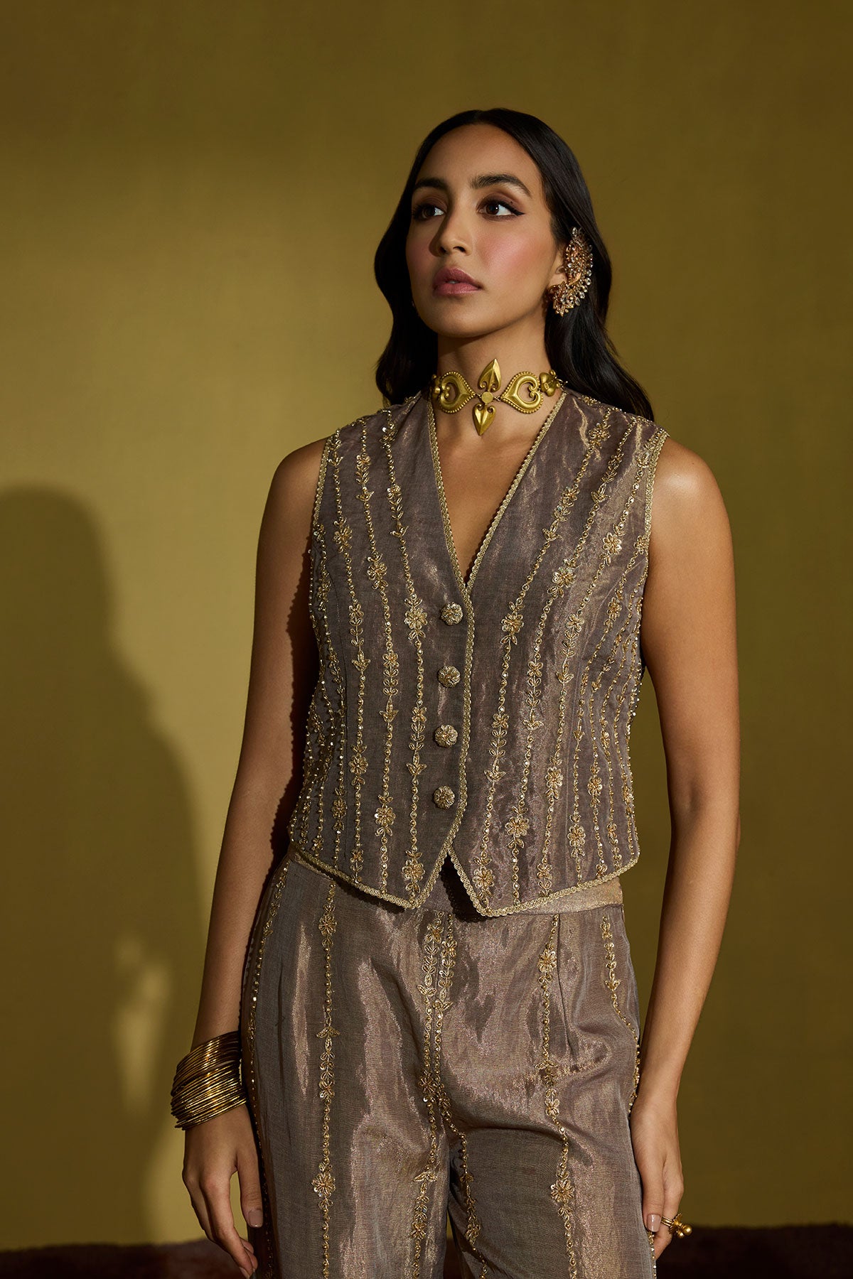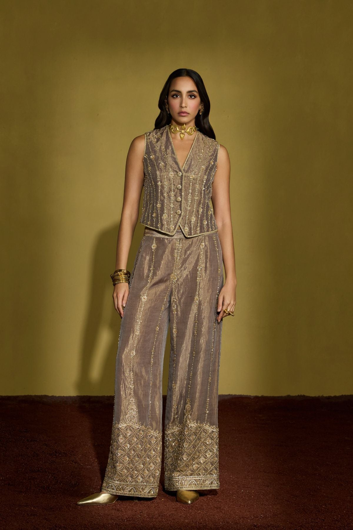 This wine pant set, anchored by a sharply tailored waistcoat, creates a quiet dialogue between heritage and modernity.Embroidered with kiran dori and gota, it distills time-honored Indian craftsmanship into a silhouette made for the present.