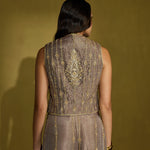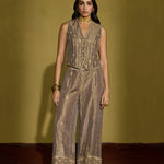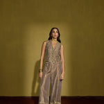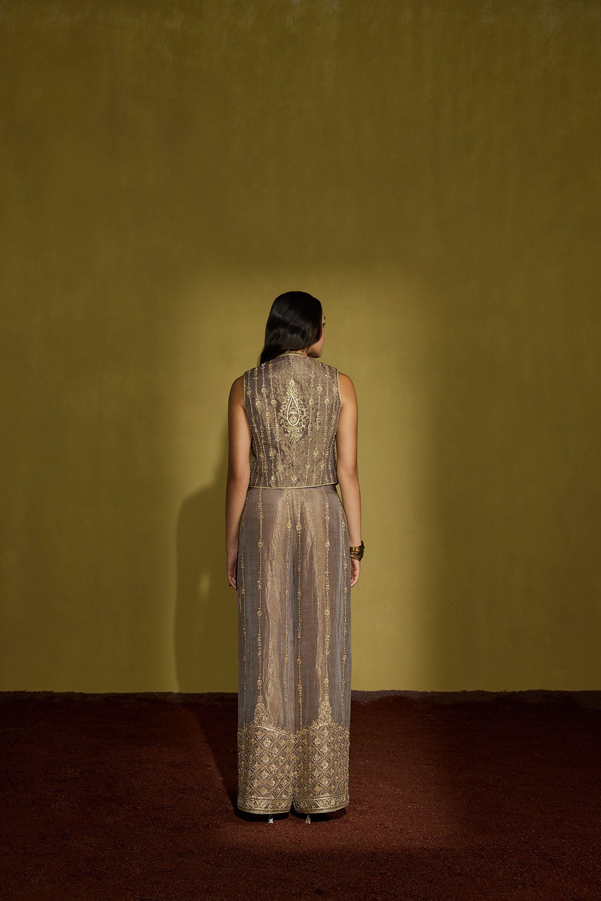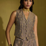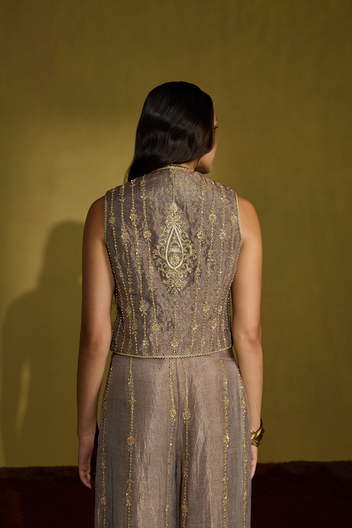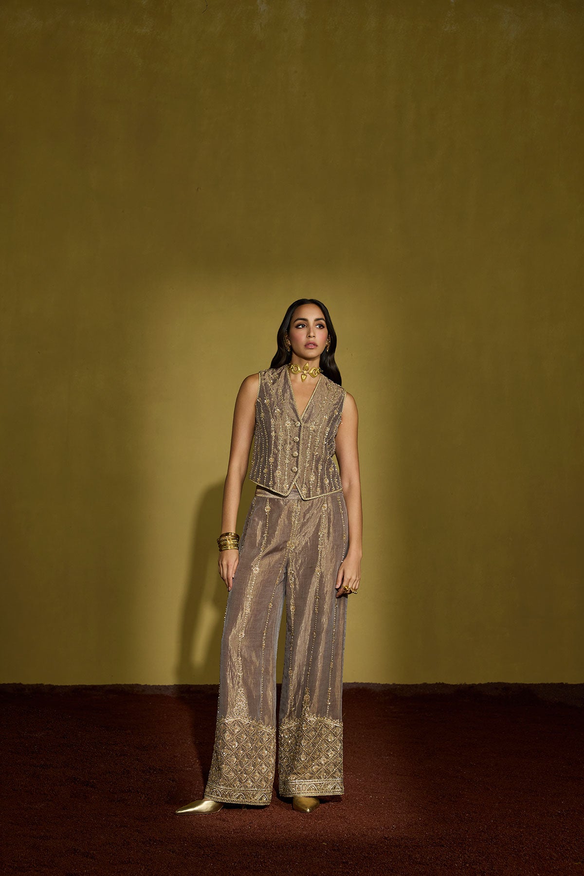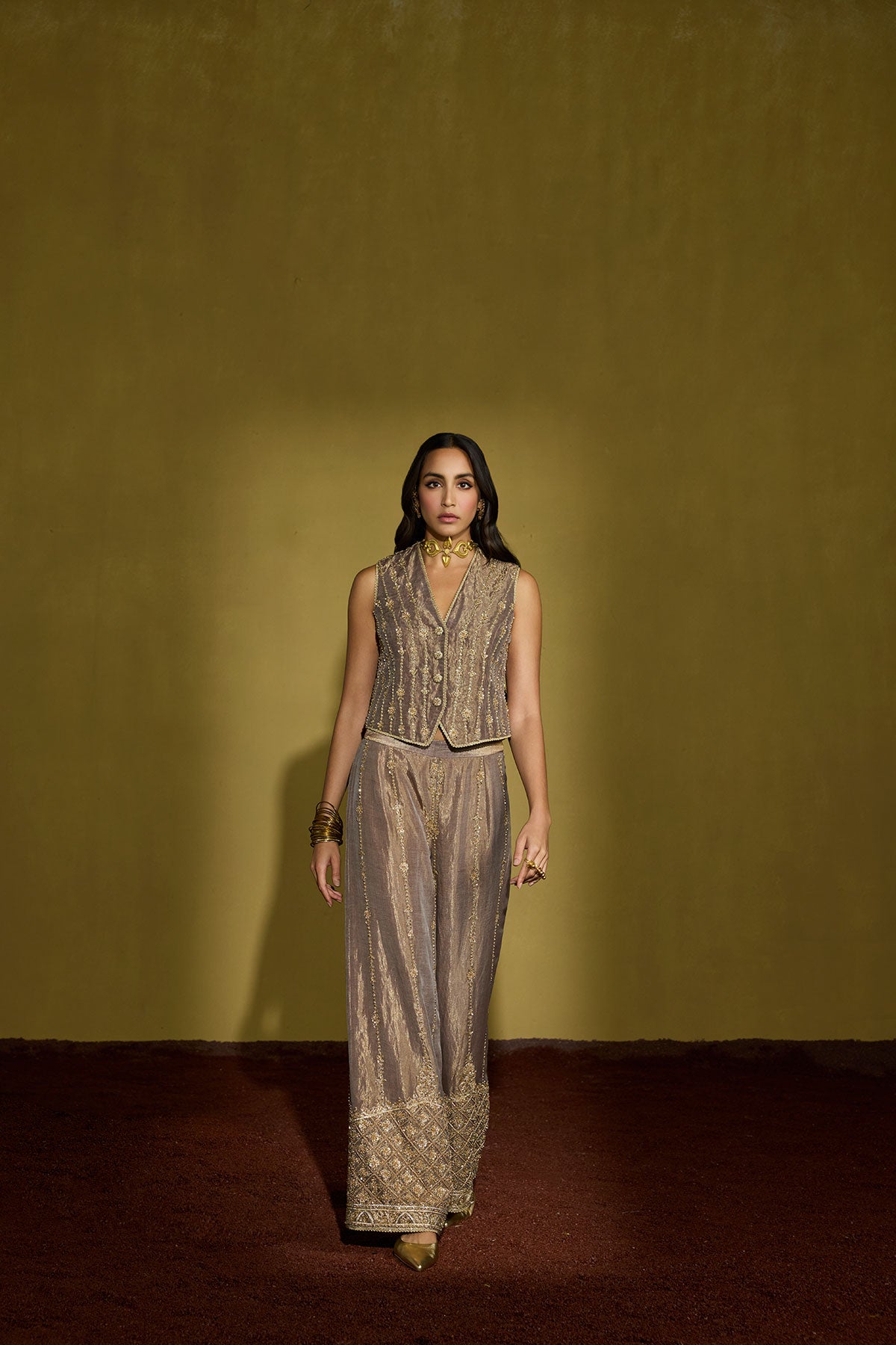 This wine pant set, anchored by a sharply tailored waistcoat, creates a quiet dialogue between heritage and modernity.Embroidered with kiran dori and gota, it distills time-honored Indian craftsmanship into a silhouette made for the present.