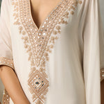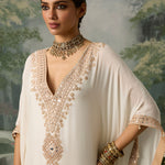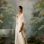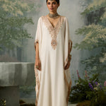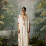 Pure Muslin falls effortlessly from shoulder to ankle in this floor-skimming kaftan, featuring a plunging neckline and contrast embroidery panels along the sides. The intricately embroidered yoke adds a touch of festivity—subtle, striking, and designed to go the extra mile.