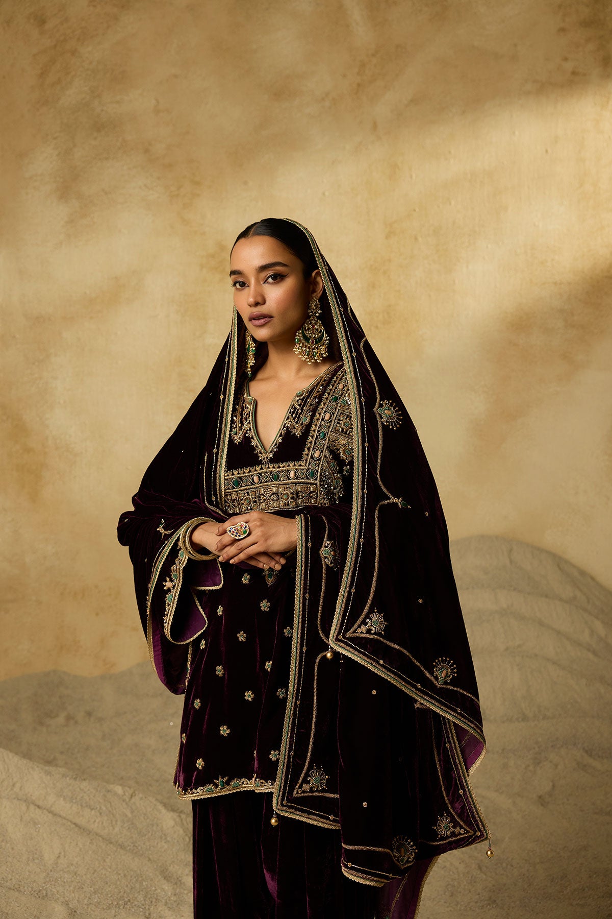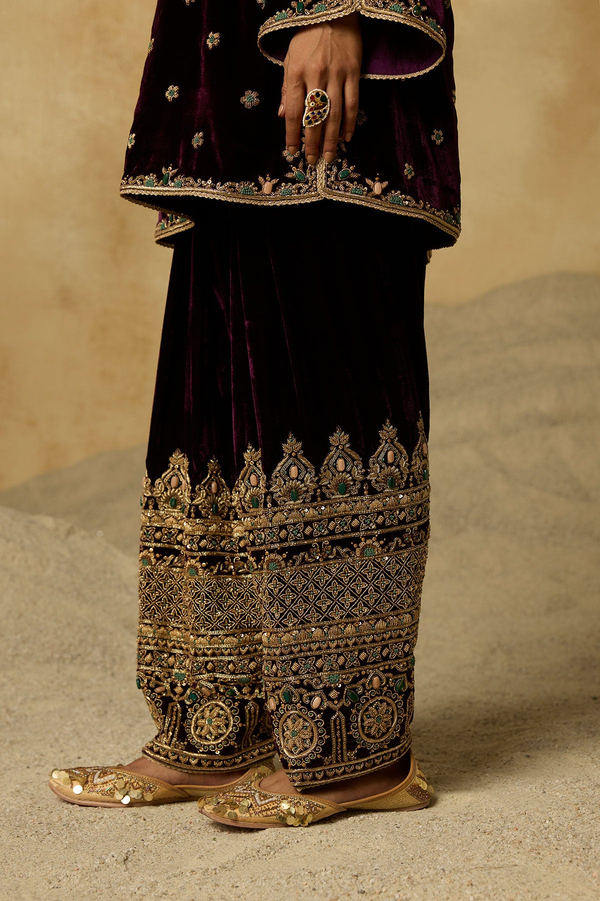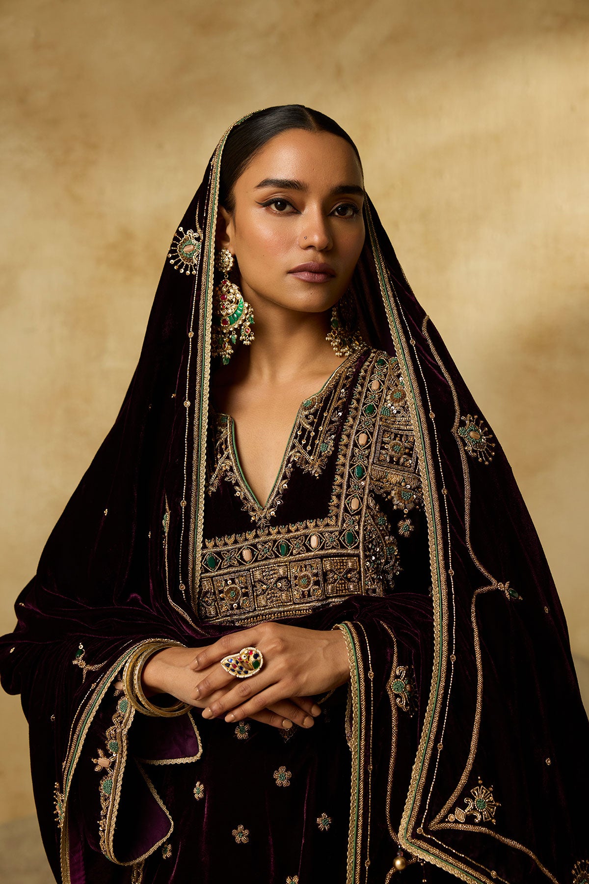 Maximalism at its finest: this deep jamuni ensemble features a signature Mughal neckline with intricate handwork, while the salwar takes center stage with zardozi, aari, gemstones, sequins, cut dana, and dabka in full flourish. Completed with a matching tone-on-tone velvet dupatta, it transforms the traditional salwar into a statement-making masterpiece.