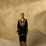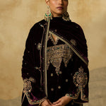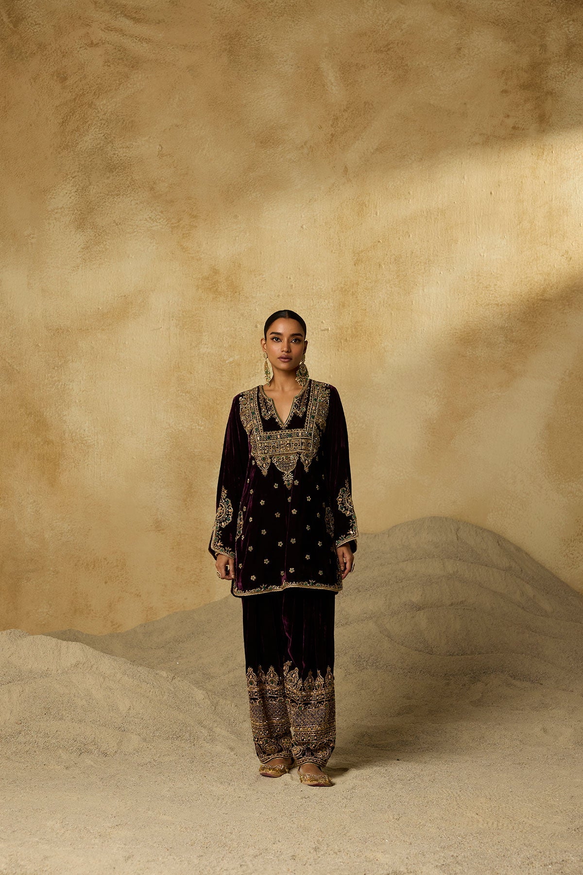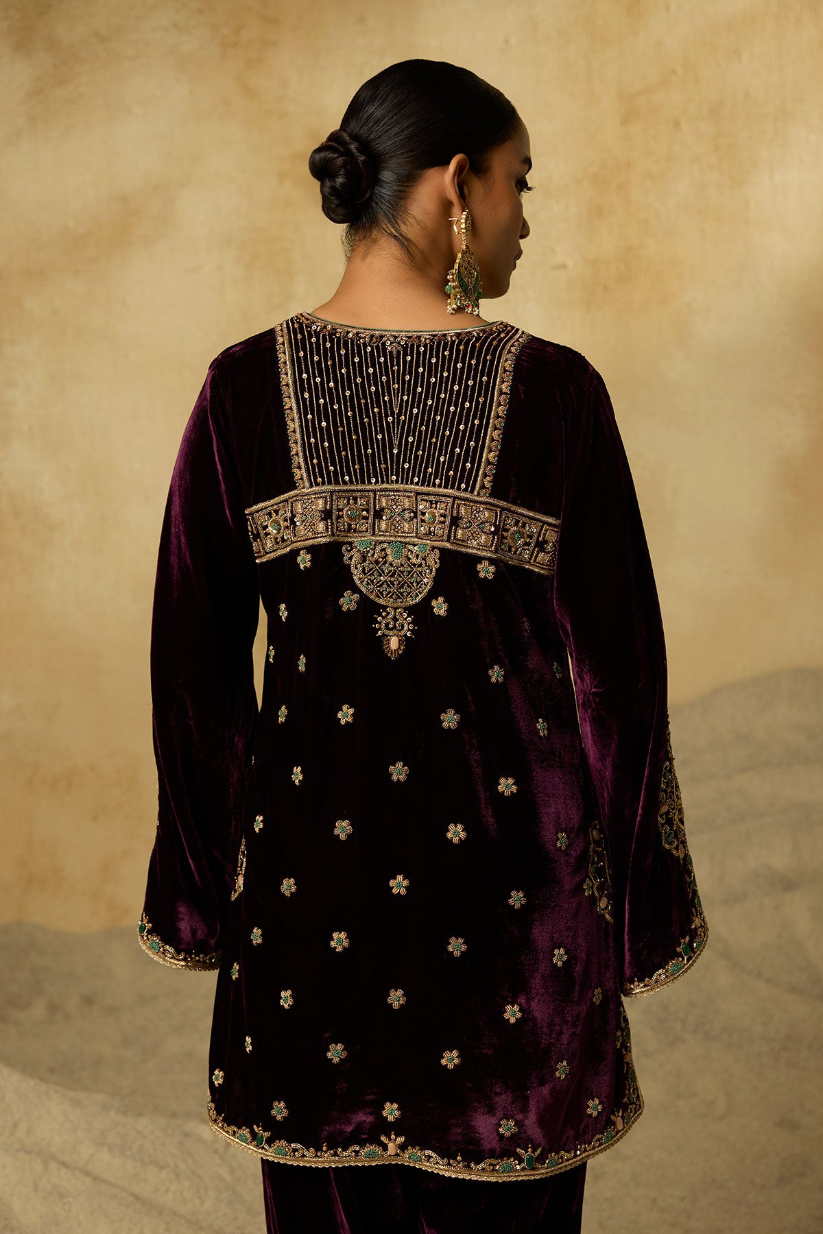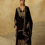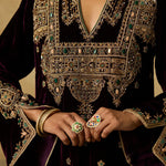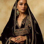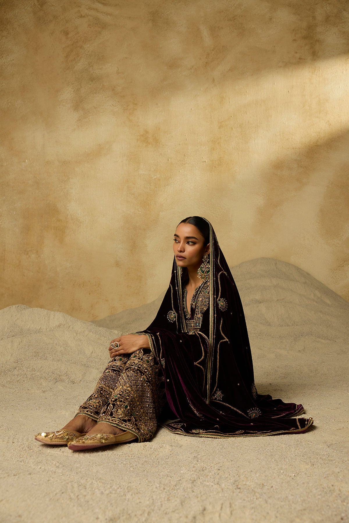 Maximalism at its finest: this deep jamuni ensemble features a signature Mughal neckline with intricate handwork, while the salwar takes center stage with zardozi, aari, gemstones, sequins, cut dana, and dabka in full flourish. Completed with a matching tone-on-tone velvet dupatta, it transforms the traditional salwar into a statement-making masterpiece.
